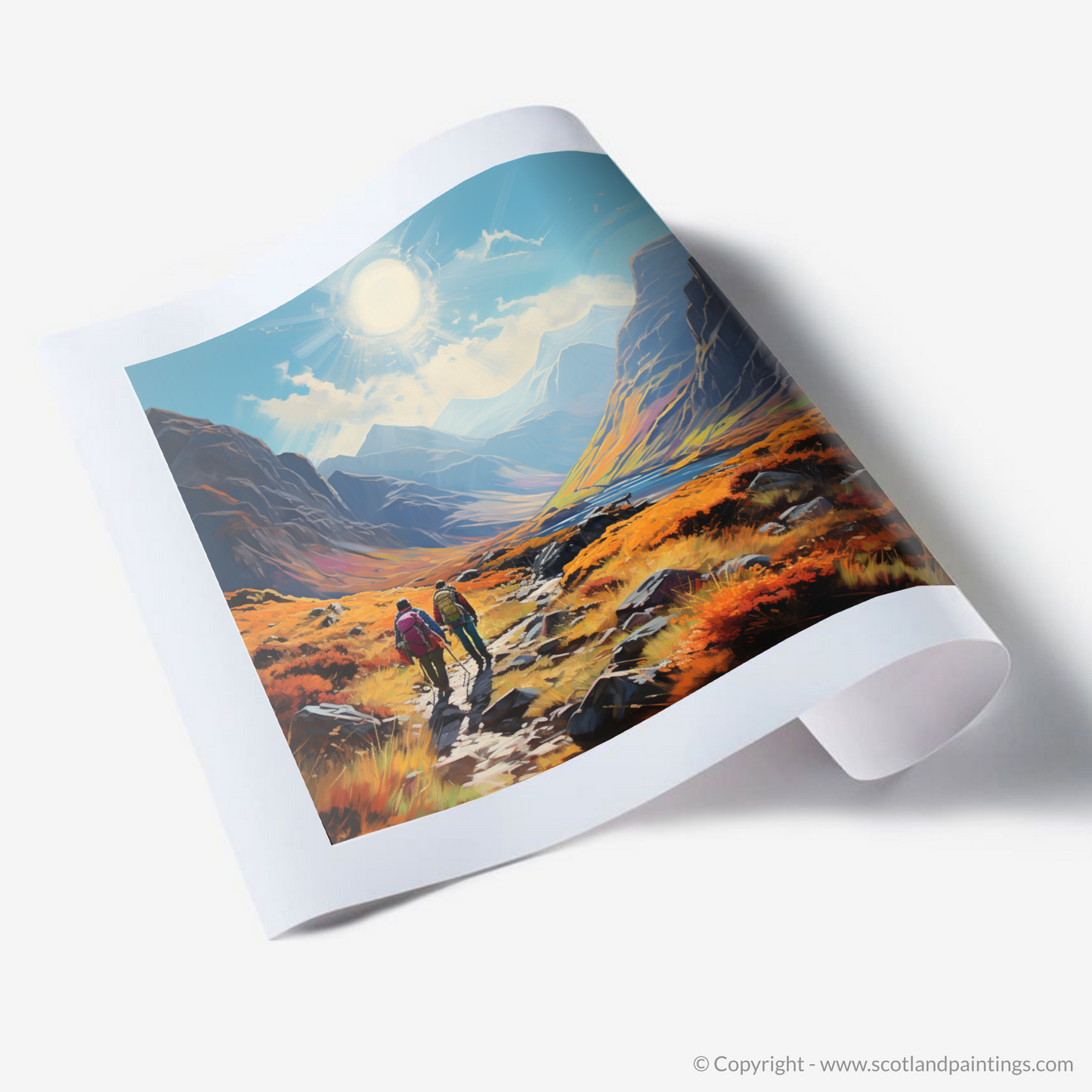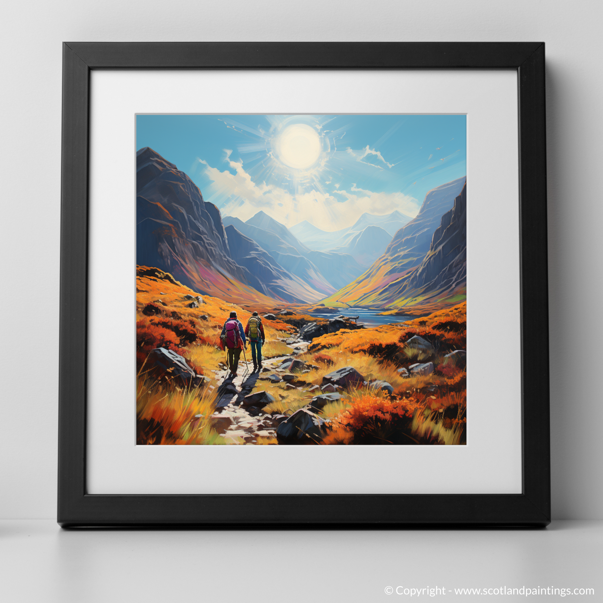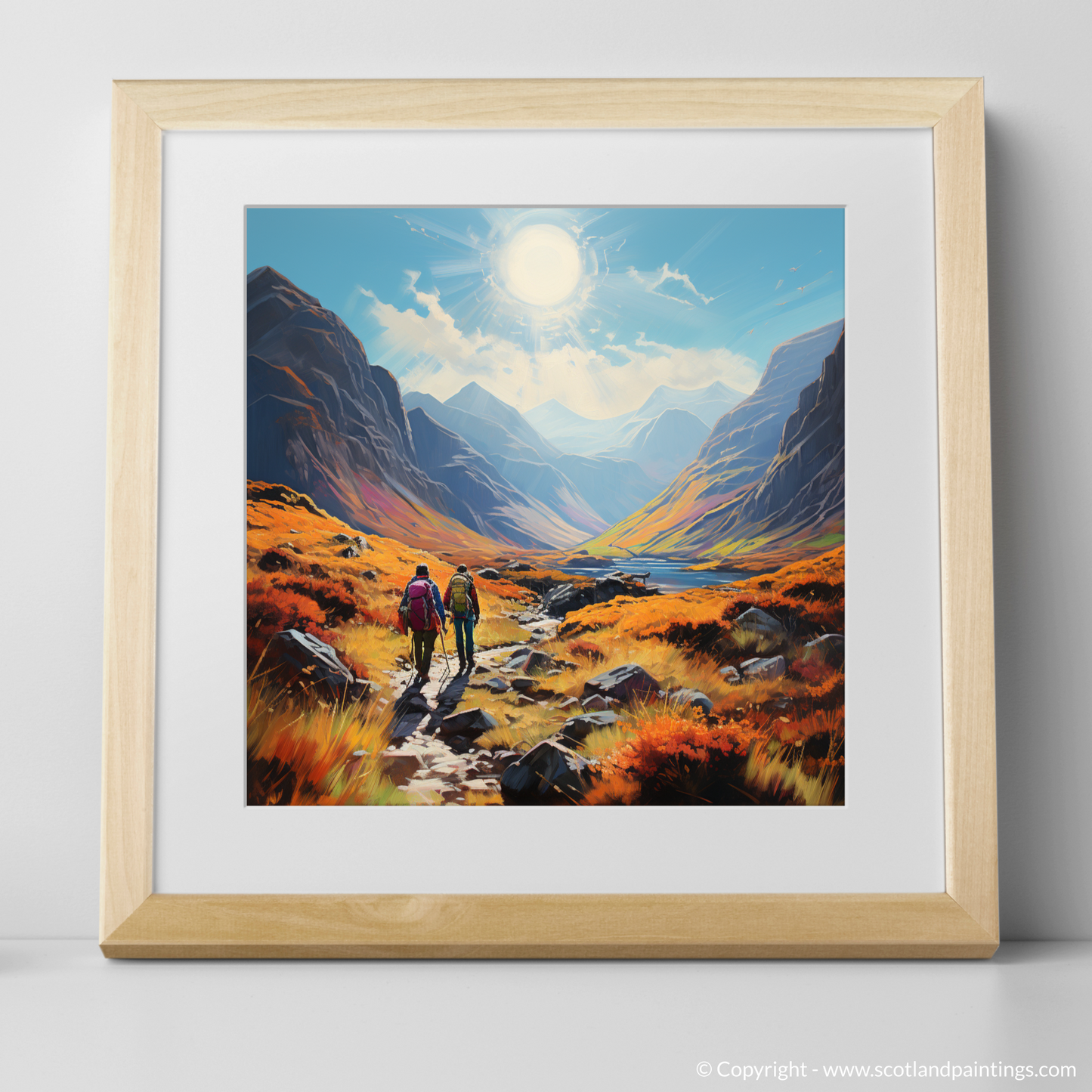 Capture the spirit of adventure with this vibrant, Art Nouveau inspired piece set in the breathtaking landscape of Glencoe. A symphony of nature's grandeur unfolds as your eyes wander across the pristine print, transporting you to a trail at the heart of Scotland's wilderness.