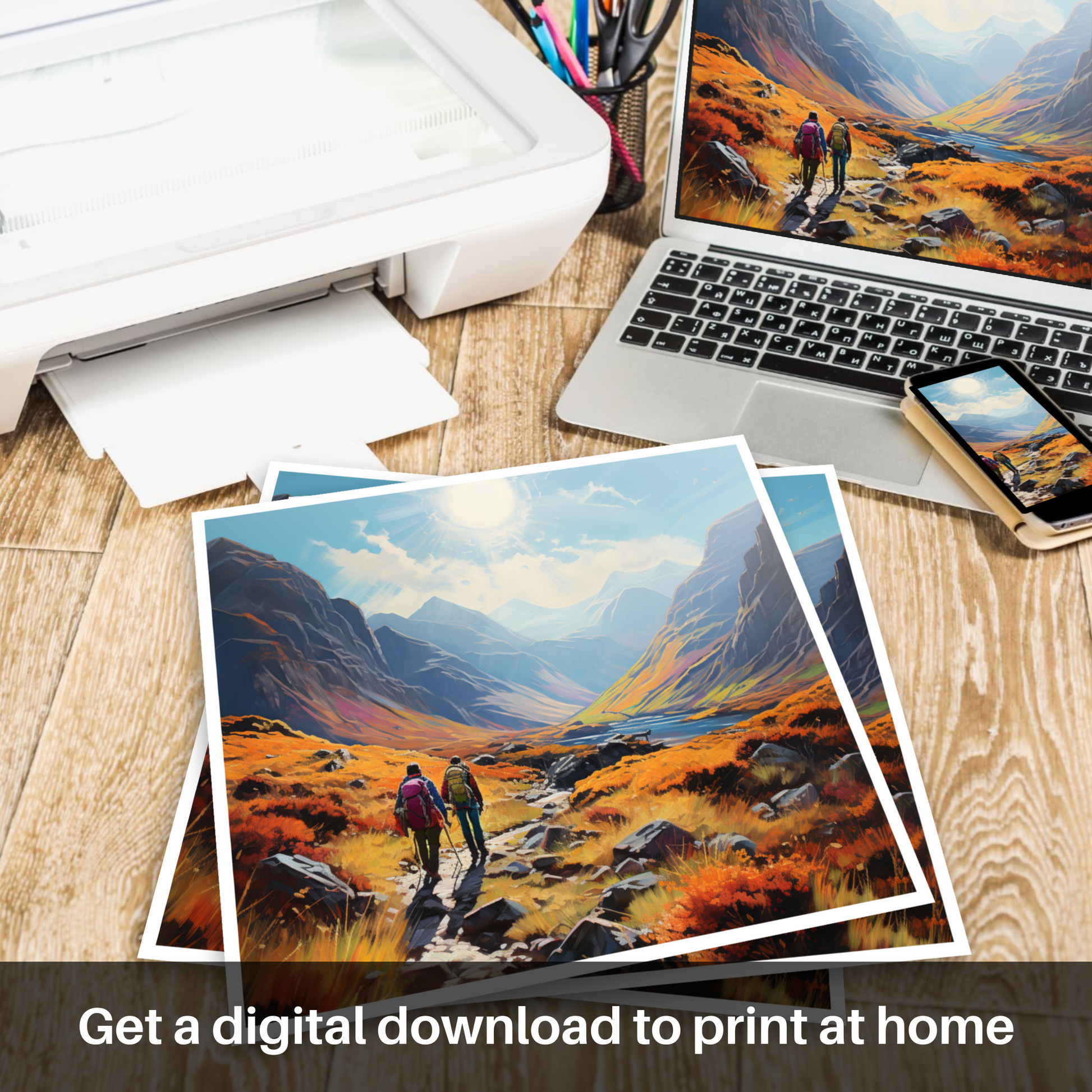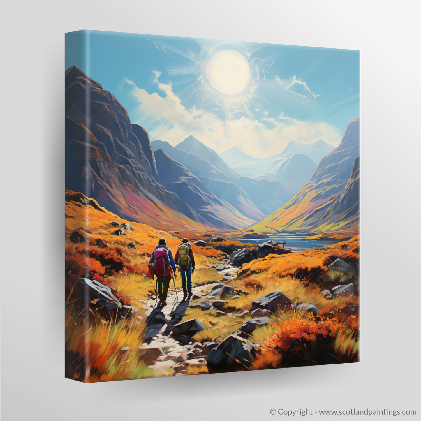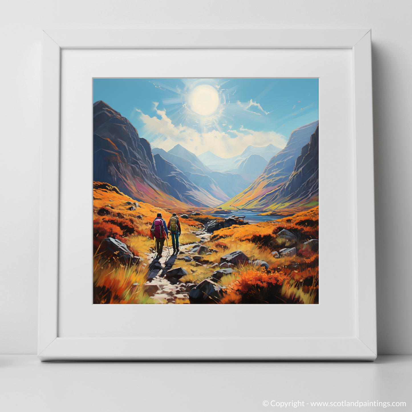 Capture the spirit of adventure with this vibrant, Art Nouveau inspired piece set in the breathtaking landscape of Glencoe. A symphony of nature's grandeur unfolds as your eyes wander across the pristine print, transporting you to a trail at the heart of Scotland's wilderness.