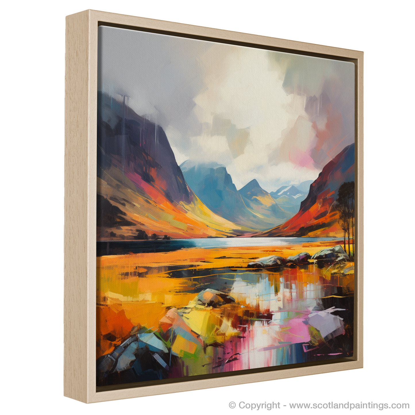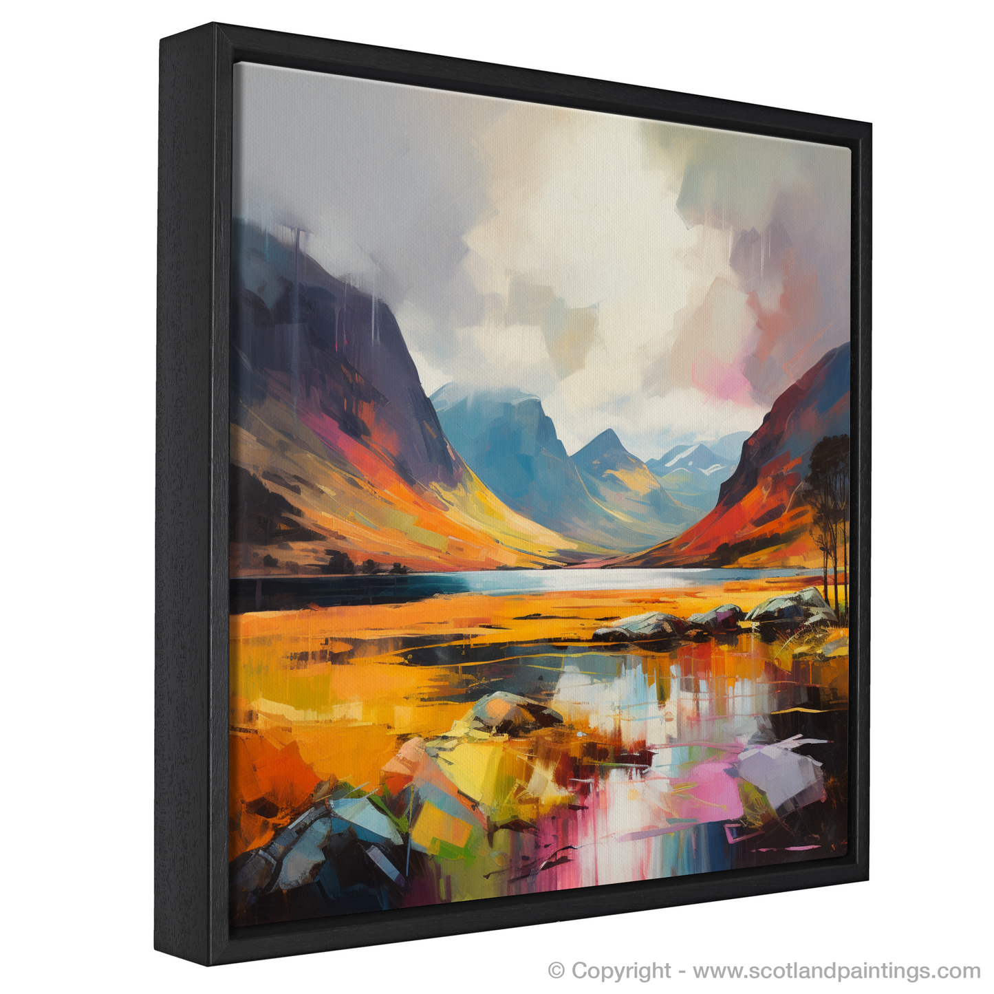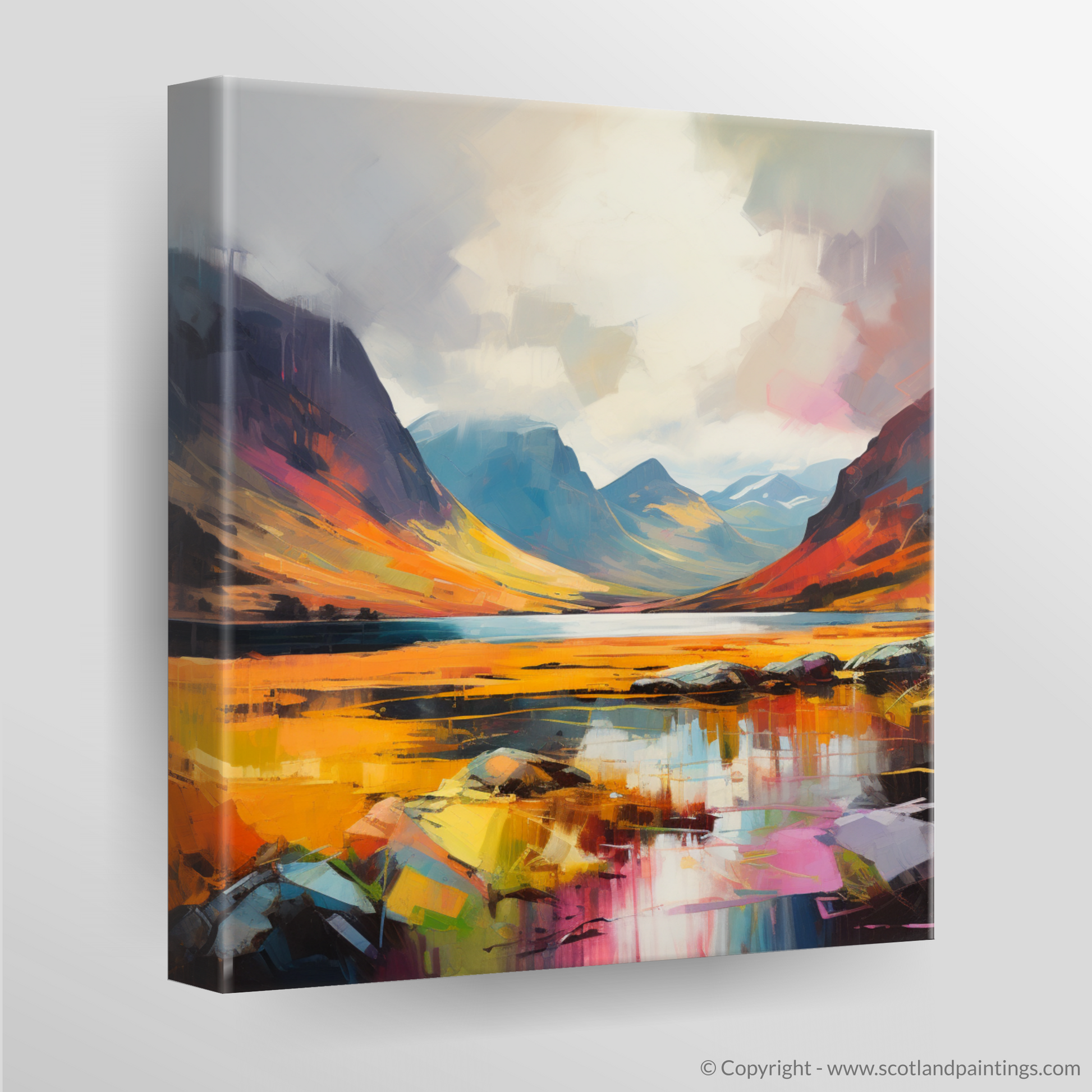 In the fore, the glen's rugged terrain is abstracted into a tapestry of colour—vivid yellows, rich reds, and reflective blues collide with the gentle greys of stone, invoking the feeling of raw, natural elements beneath your feet. The mirrored surface of the water doubles this beauty, offering a reflection that's as artistically fragmented as it is precise.