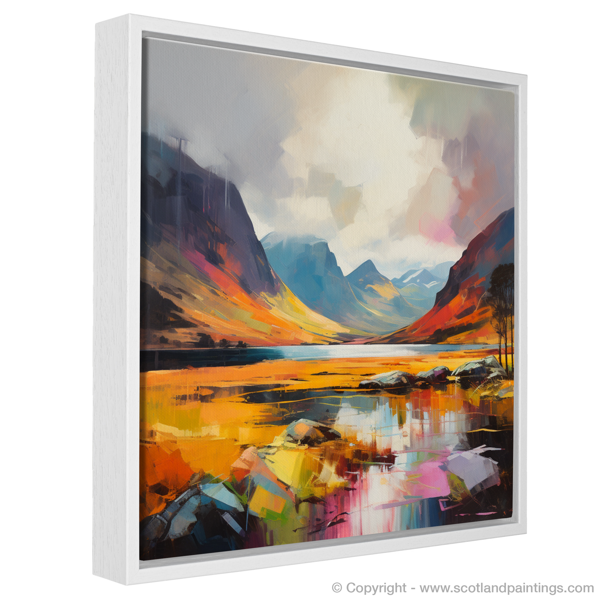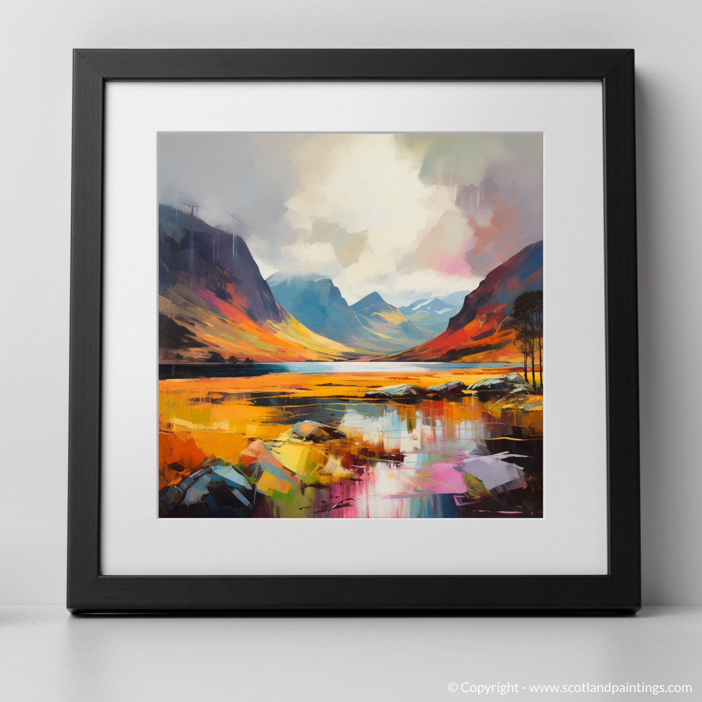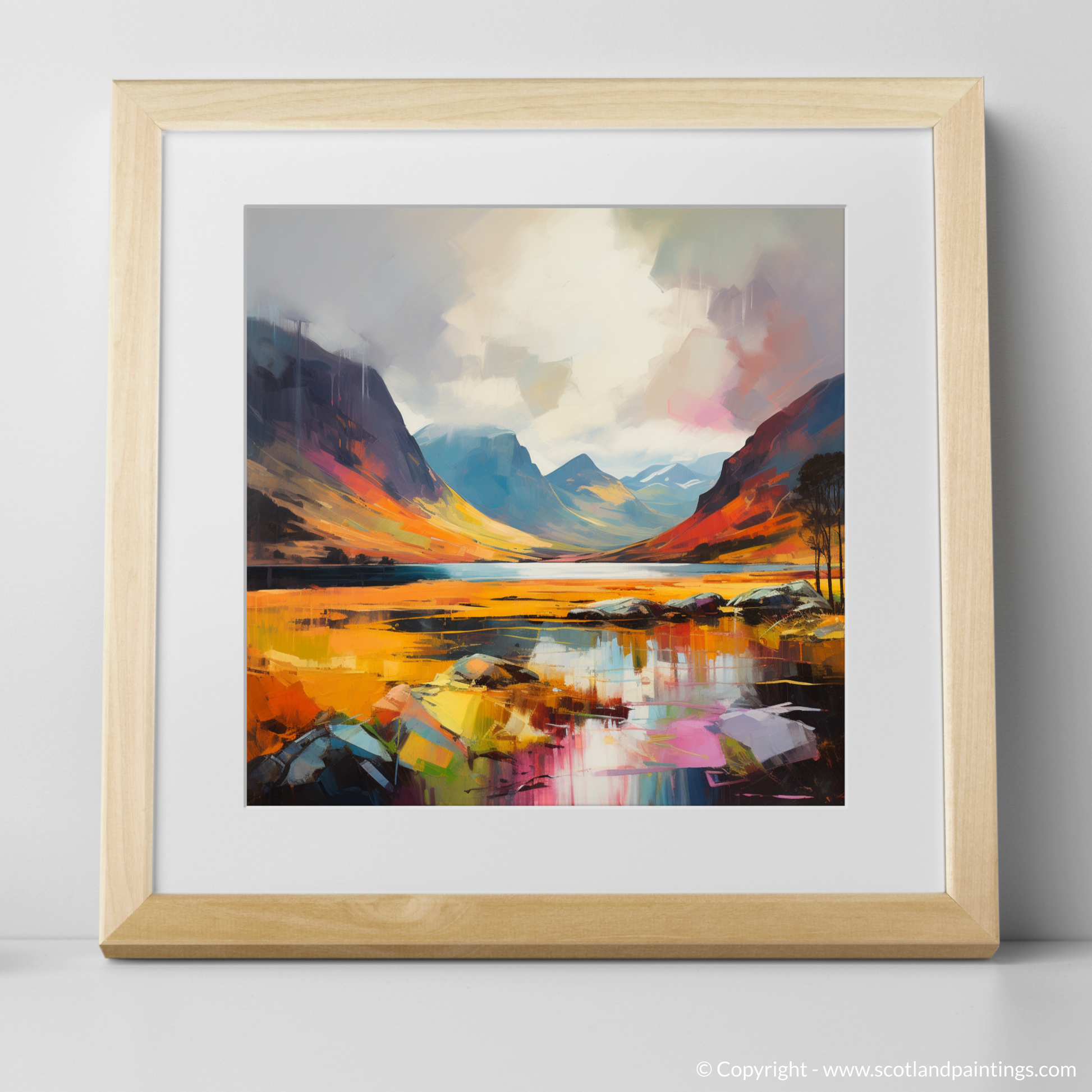 Capturing the ethereal beauty of Glencoe with a contemporary flair, this exquisite print radiates the vibrant grandeur of nature's spectacle. Bold, expressive brushstrokes come together to form the magnificent peaks that rise majestically under a dynamic sky, where the magic of a fleeting rainbow adds a touch of elusive wonder.