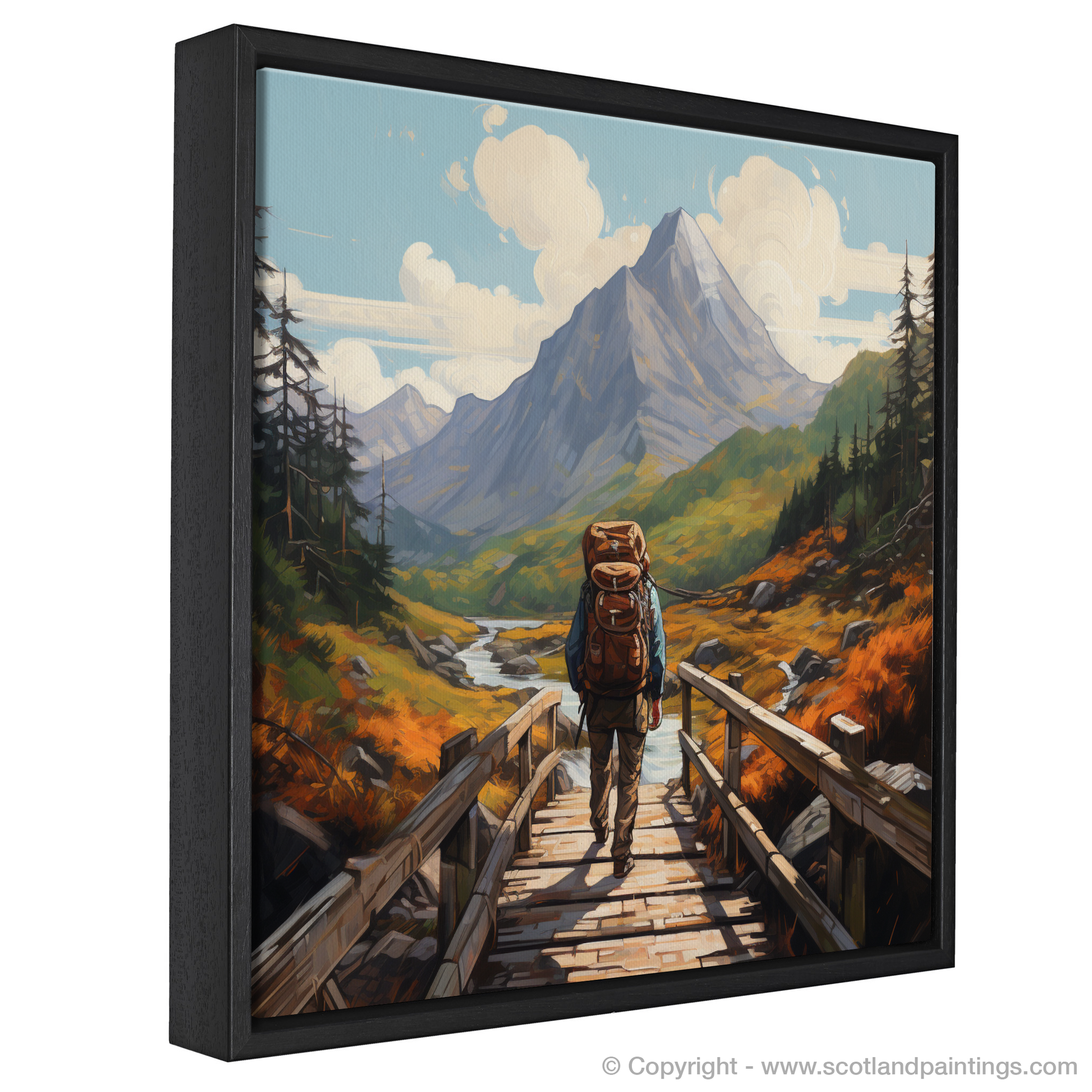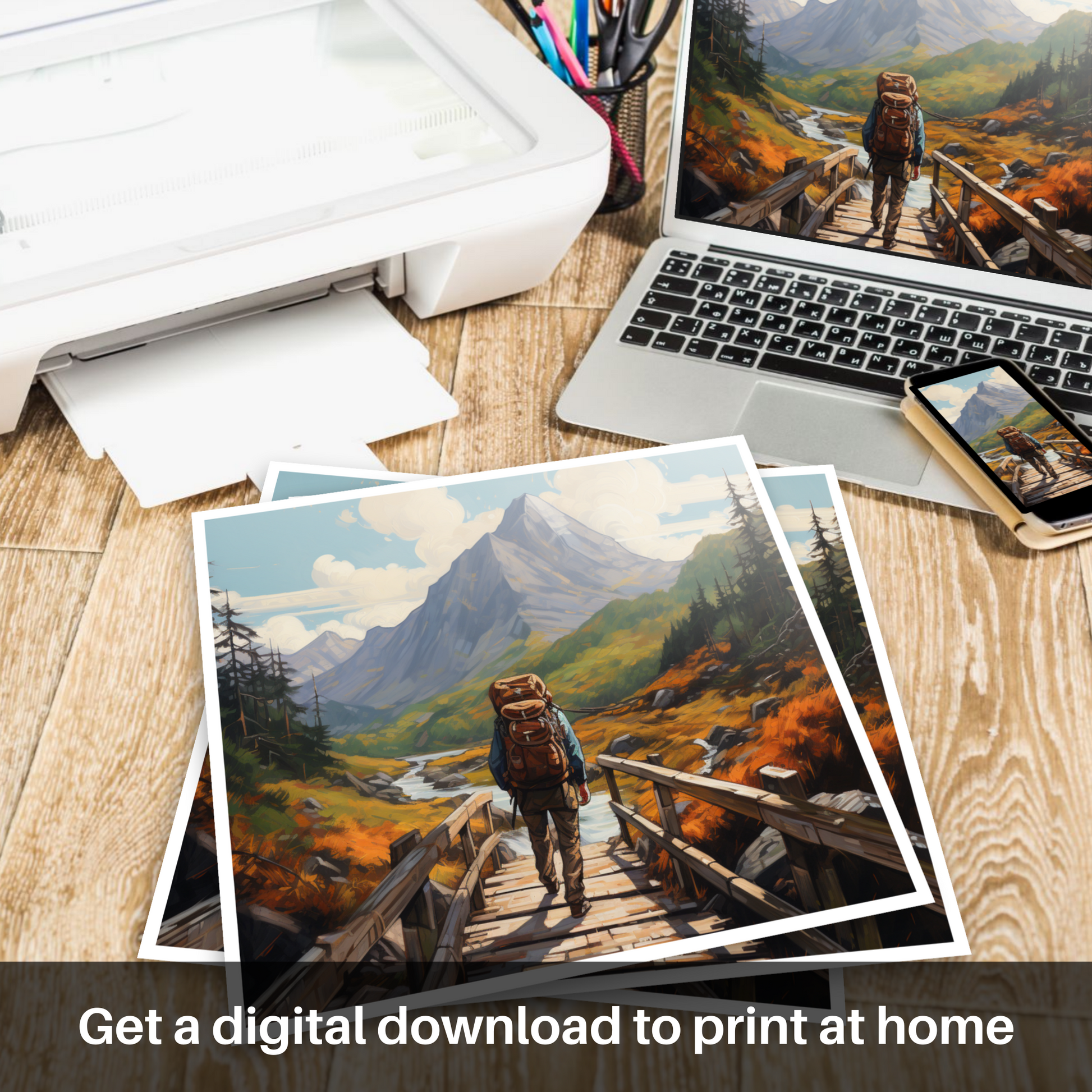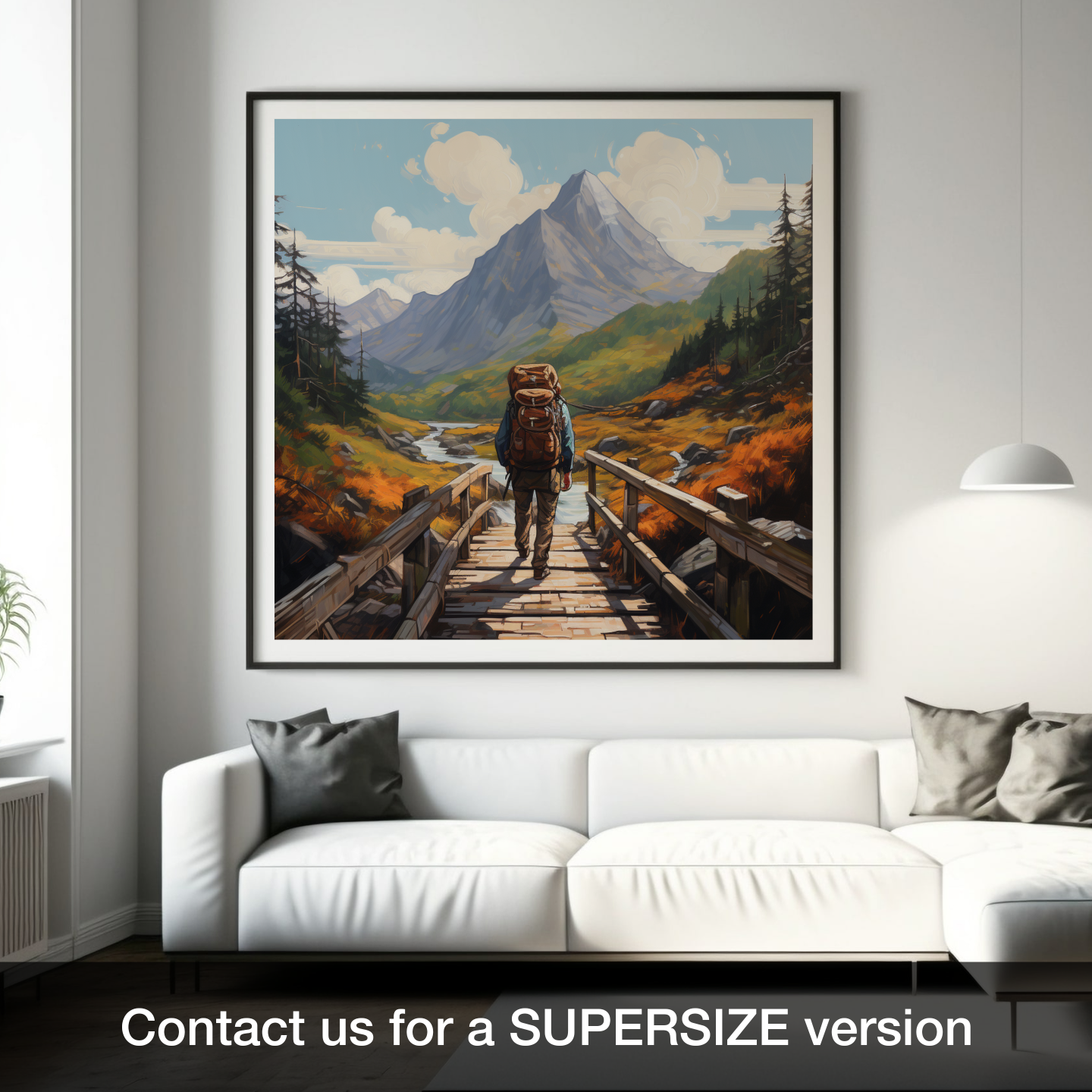 Immerse yourself in the rustic charm and stunning scenery of the Scottish Highlands with this enchanting print. The scene captures the essence of a serene, sun-dappled morning as a lone backpacker travels across a wooden bridge, his journey leading him through the rugged beauty of Glencoe. This naive art-inspired piece evokes a sense of adventure and tranquillity with its vivid, simplified forms and bright, exuberant colours.