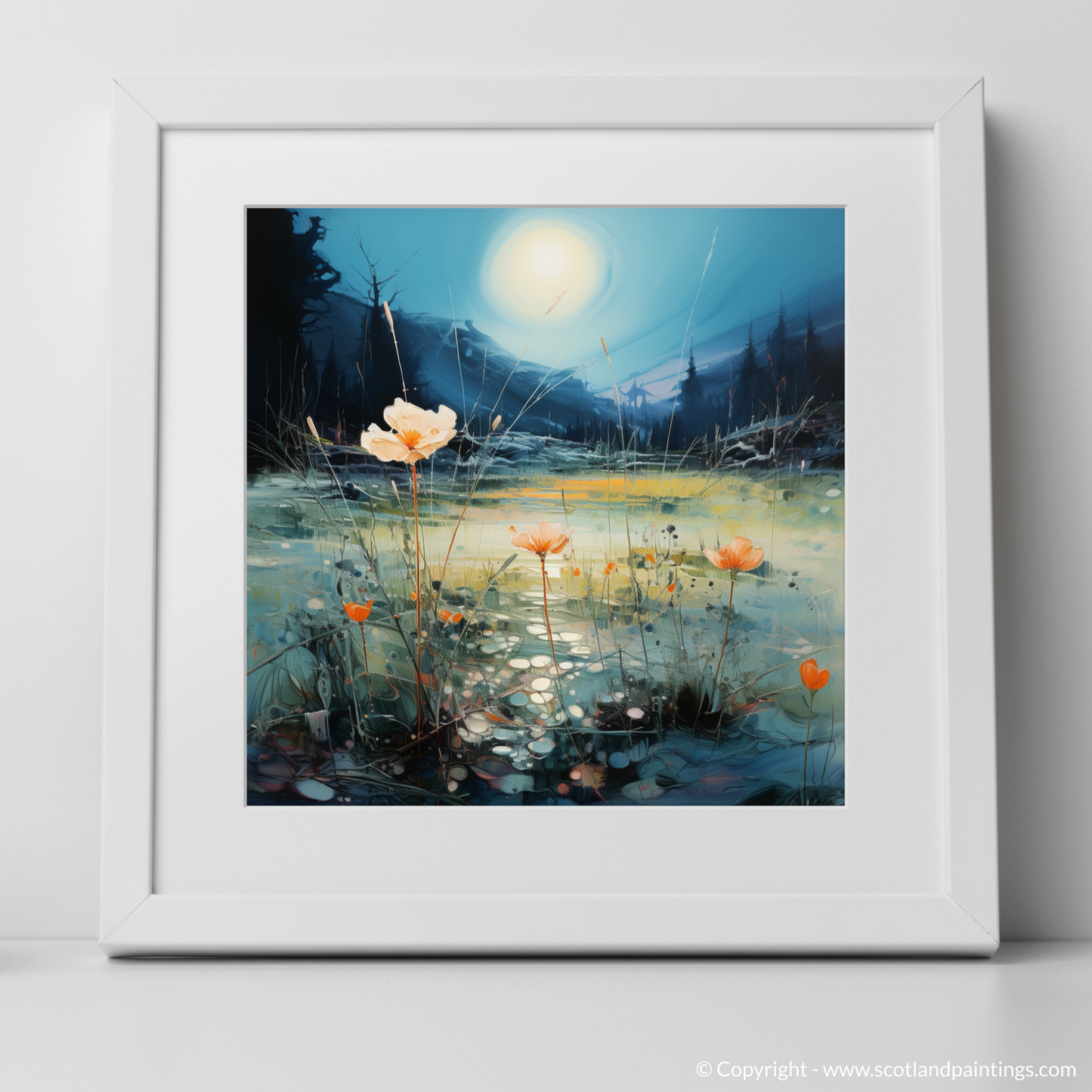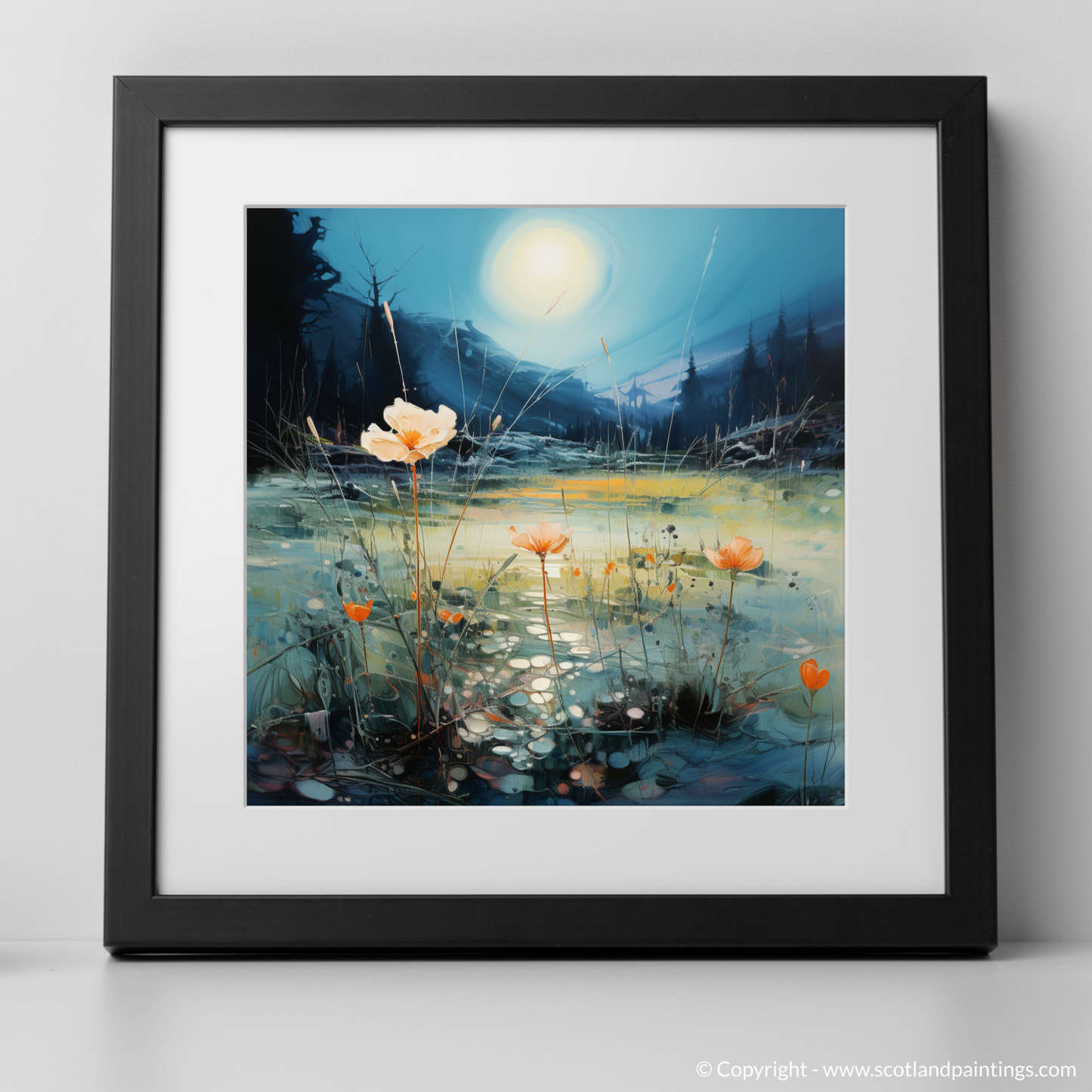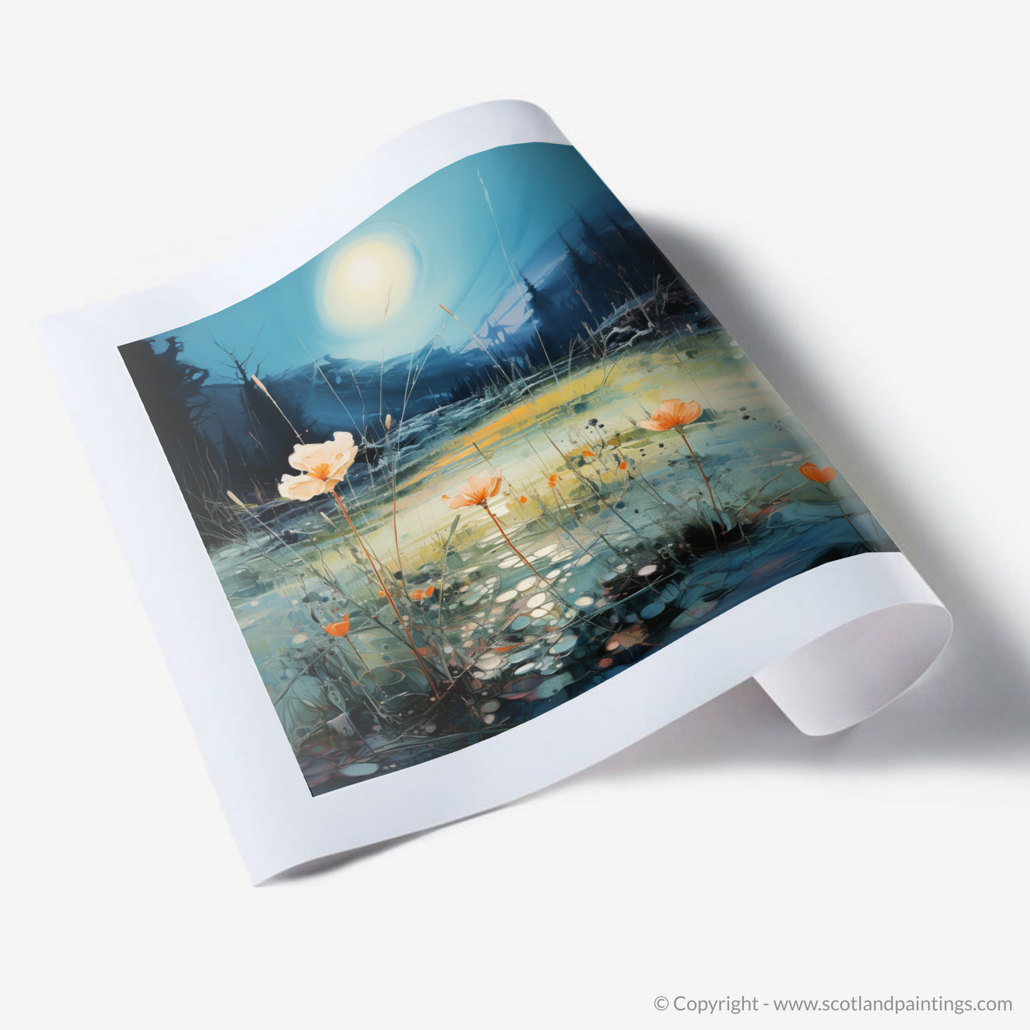 Step into a dreamscape where nature's delicate beauty meets the profound depths of the surreal in this enchanting print from our 'Glencoe' collection. A whimsical portrayal of tormentil—a wildflower native to the Highlands—unfolds against a backdrop that whispers the untold mysteries of Glencoe at the break of dawn.
