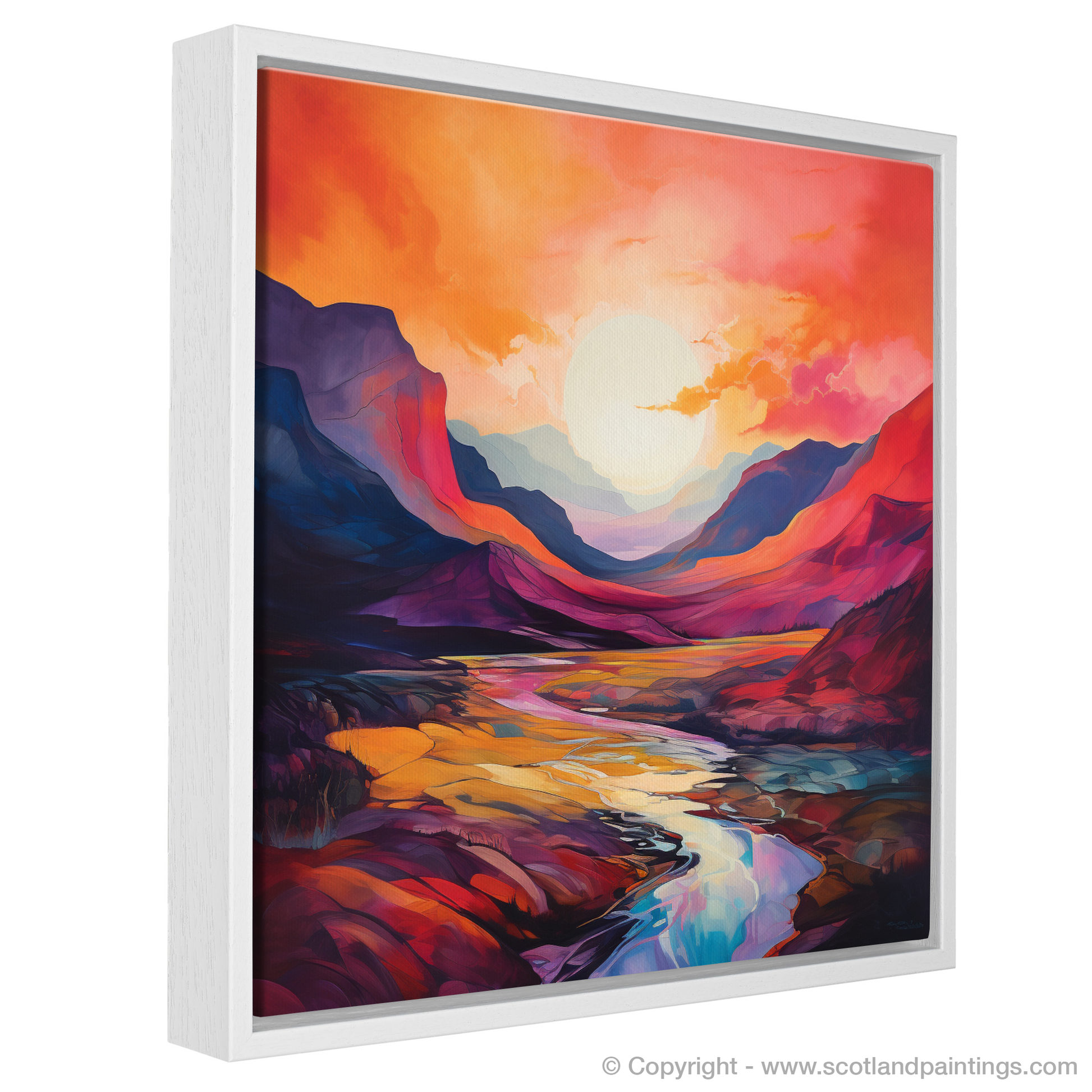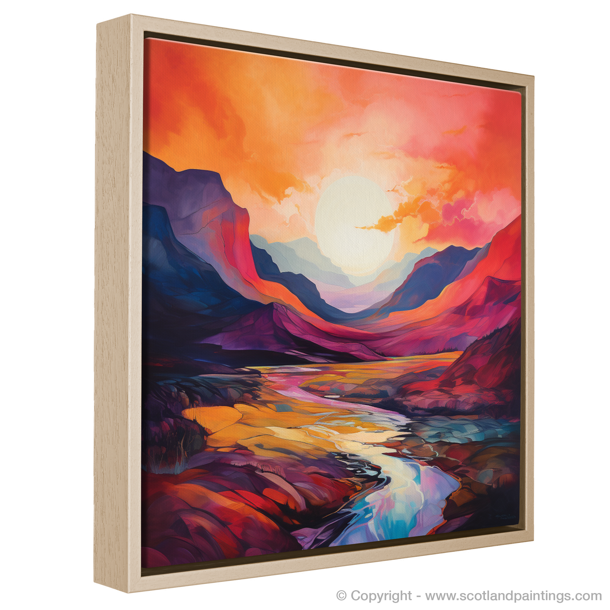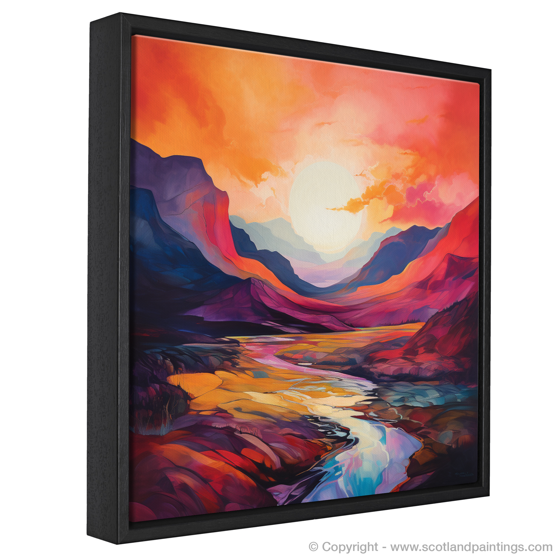 With the fiery hues of a setting sun cast across the canvas, this captivating print takes the observer on a serene journey to the heart of Glencoe's legendary landscape. The evocative composition captures a moment of natural splendour, where the sky blazes with an enchanting spectrum ranging from deep violets to intense oranges, enshrouding the tranquil scene below in a warm, ethereal light.