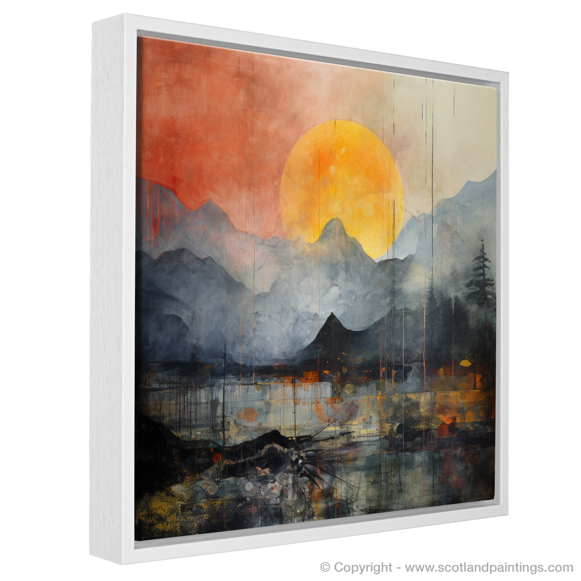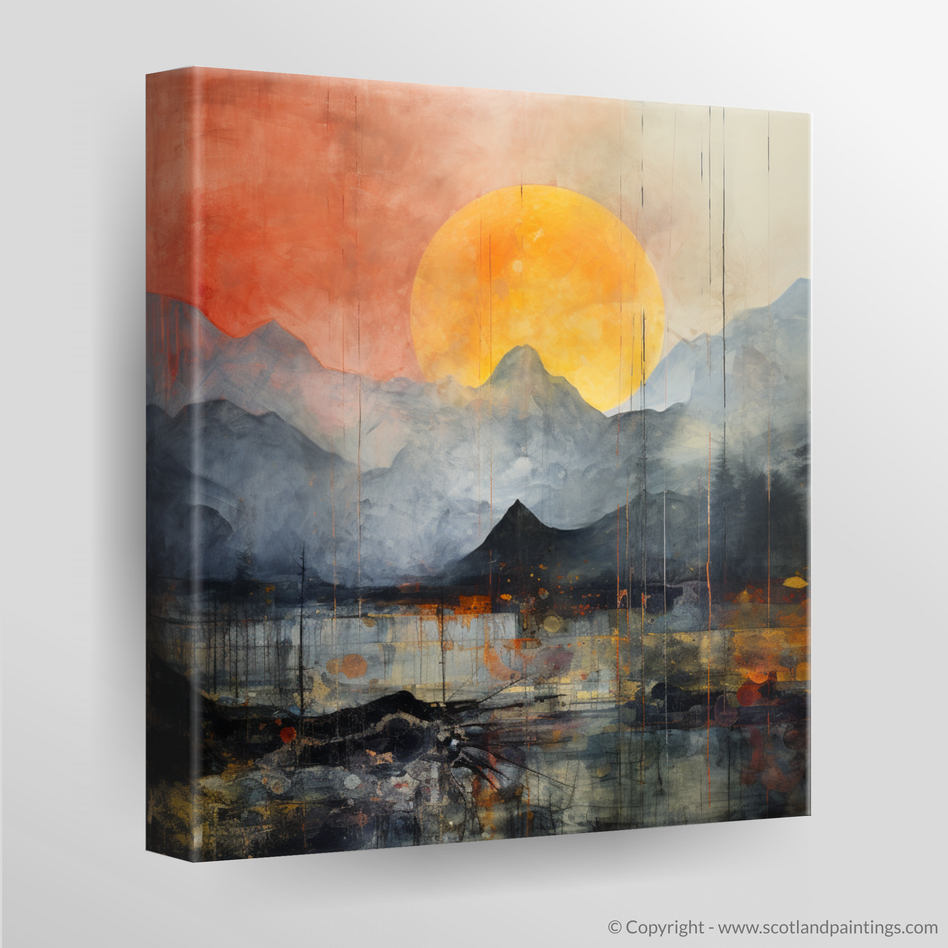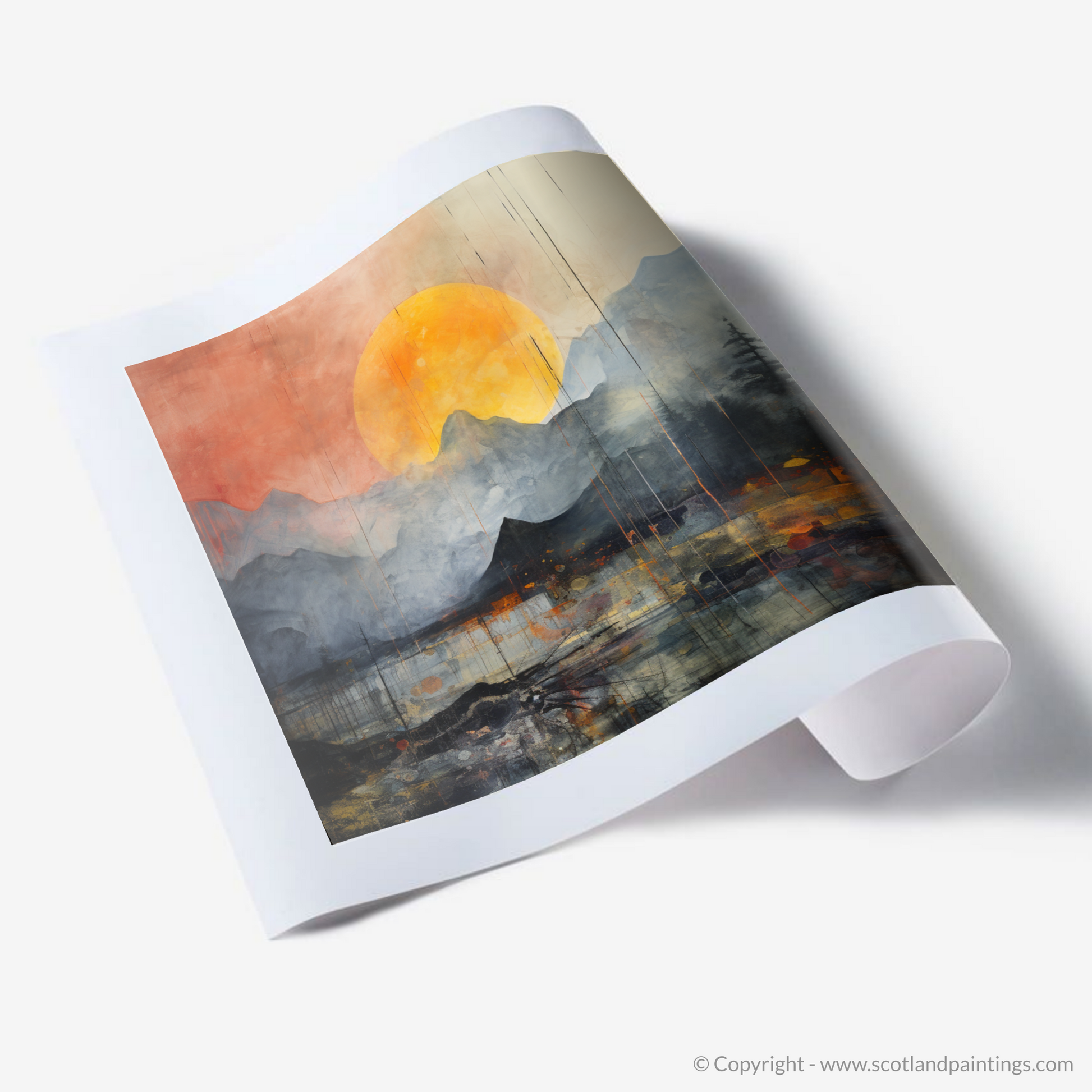 Immerse yourself in the atmospheric spectacle gracing your wall, an evocative piece that captures the ethereal beauty of Glencoe shrouded in rolling fog. Set against a colour palette that merges moody shades of grey with vibrant oranges and fiery reds, this print showcases a visually arresting interpretation of the natural landscape.