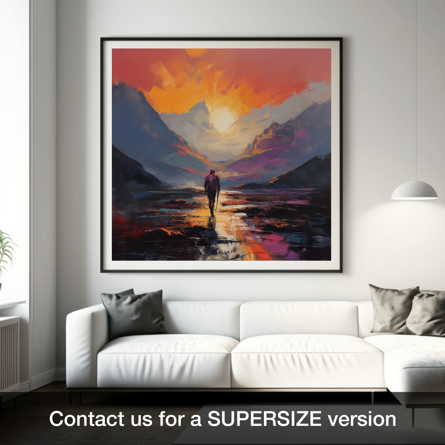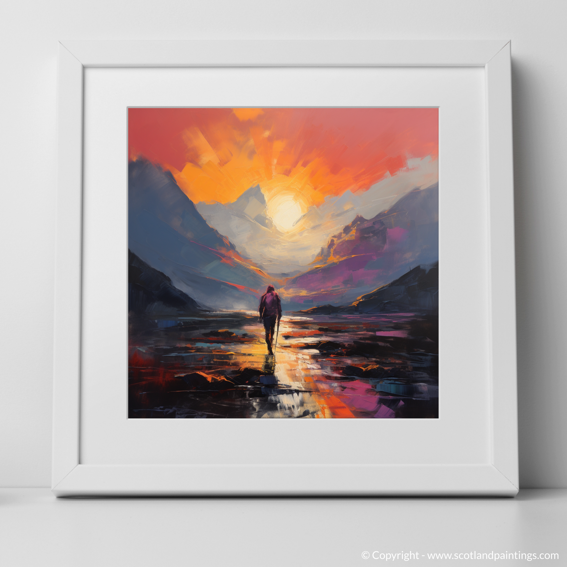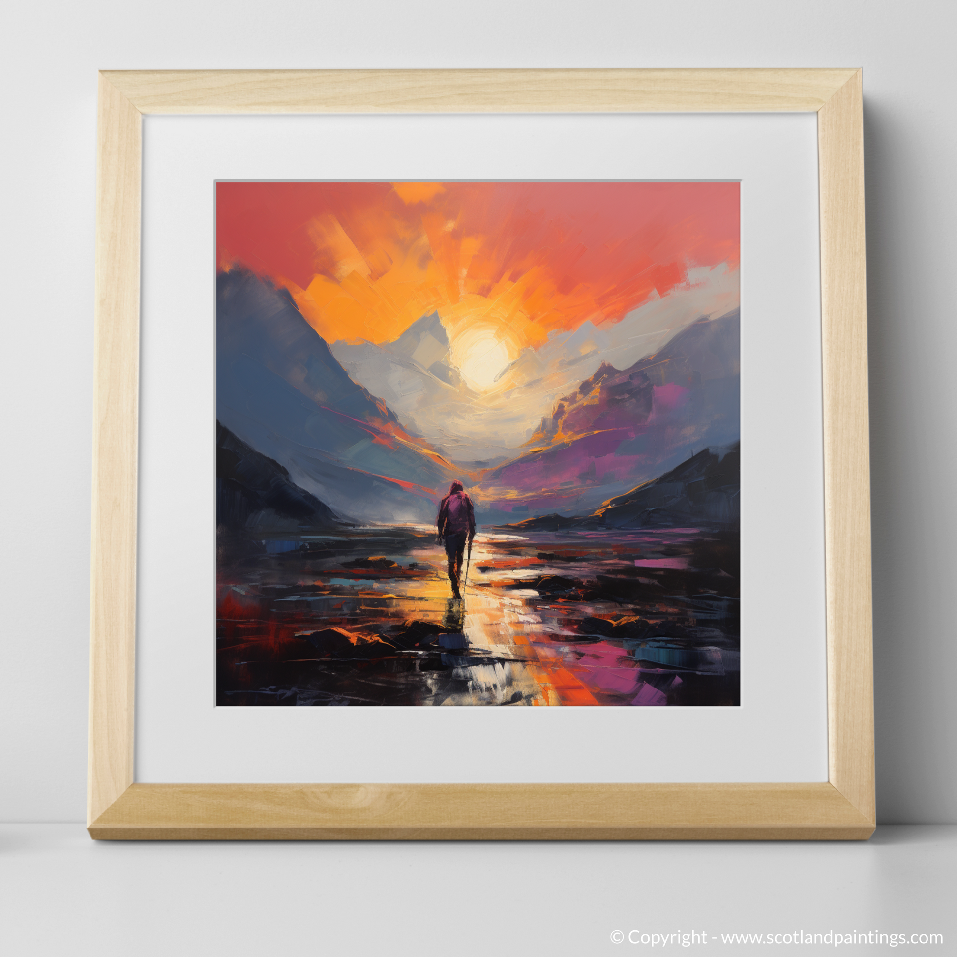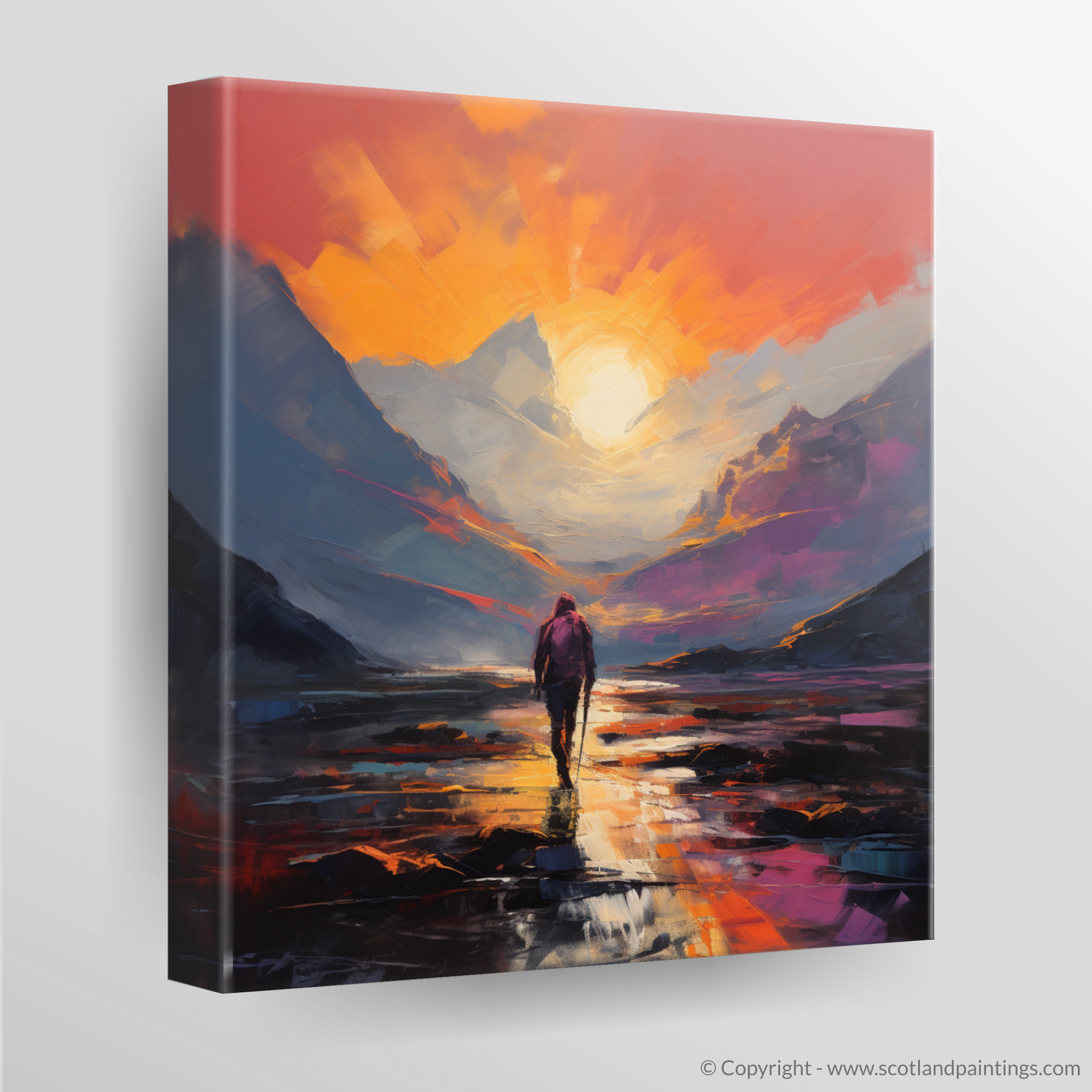 Capture the wild, untamed essence of Glencoe with our compelling abstract expressionist piece. Evoking the majestic natural landscape at dusk, this print features a solitary hiker enveloped in the tranquil beauty of twilight.