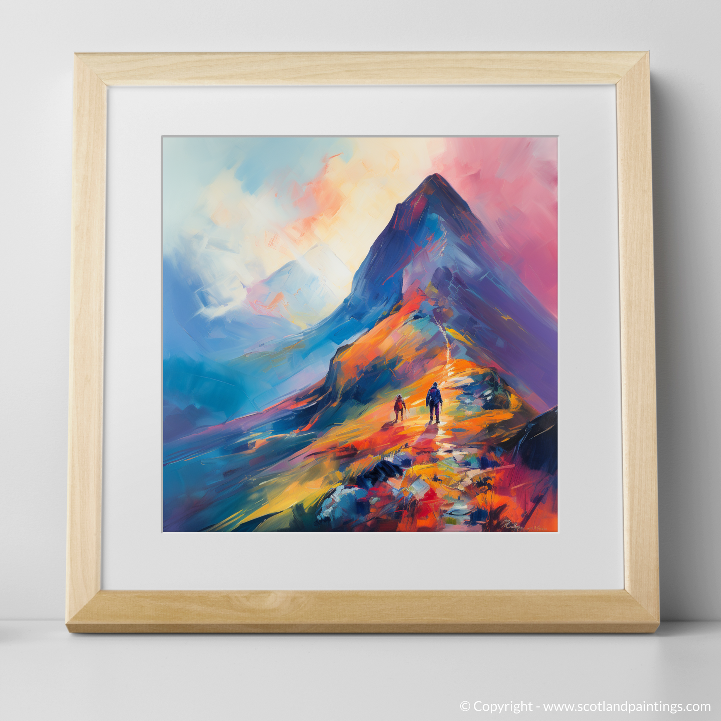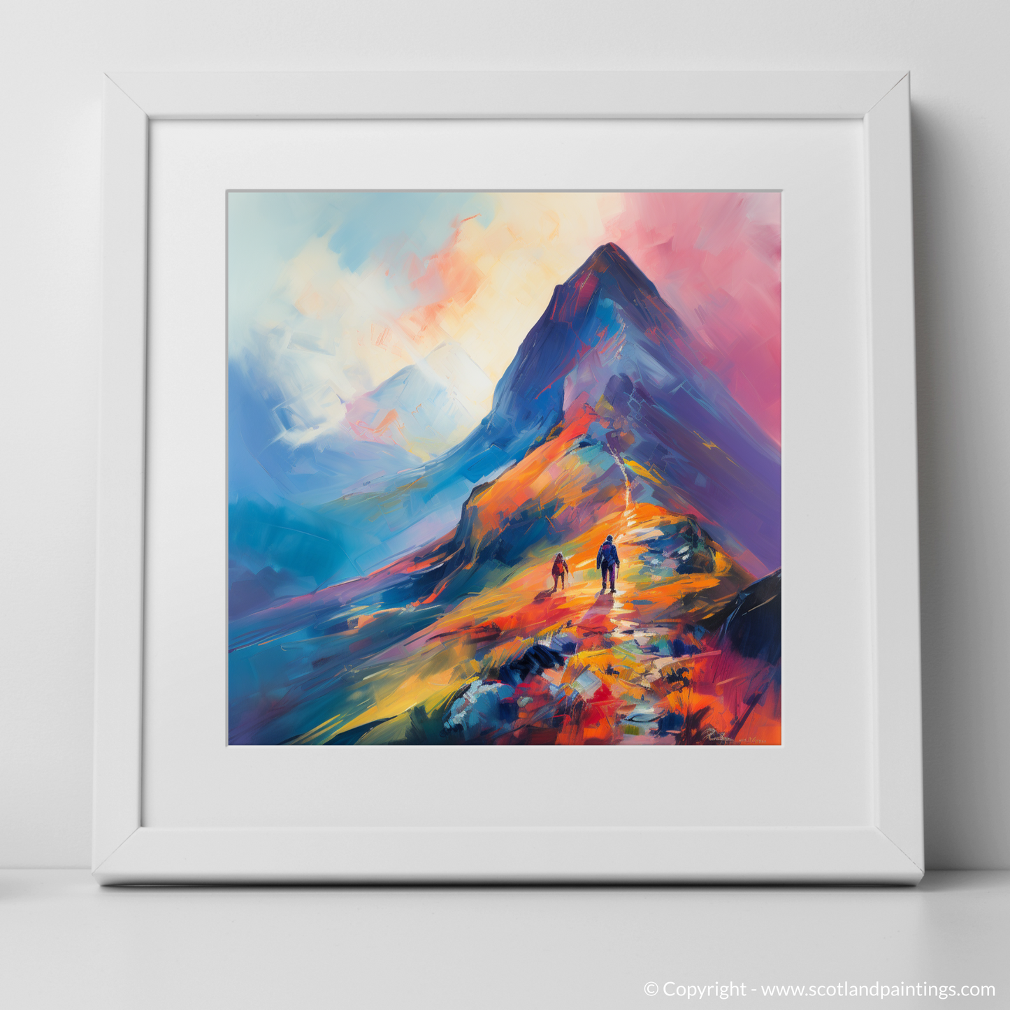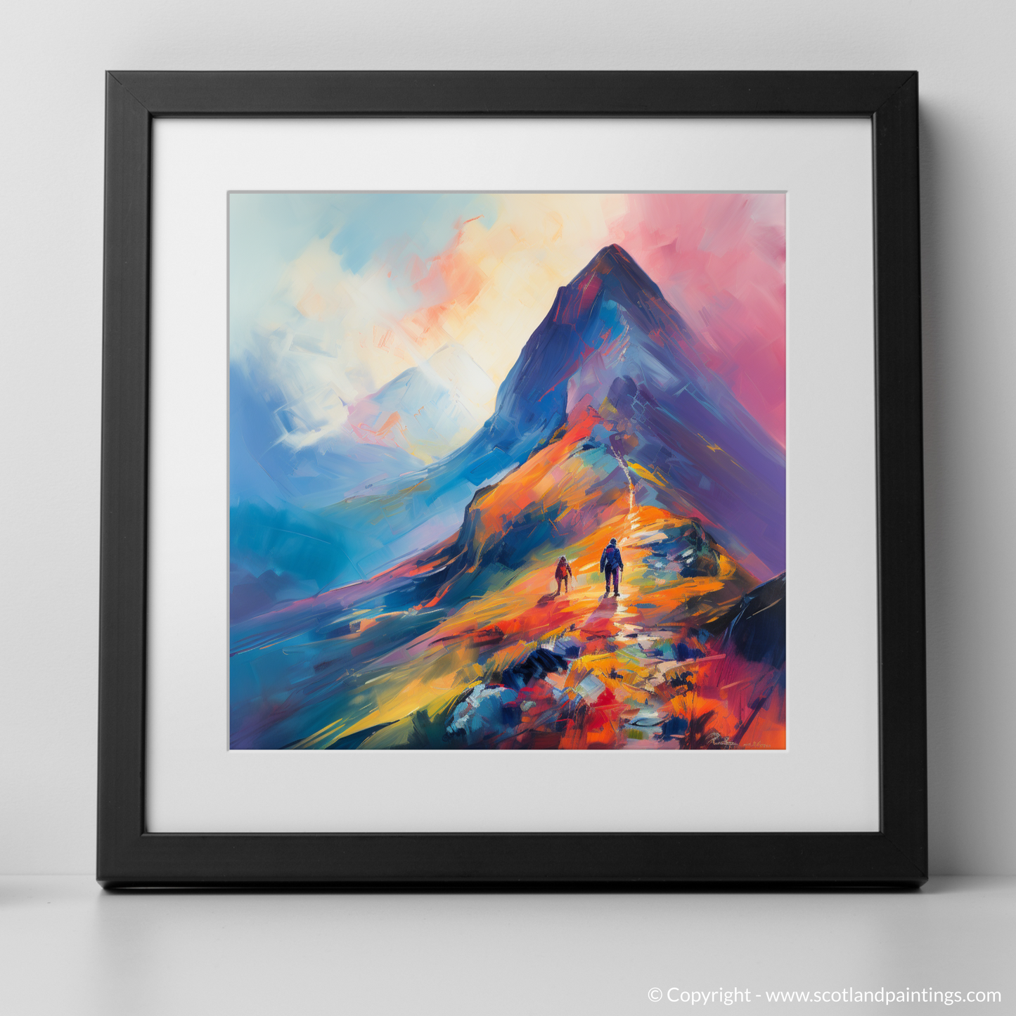 Immerse yourself in the vibrant hues and bold brushstrokes of this captivating print, which brings the wild beauty of Glencoe to the comforting walls of your home or office. Inspired by the stunning landscapes of the Scottish Highlands, this piece presents a climber's daring ascent into the swirling mists of a majestic peak.