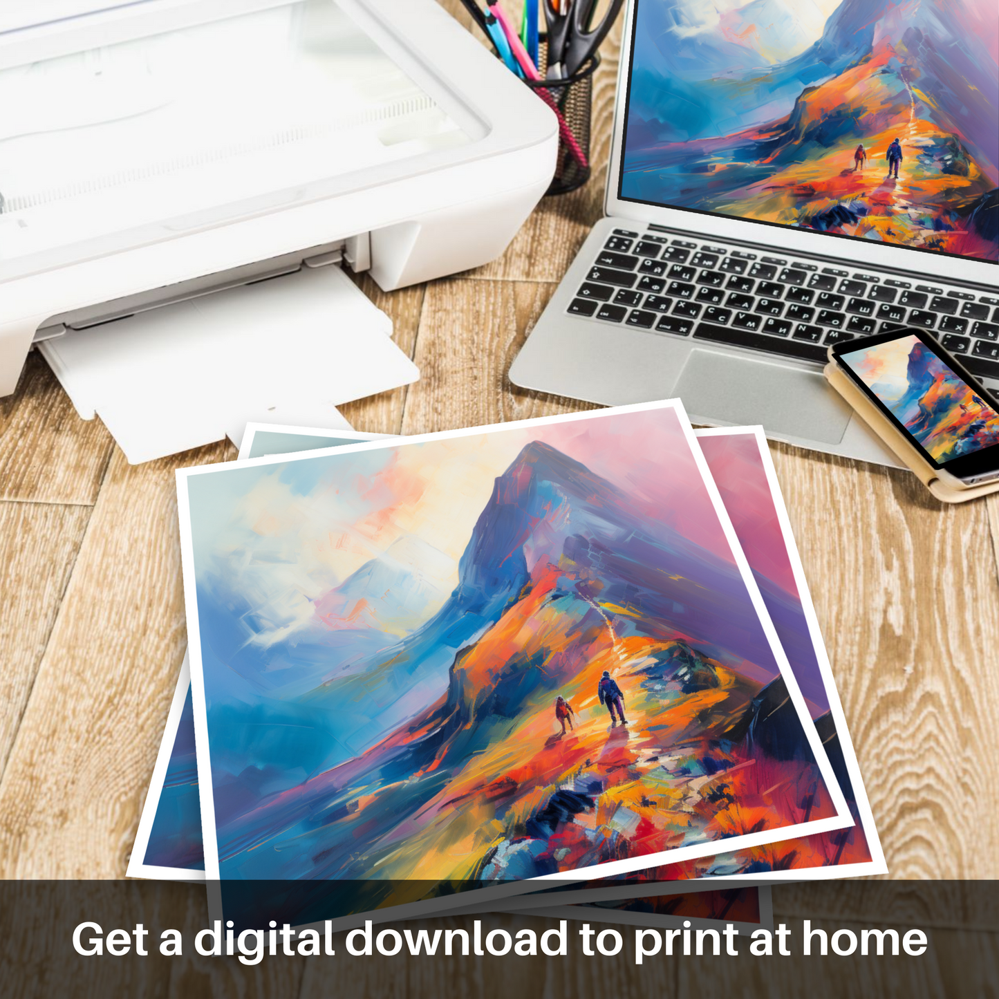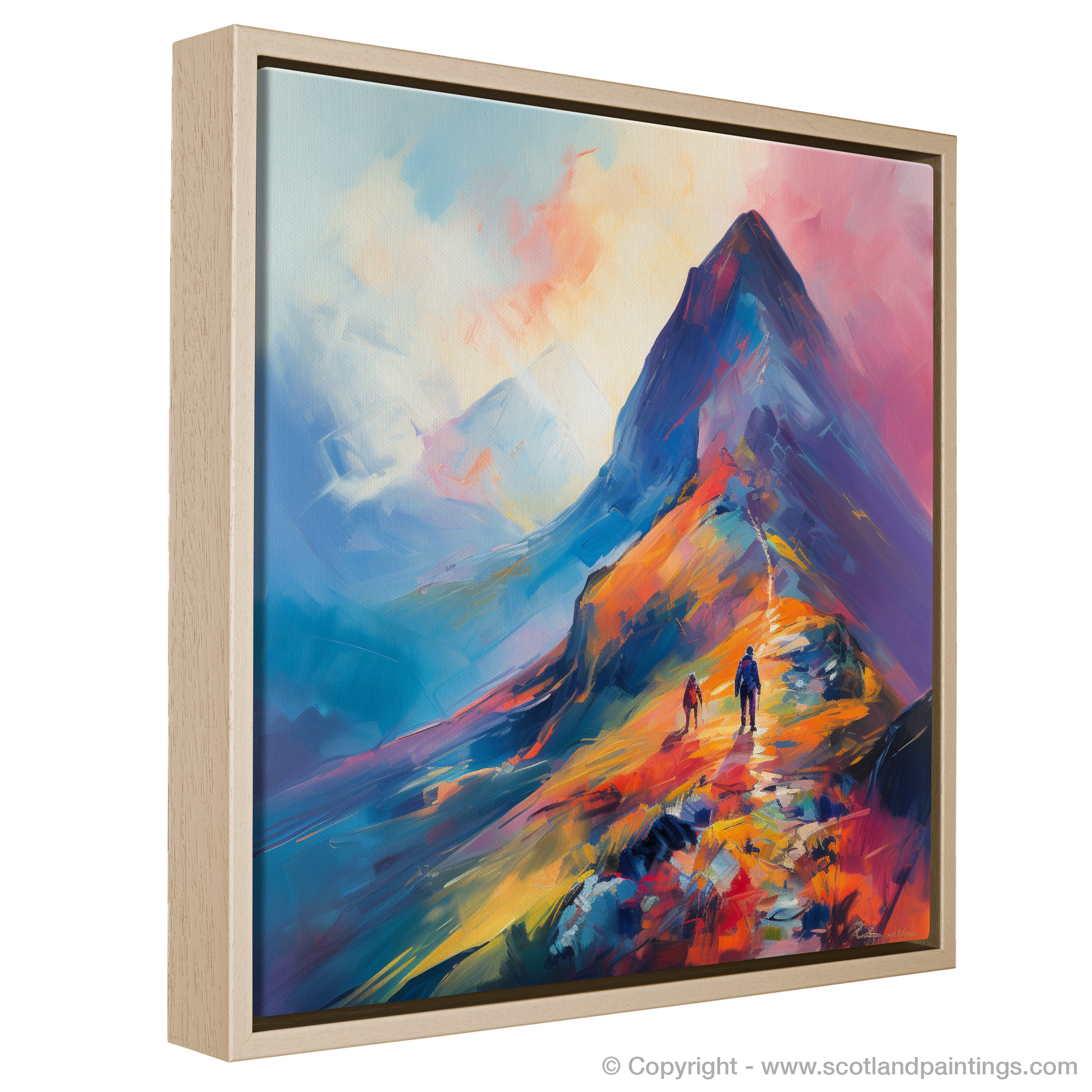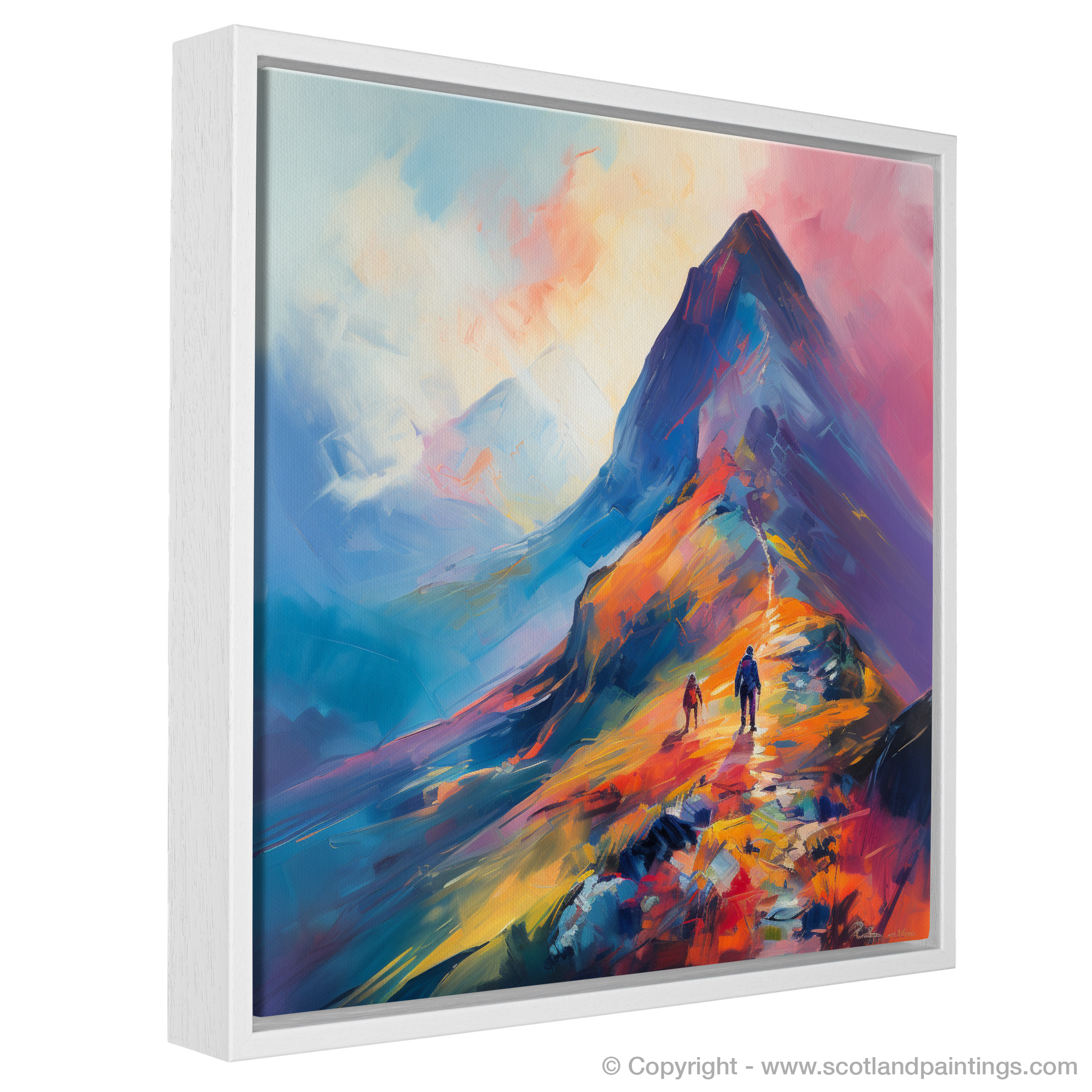 Immerse yourself in the vibrant hues and bold brushstrokes of this captivating print, which brings the wild beauty of Glencoe to the comforting walls of your home or office. Inspired by the stunning landscapes of the Scottish Highlands, this piece presents a climber's daring ascent into the swirling mists of a majestic peak.