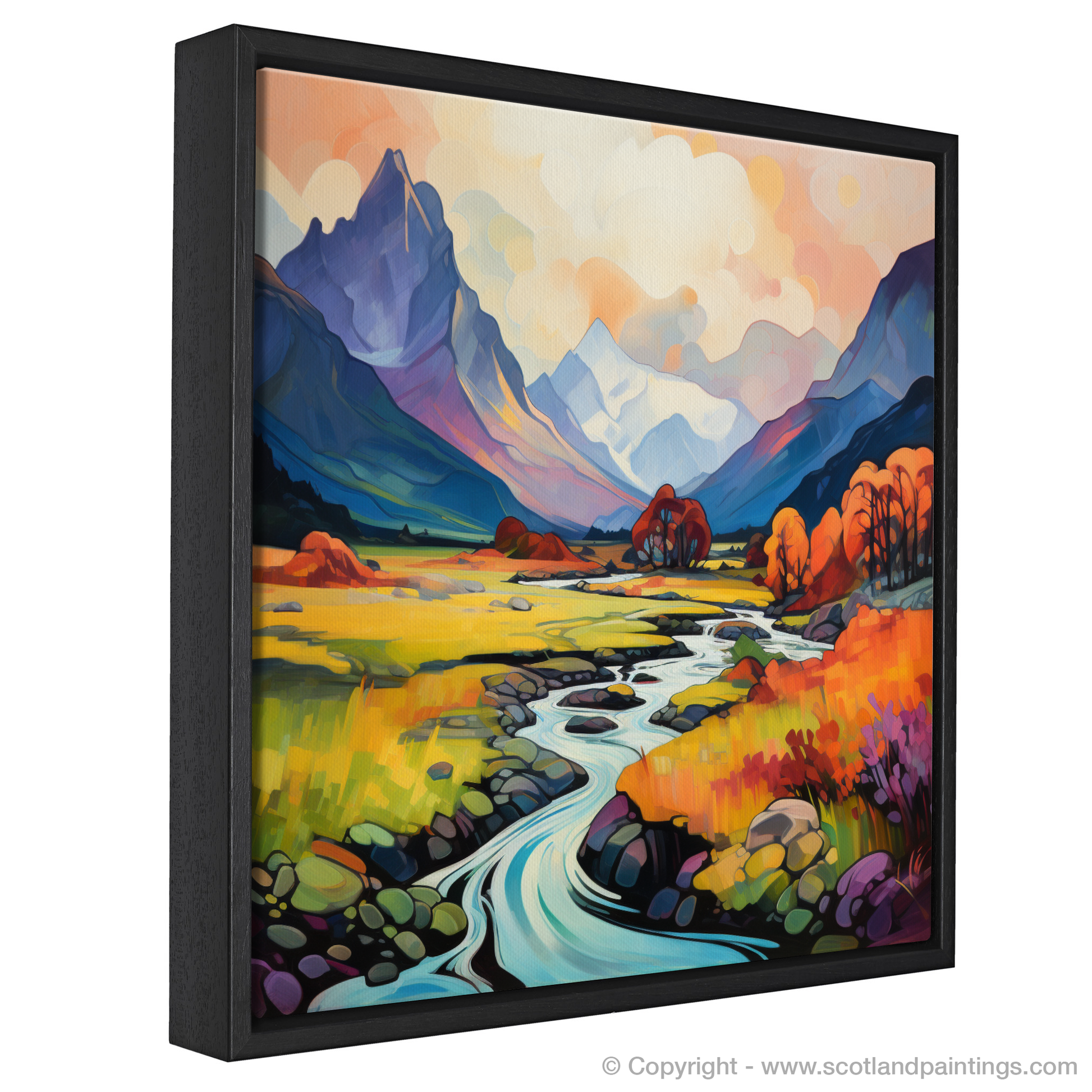 Capture the essence of Glencoe with this vibrant, Fauvist-inspired print that teems with the effervescent beauty of morning dew under a Scottish sky. Awash with a bold palette, your space will be invigorated by hues of amber gold, fiery orange, and radiant purples mirroring the landscape's natural majesty. In the foreground, a sinuous river weaves through a meadow, its waters reflecting the dawning light. The midground reveals an entrancing dance of trees, ablaze with autumnal glory, their foliage rendered in emphatic, passionate strokes that evoke the raw energy of the wild.