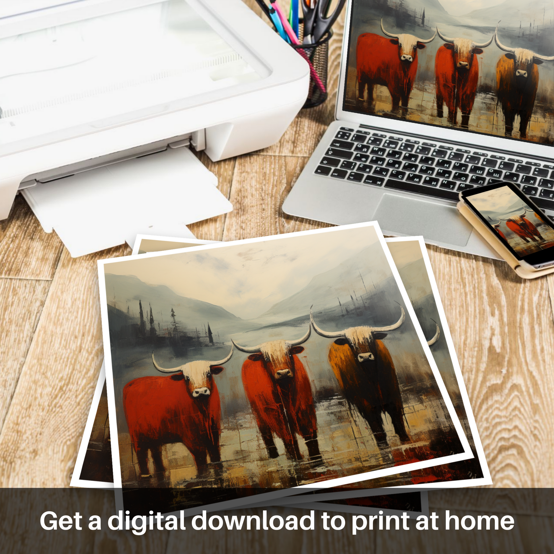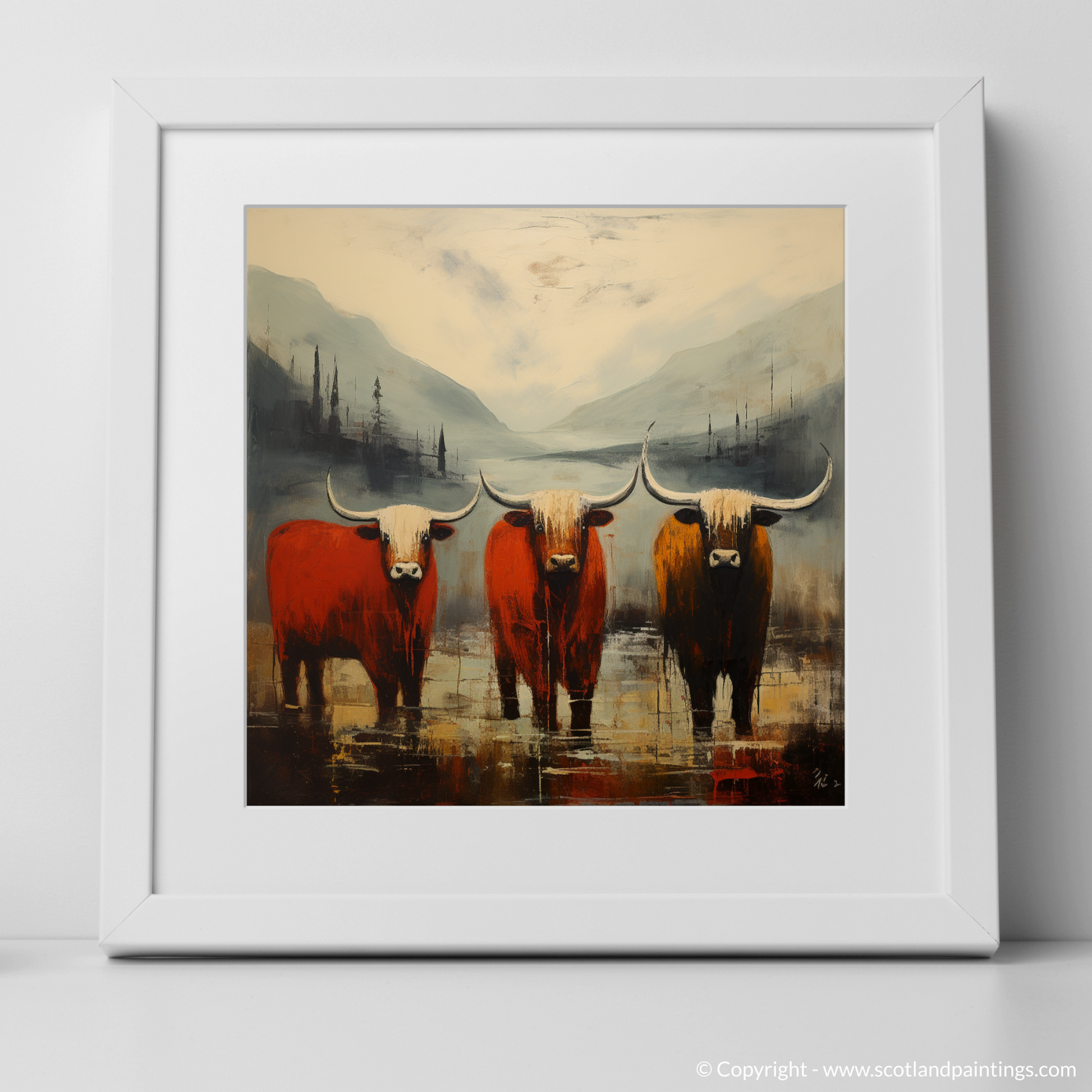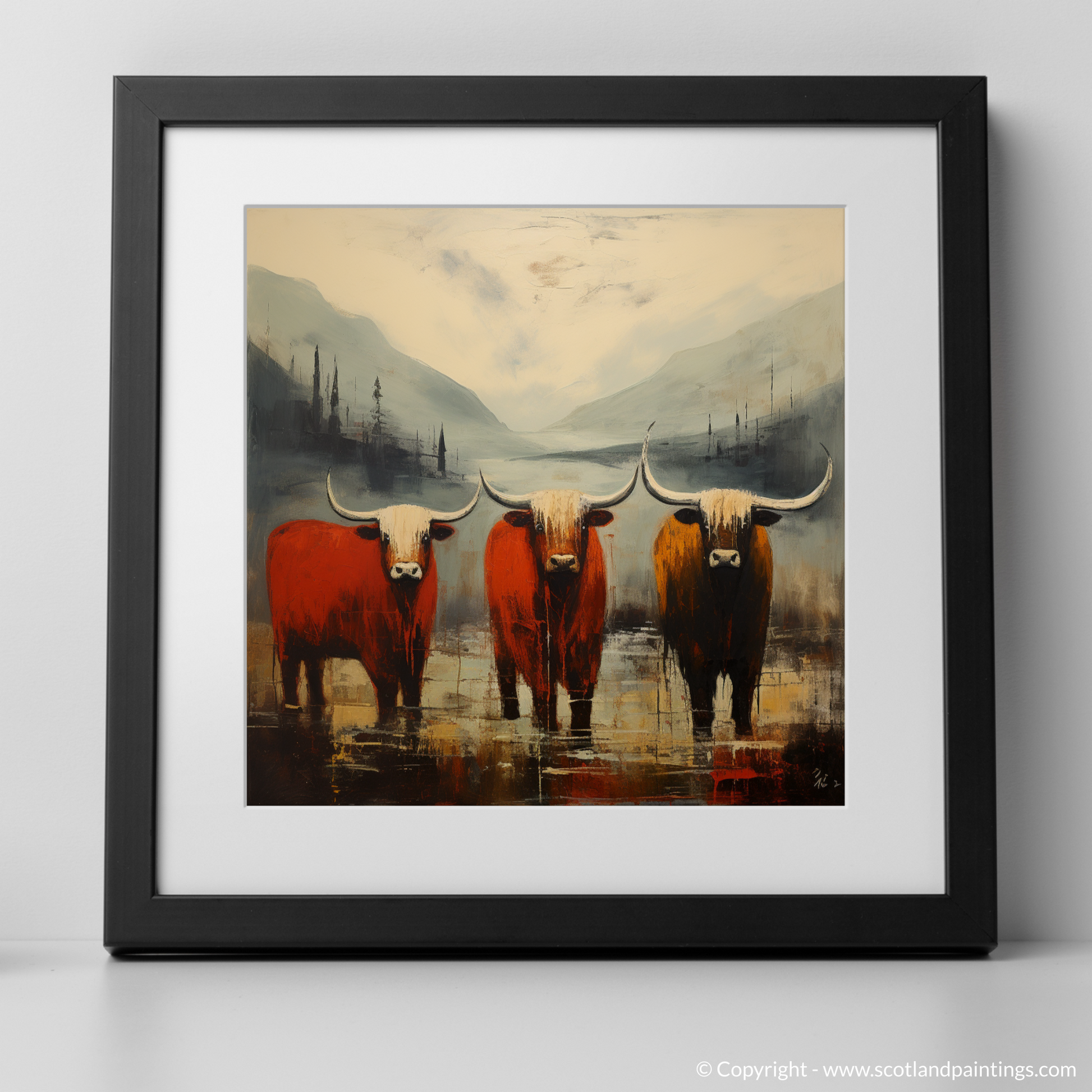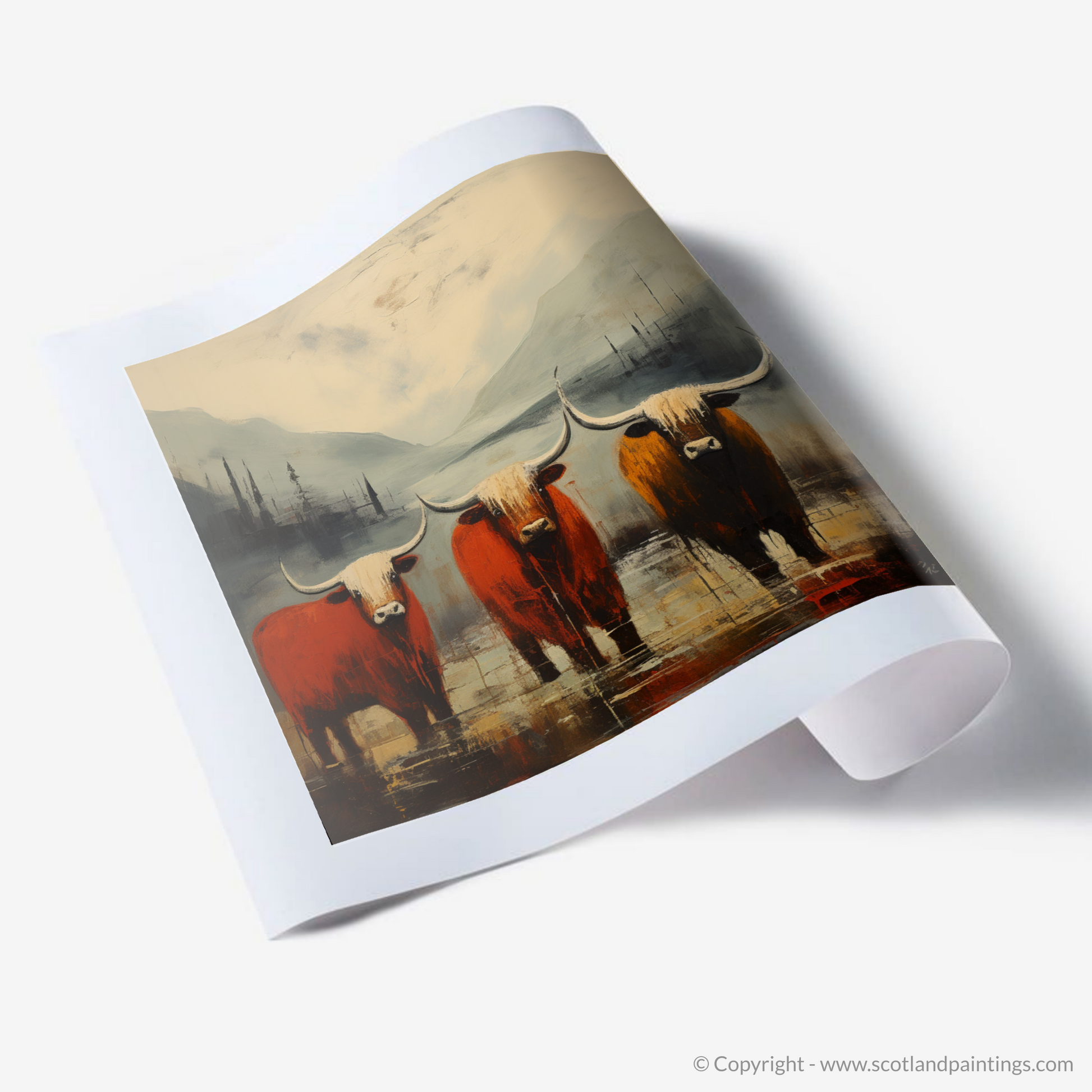 Immerse yourself in the raw beauty and untamed spirit of the Scottish Highlands with this captivating print, a part of our 'Glencoe' collection. The essence of Abstract Expressionism shines through the artwork with its spontaneous and emotive depiction, capturing both the rugged terrain and the iconic Highland cows that roam the land.