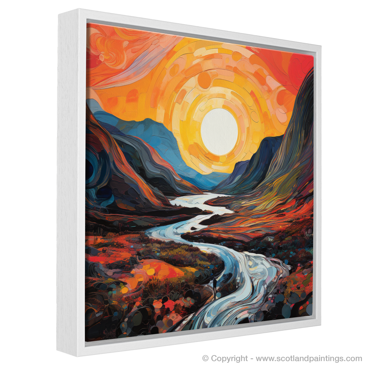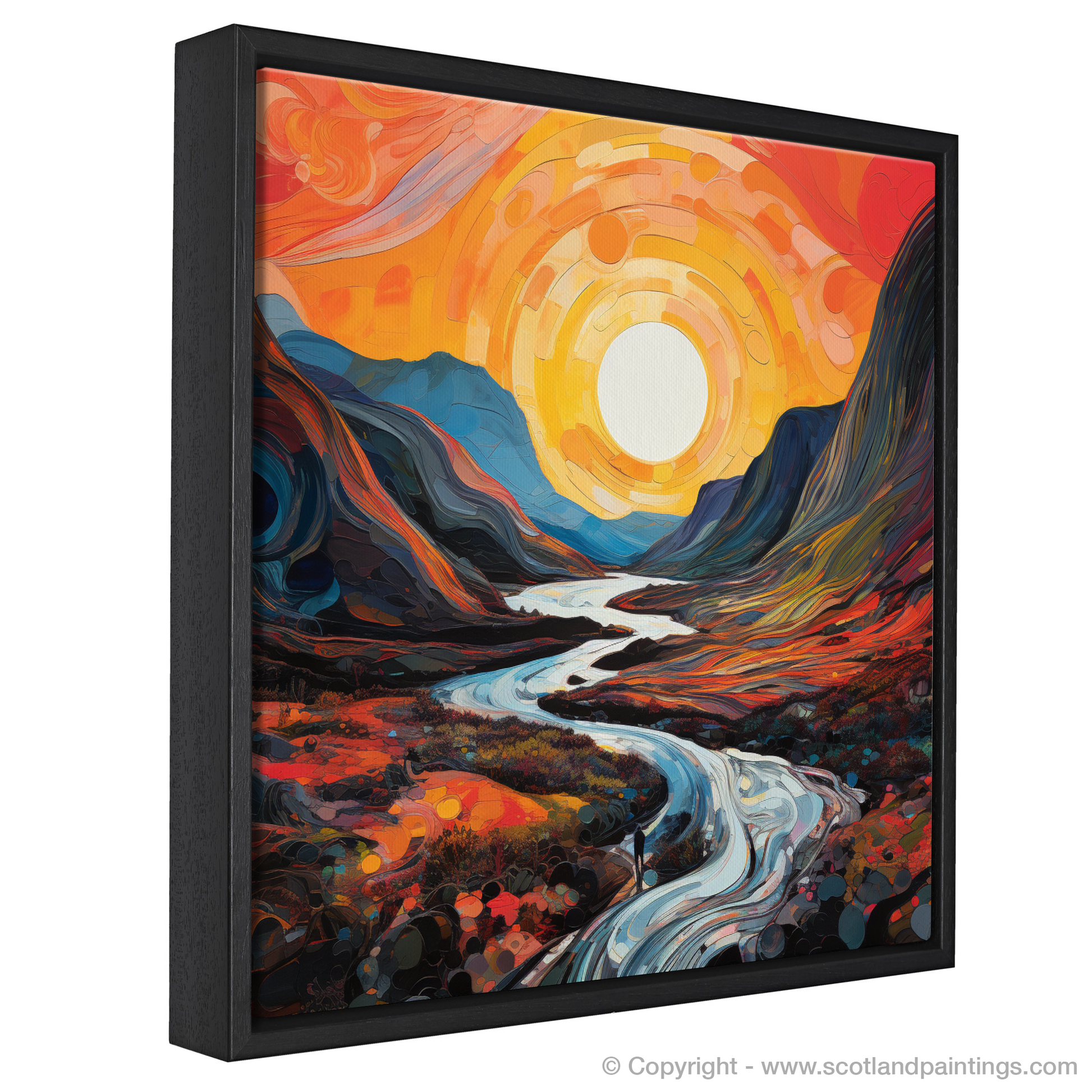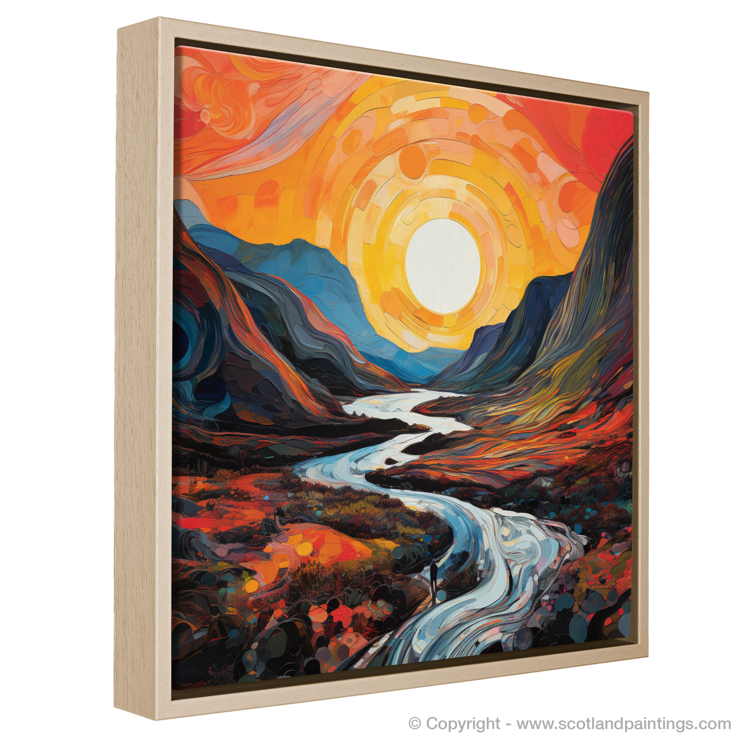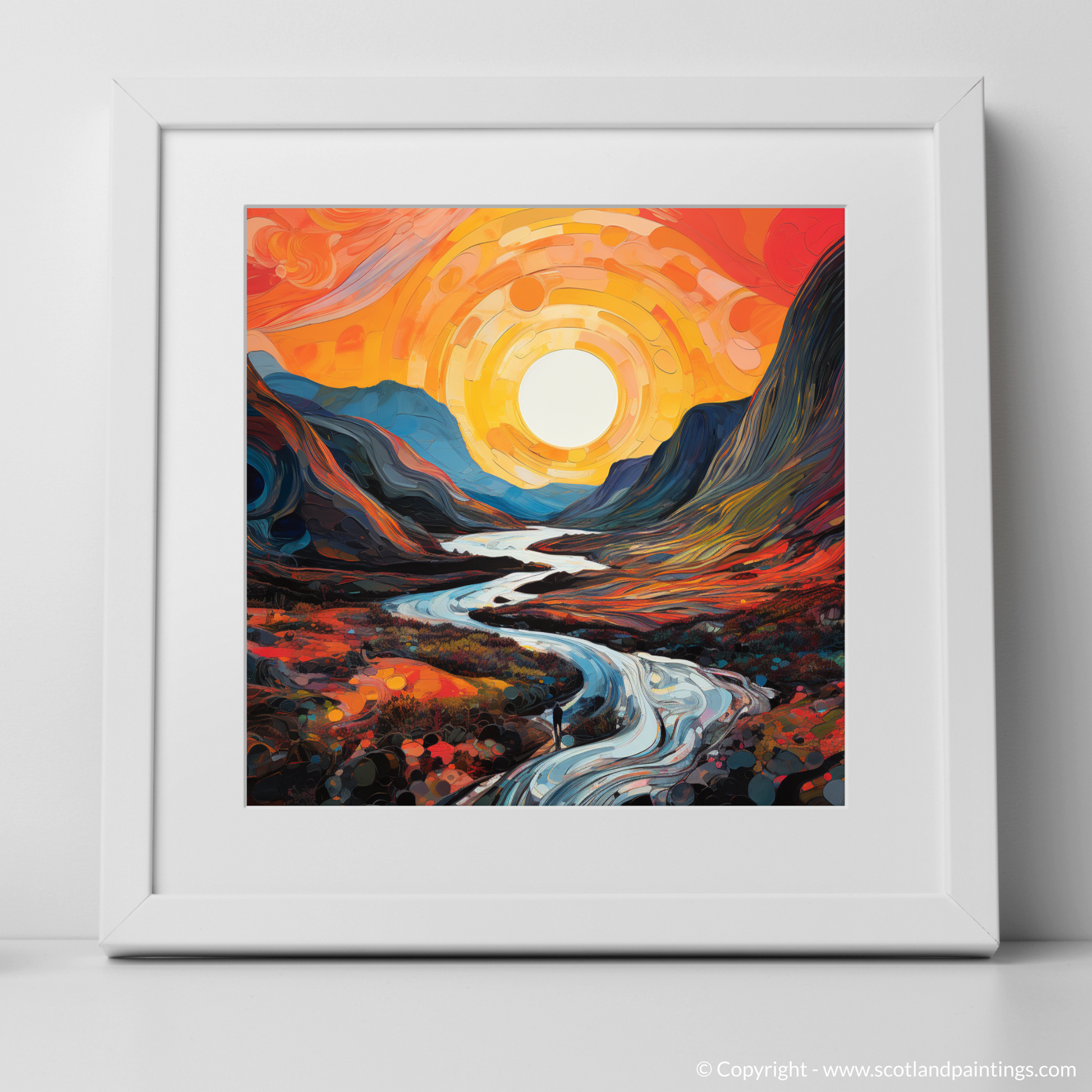 Awash with the fiery hues of a Glencoe sunrise, this captivating print invites the viewer to immerse themselves in a realm where reality is reimagined through the lens of abstraction. At the heart of the composition, a radiant sun bursts forth in a spectacular show of colours, from warm amber to rich crimson, swirling into the sky in concentric circles that evoke the profound depth of the cosmos.