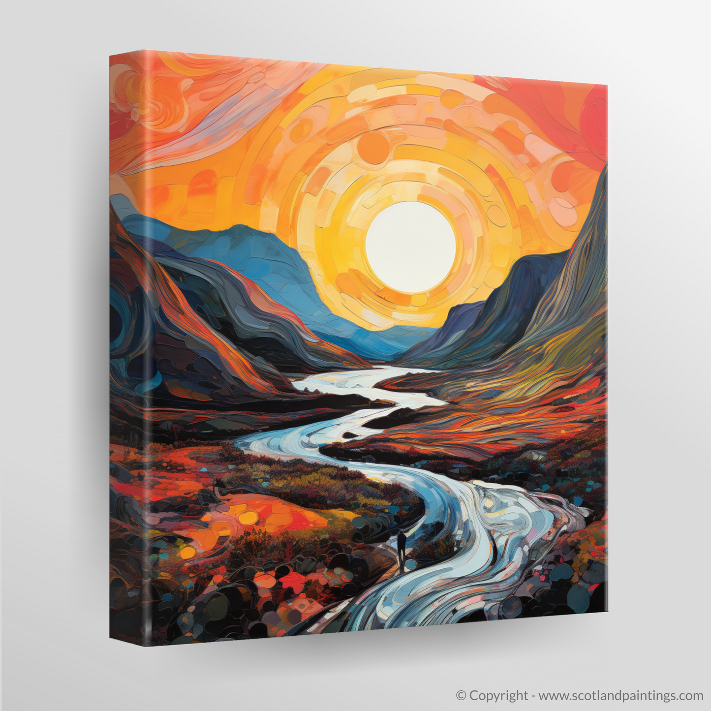 The landscape itself is transformed into a flowing mosaic of vibrant colours and bold, expressive strokes, suggesting the undulating contours of hills and the meandering path of the river. The abstract representation distills the essence of the natural scene, capturing not just the visual splendour, but the emotional resonance of a sunrise over the iconic Buachaille.