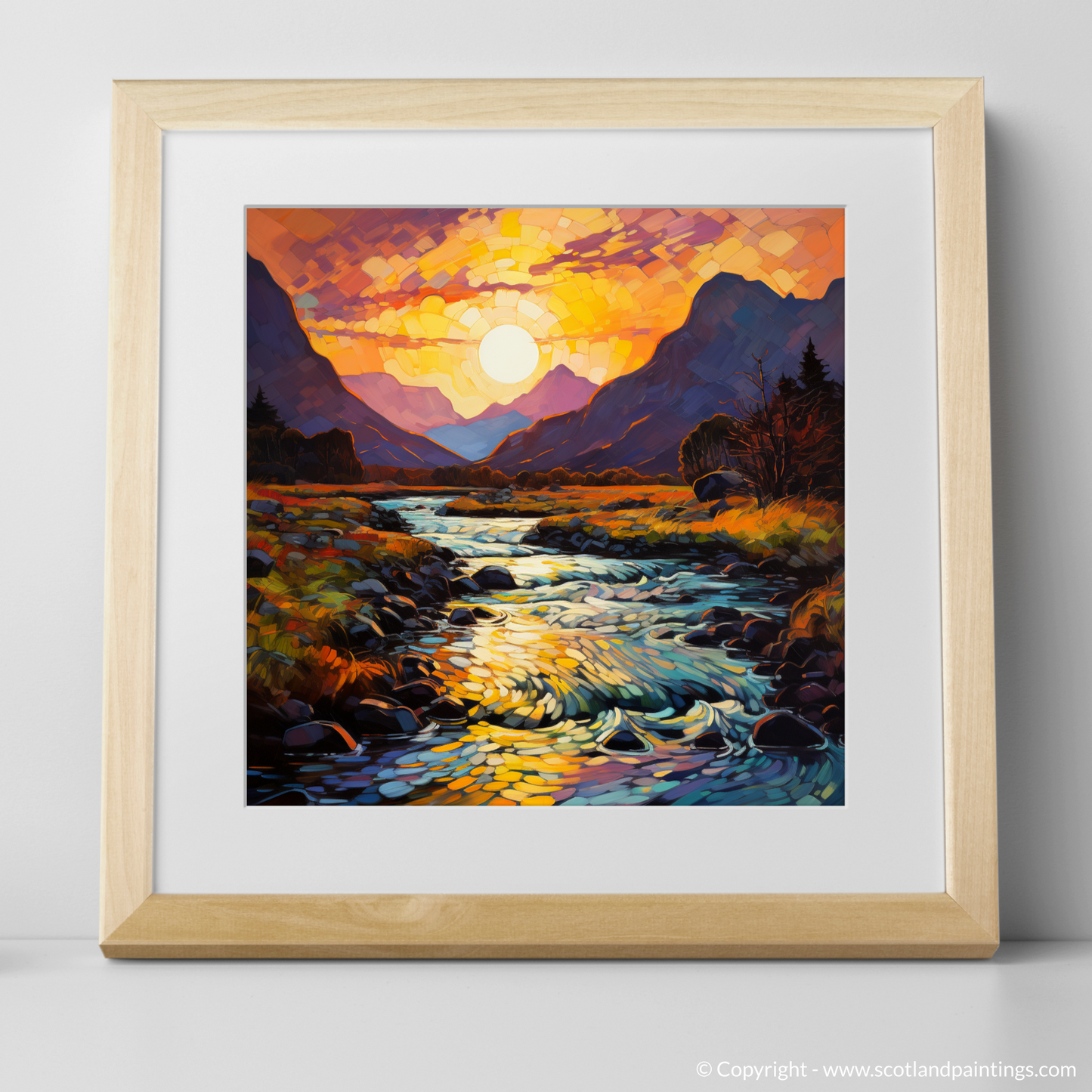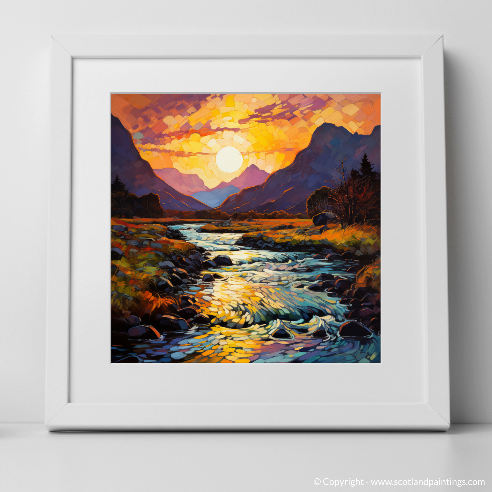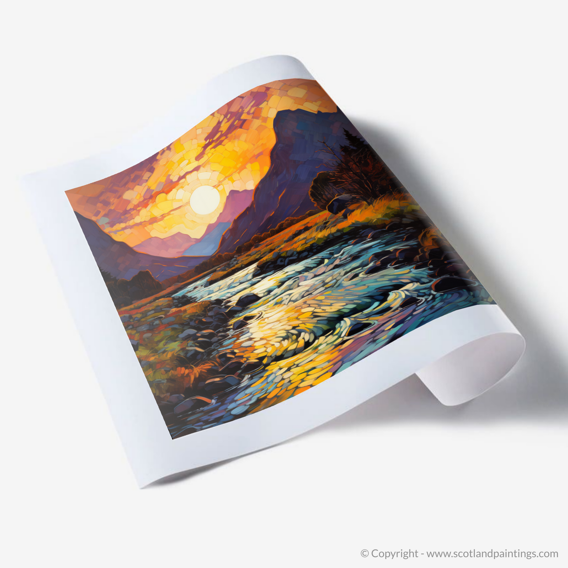 Immerse yourself in the vivacious hues and the bold expressionism captured in this Fauvist-inspired print of the Serpentine river at golden hour in Glencoe. The piece is awash with a kaleidoscope of oranges, purples, and vivid blues, indicative of the emotionally charged palette famous in Fauvism. The sun, rendered as a dazzling mosaic of light, casts its glow over the land, transforming the sky into a canvas of warm colour gradients that seem to dance before your eyes.