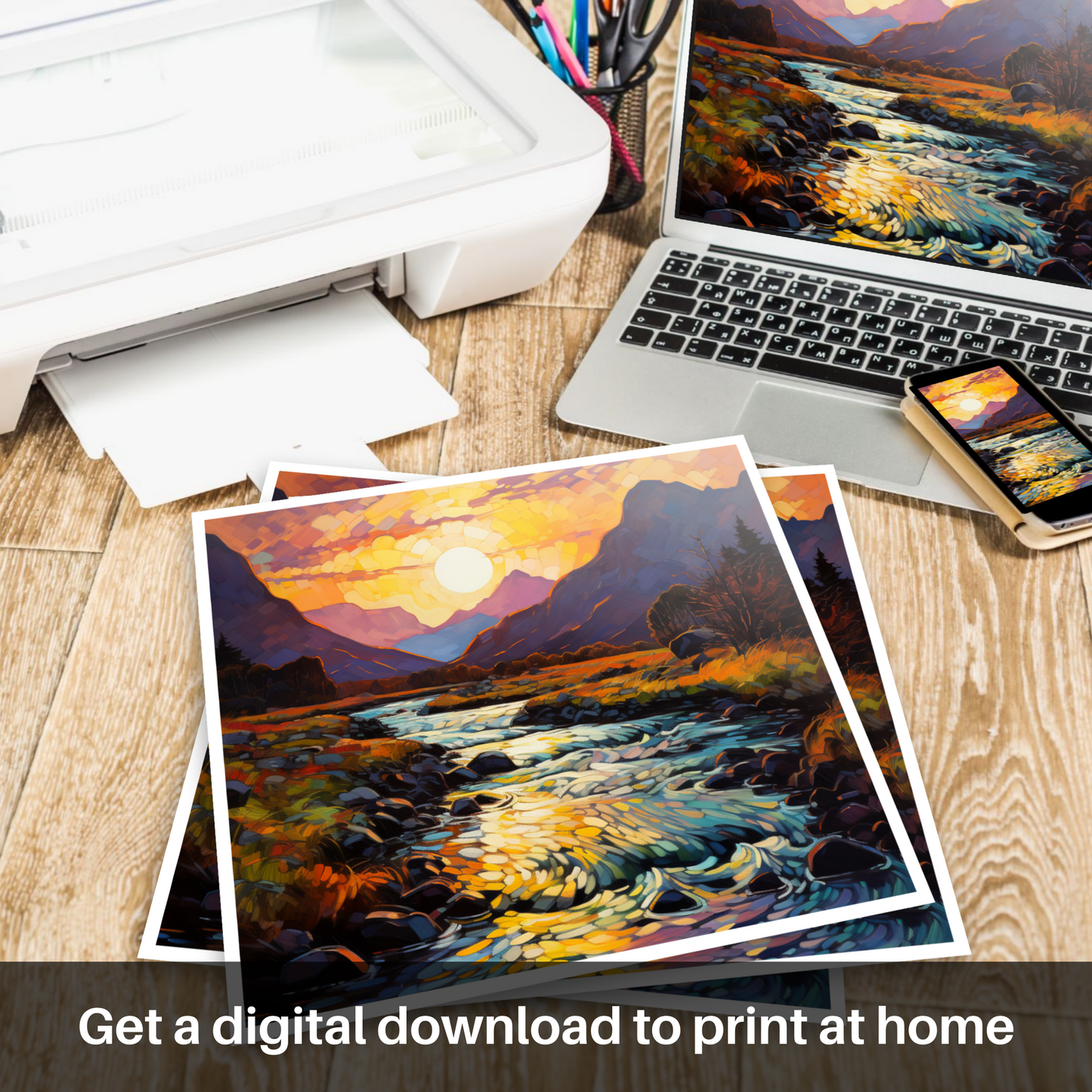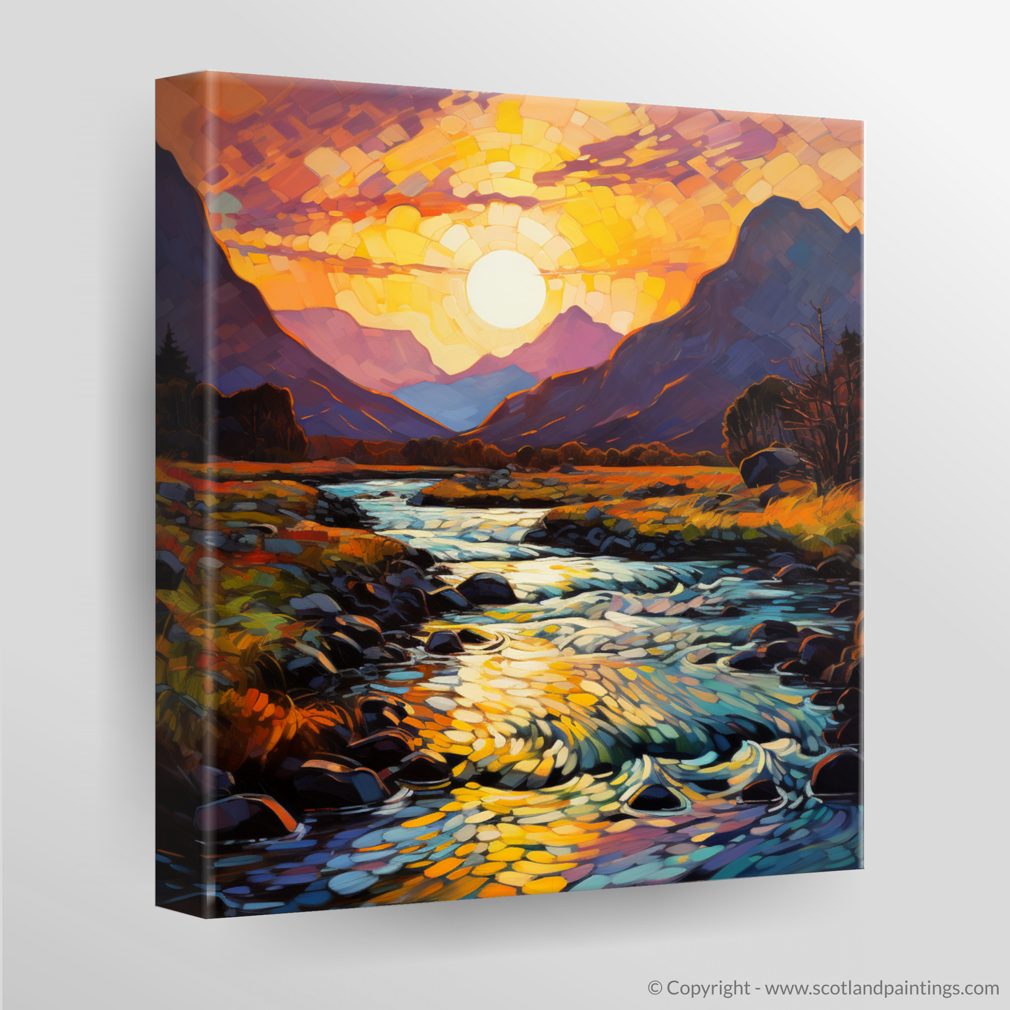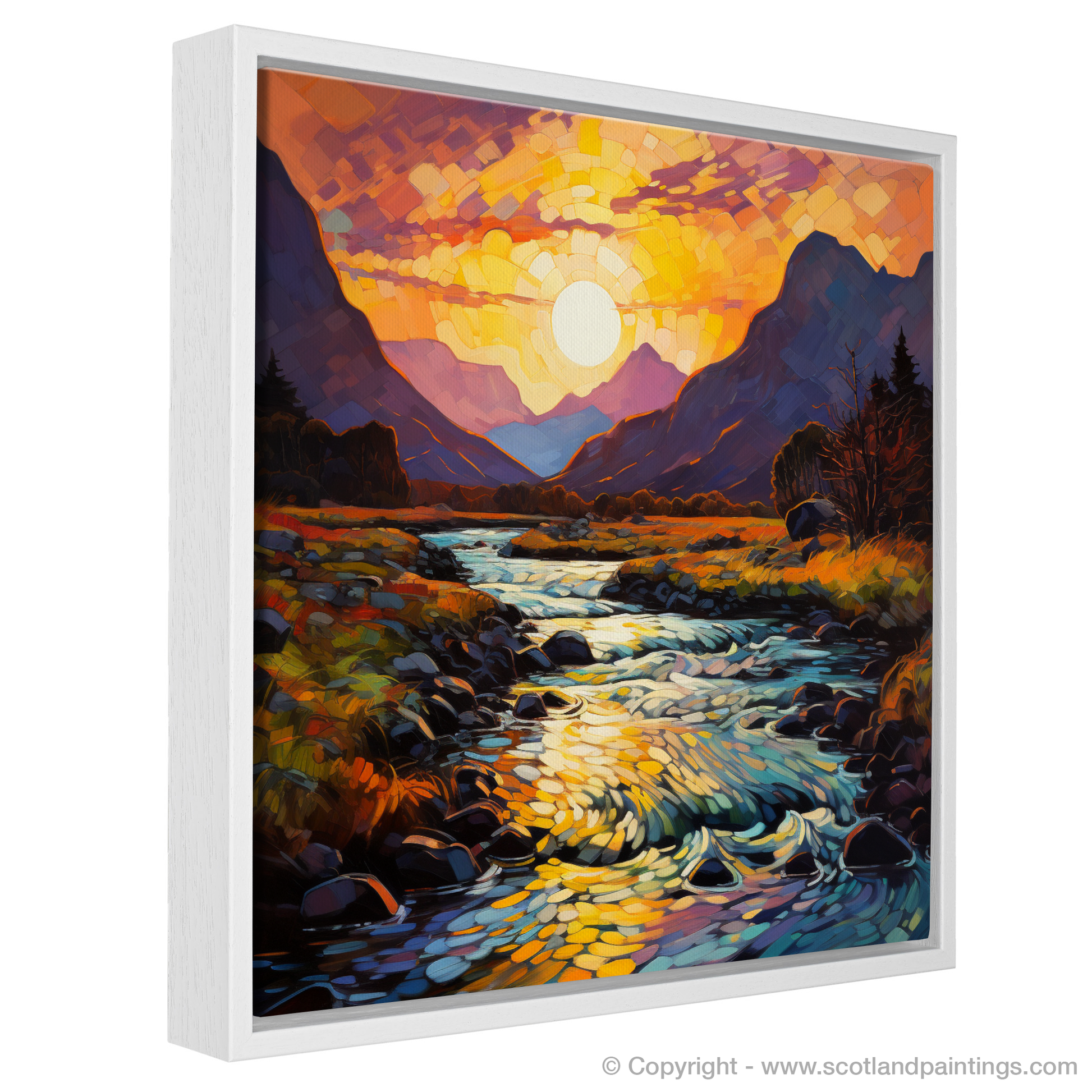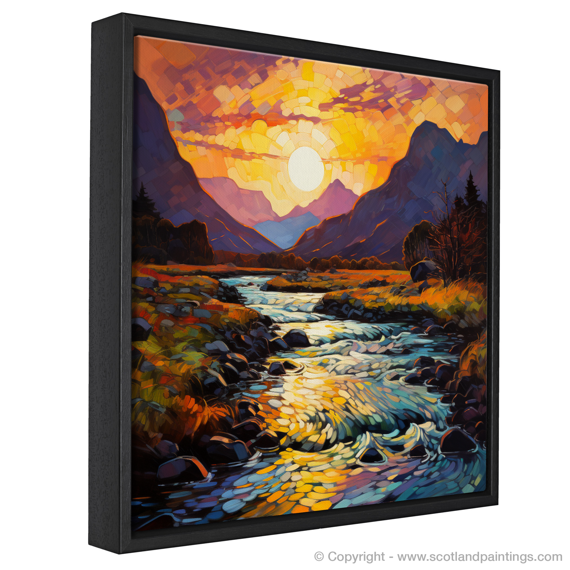 Immerse yourself in the vivacious hues and the bold expressionism captured in this Fauvist-inspired print of the Serpentine river at golden hour in Glencoe. The piece is awash with a kaleidoscope of oranges, purples, and vivid blues, indicative of the emotionally charged palette famous in Fauvism. The sun, rendered as a dazzling mosaic of light, casts its glow over the land, transforming the sky into a canvas of warm colour gradients that seem to dance before your eyes.