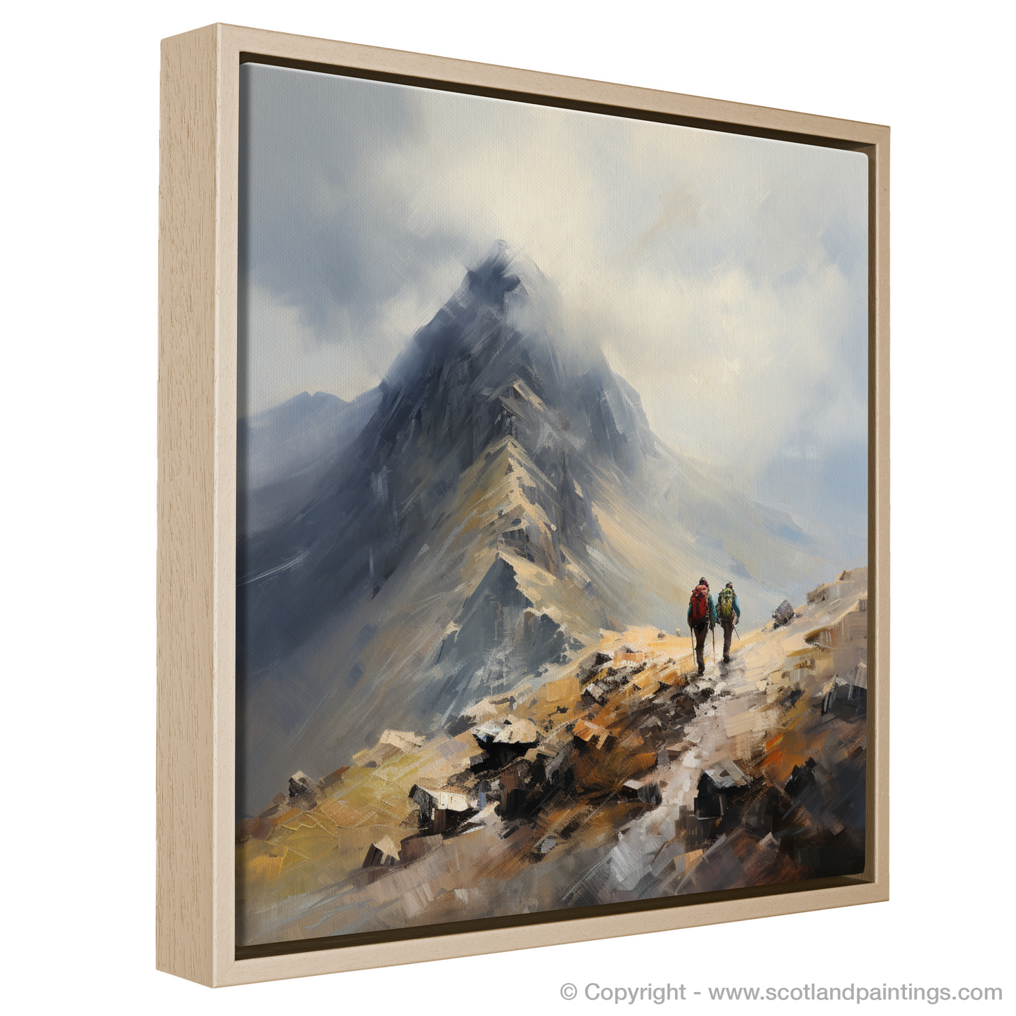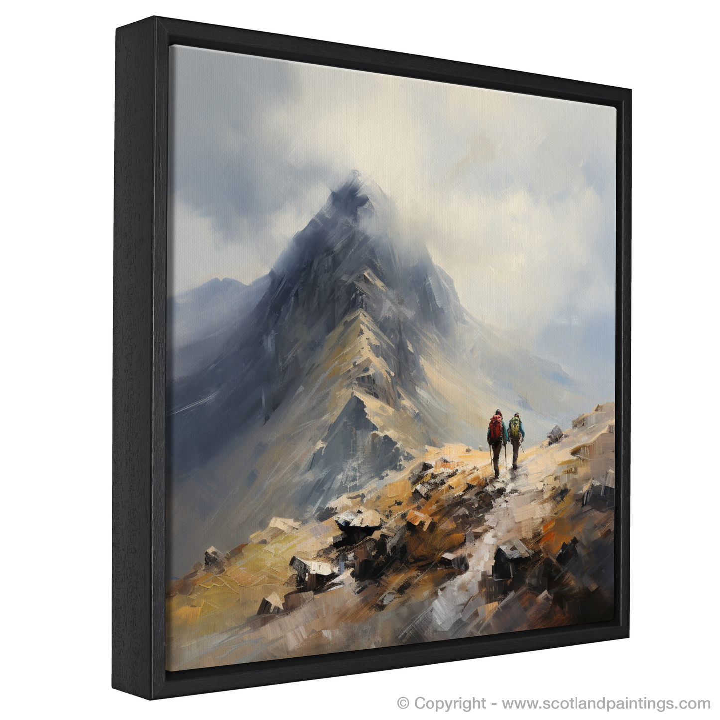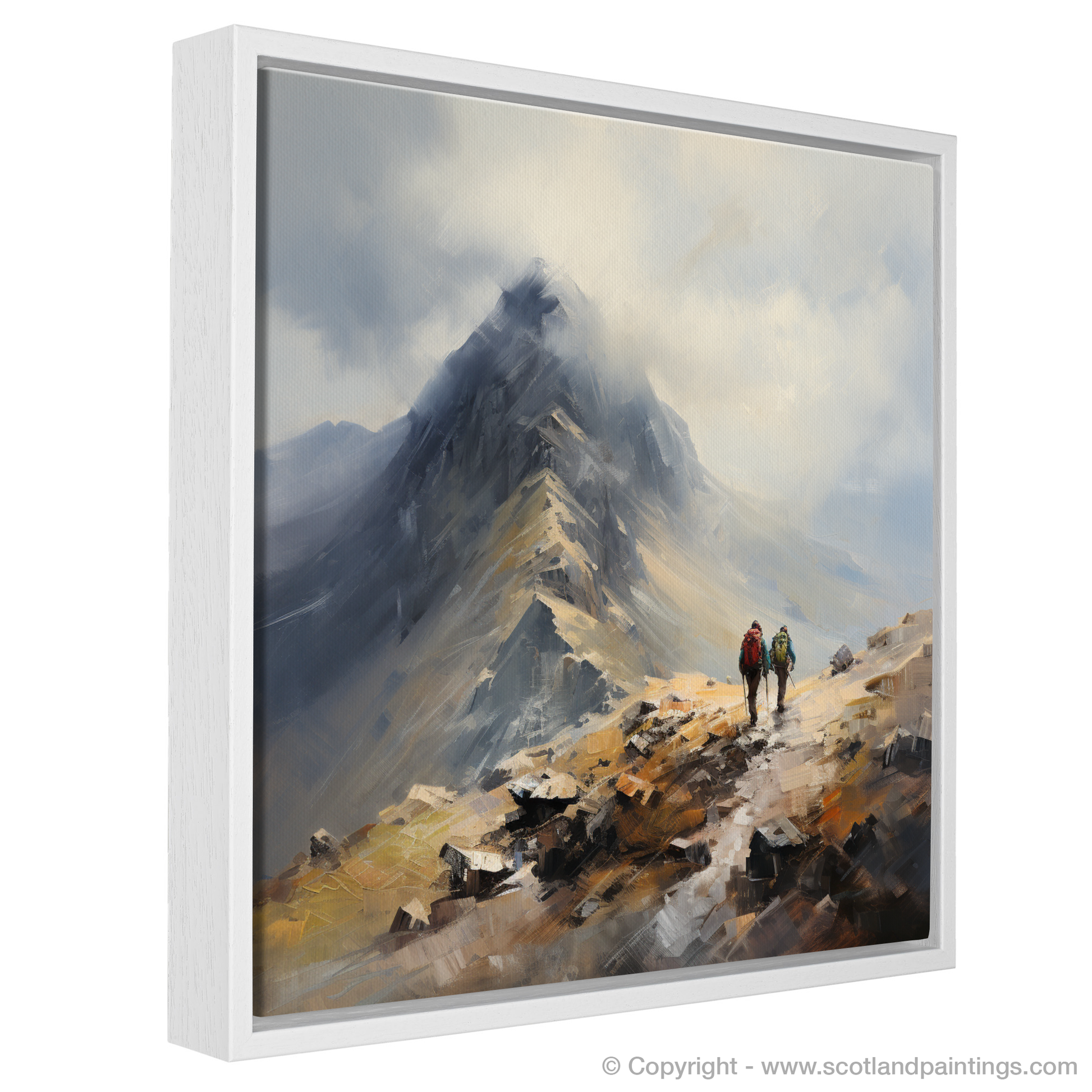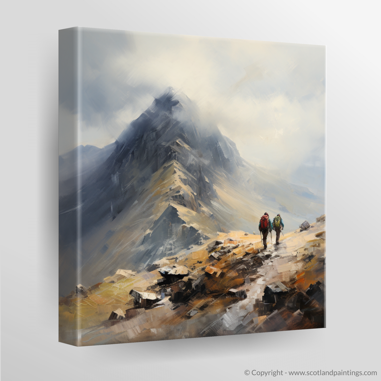 Immerse yourself in the rugged beauty of the Scottish Highlands with this evocative print capturing the essence of adventure in Glencoe's majestic landscape. Two hikers, rendered in impressionistic detail, are depicted on their journey towards the Buachaille summit, a beacon of inspiration for enthusiasts of the great outdoors.