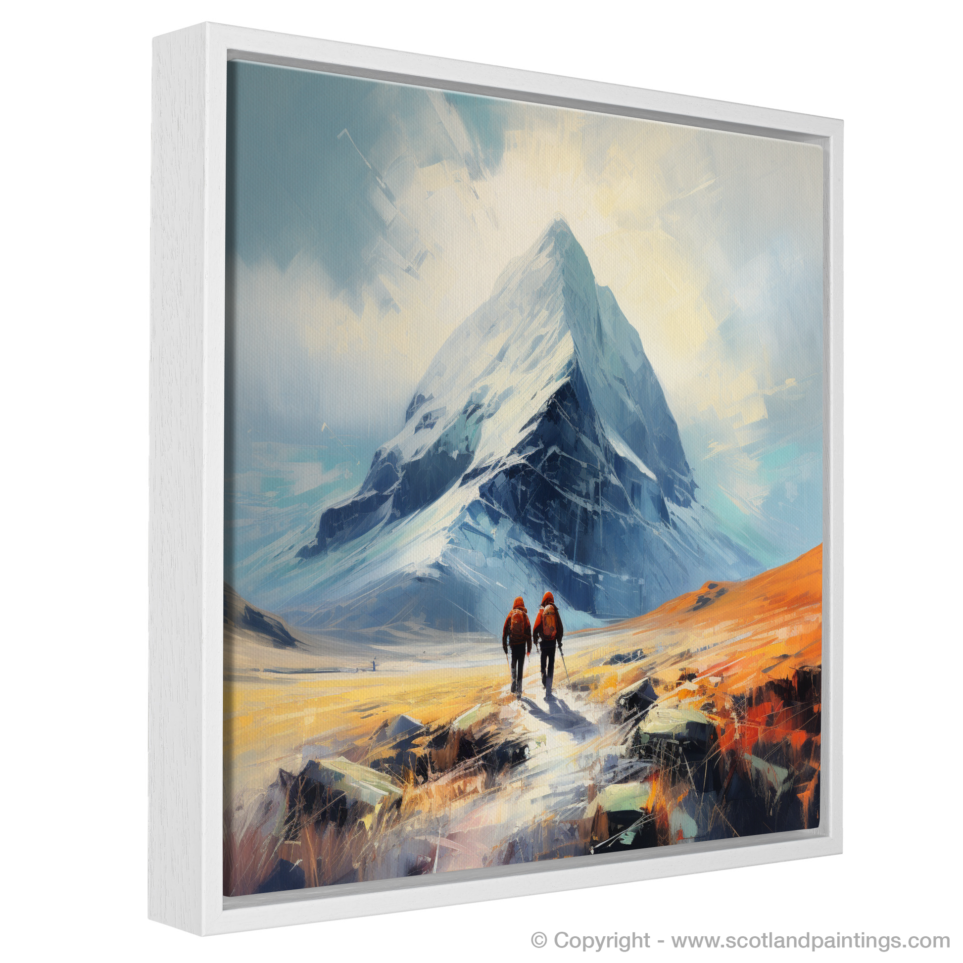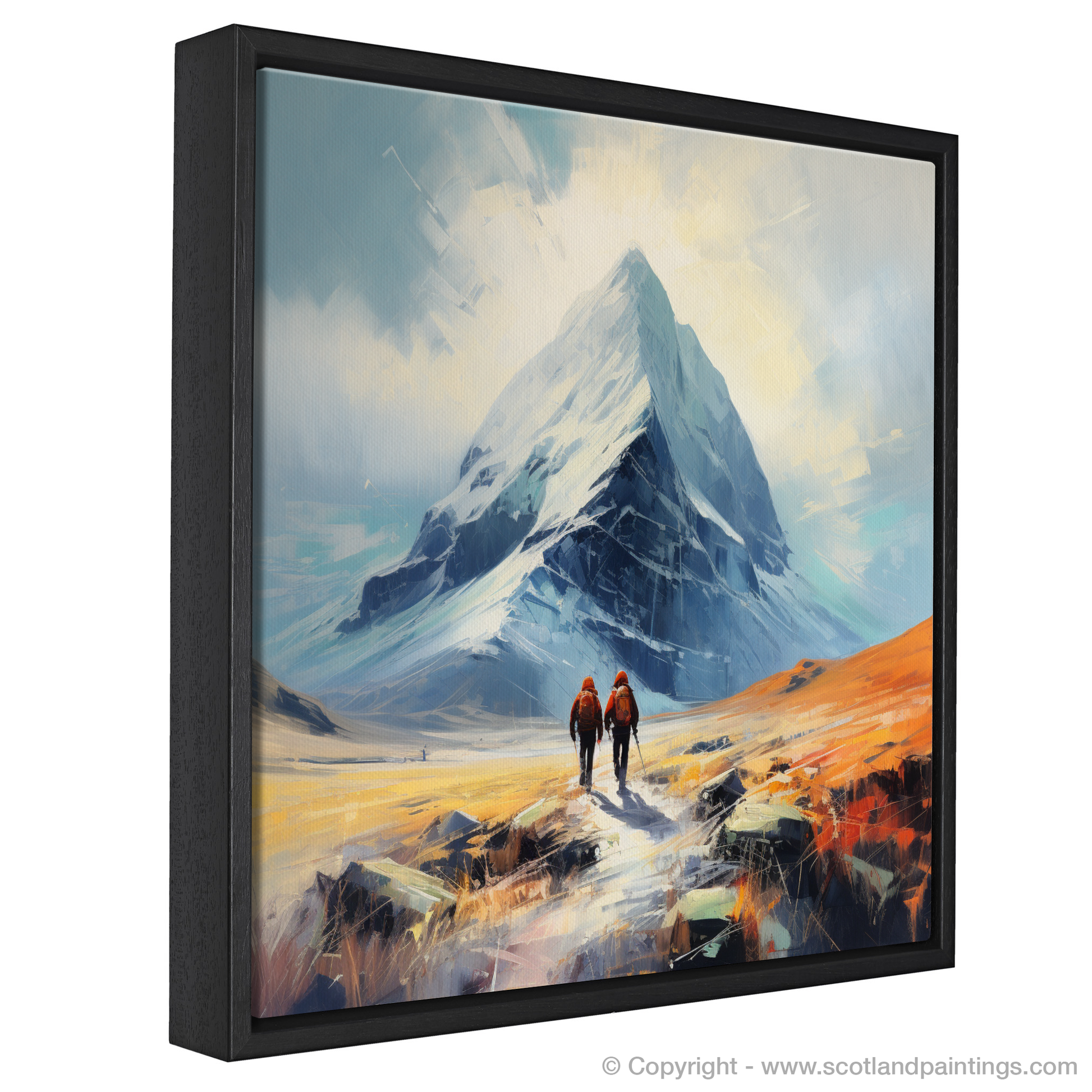 Embark on a visual odyssey to the Scottish Highlands with this stirring abstract interpretation of hikers ascending the majestic Buachaille summit in Glencoe. Swirls of vibrant colour capture the transient beauty of light cascading down the mountain’s icy facade, offering a fresh and dynamic perspective of this awe-inspiring landscape.