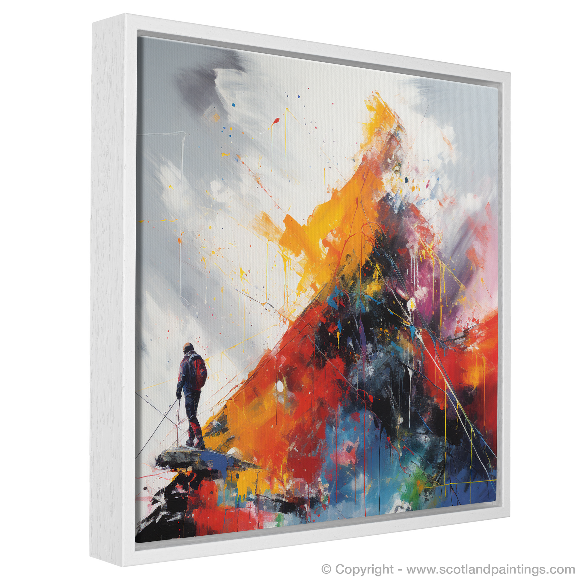 Explosive splatters and swirling lines of paint add a palpable sense of movement to the scene, breathing life into the misty peaks as if the very elements of wind and rain have left their mark upon the canvas. Arcs of brilliant white and soft grey mimic the enveloping mists for which Glencoe is famed, while sharp streaks of black and navy evoke the formidable cliffs and crevices, challenging the climber to forge ahead.
