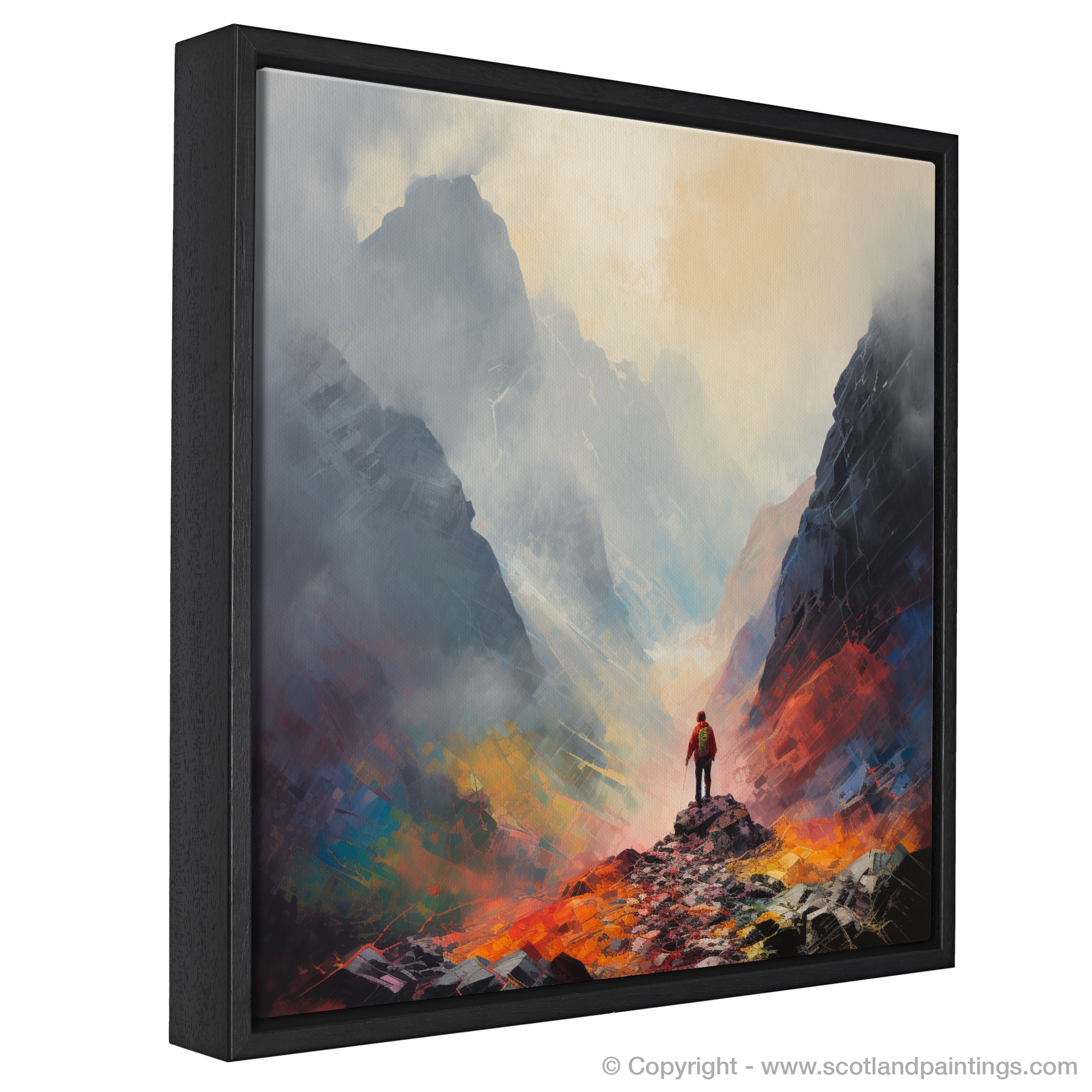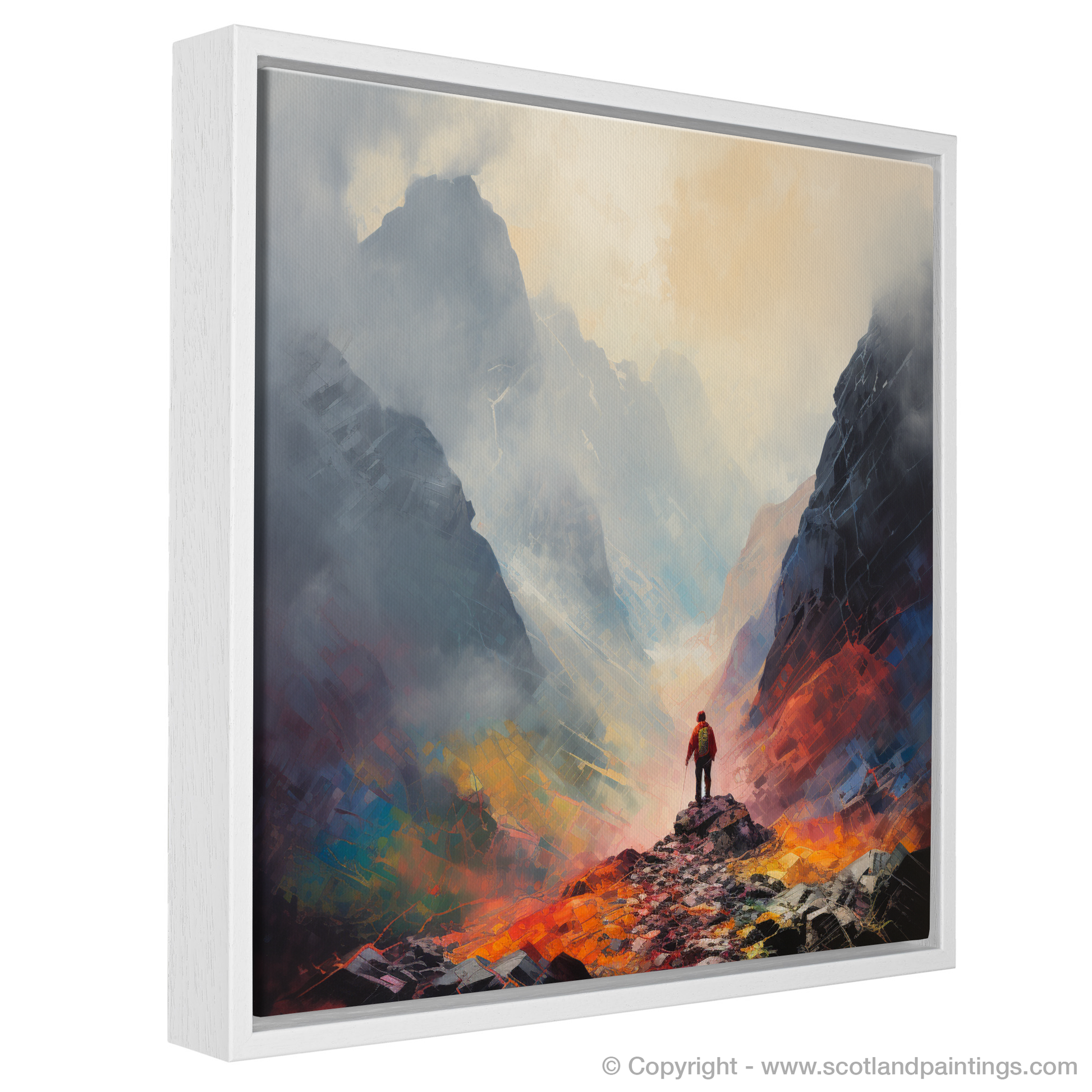 Employing a striking palette of fiery oranges, deep reds, and cooling blues, the artwork brings the mystical atmosphere of the misty highlands to life. Swathes of whites and greys evoke the crisp, damp Scottish air, while brushstrokes of black suggest the profound depths and textures of the rocky terrain.