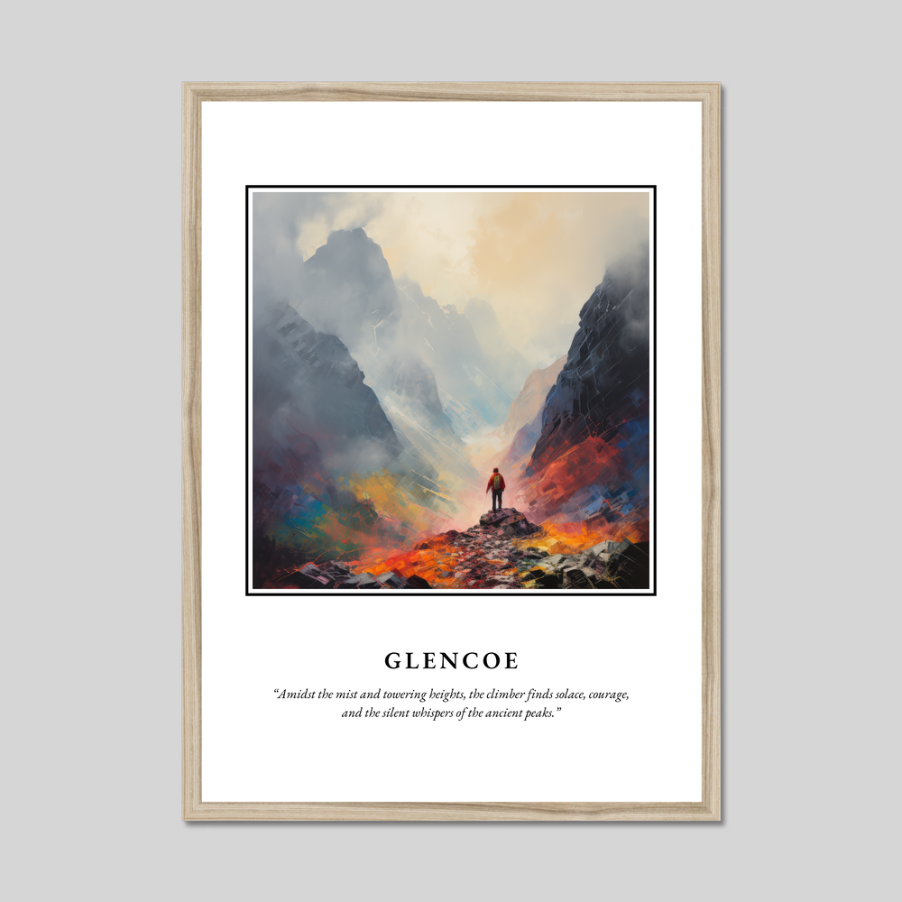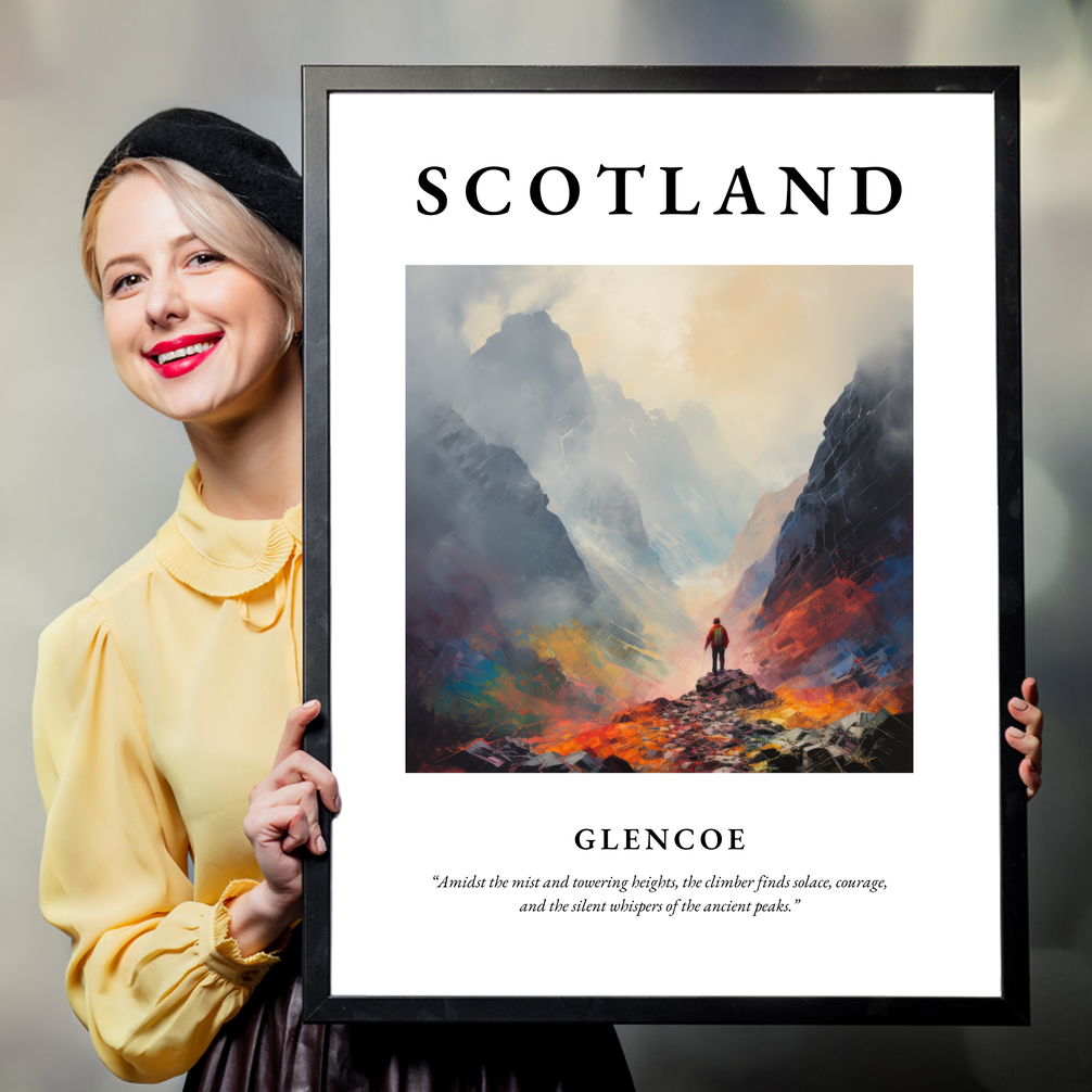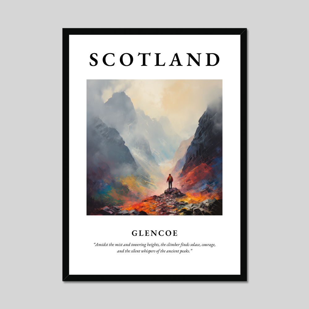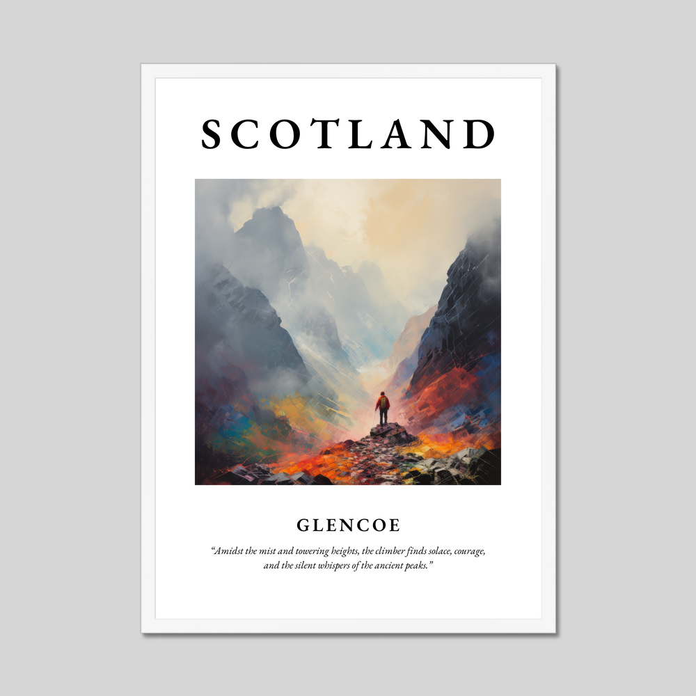 The poster begins with the bold declaration of "SCOTLAND" at the top, setting the stage for the vivid journey through Glencoe's iconic landscape. The painting itself bursts with dynamic colours and geometric forms, capturing the essence of Glencoe's rugged peaks and misty allure. Below the artwork, a thoughtful quote invites reflection: “Amidst the mist and towering heights, the climber finds solace, courage, and the silent whispers of the ancient peaks.” This narrative resonates with those who cherish Scotland's natural beauty, as well as lovers of contemporary art and the pop art style.