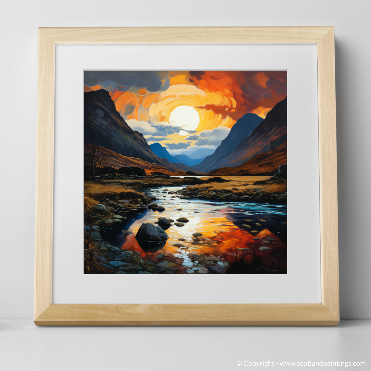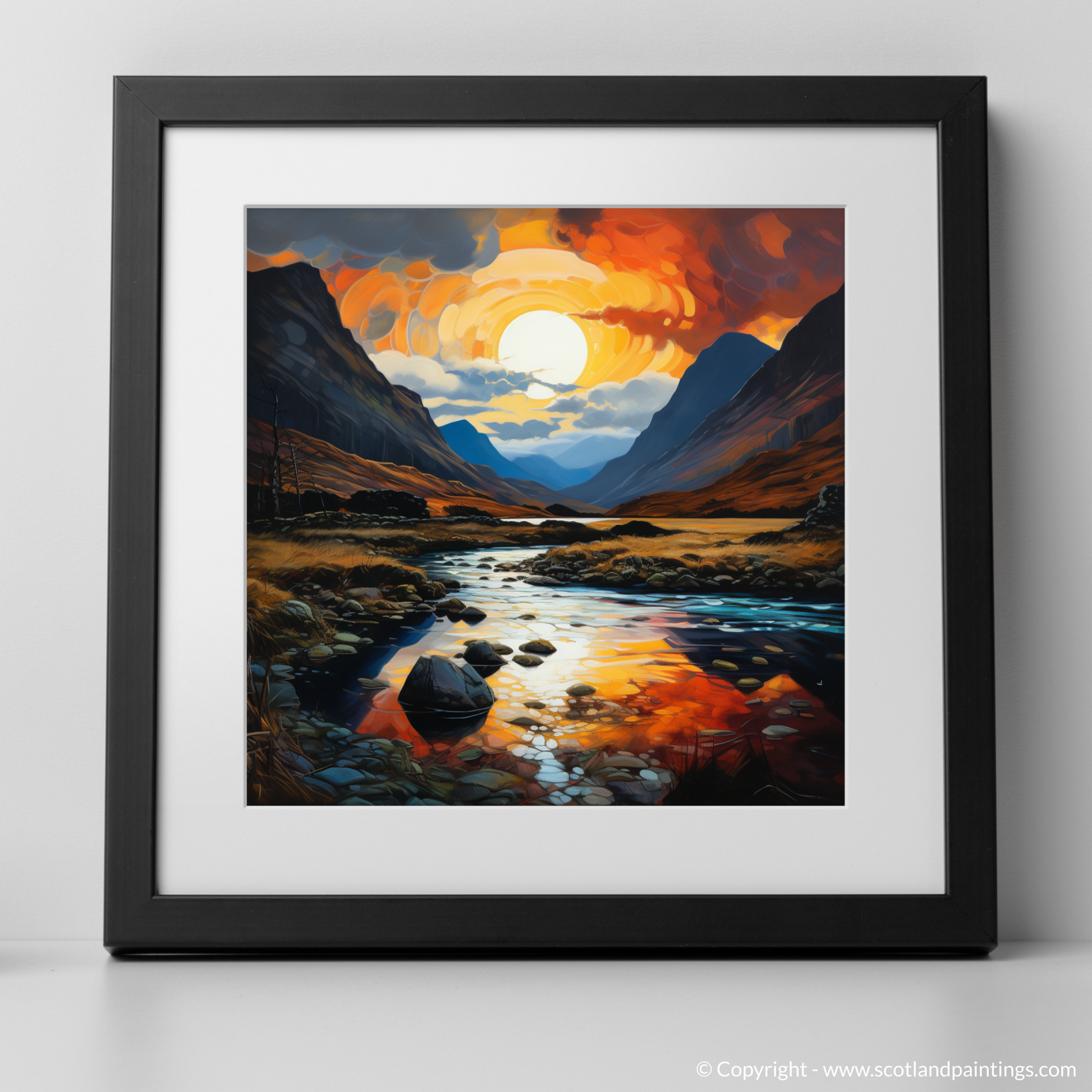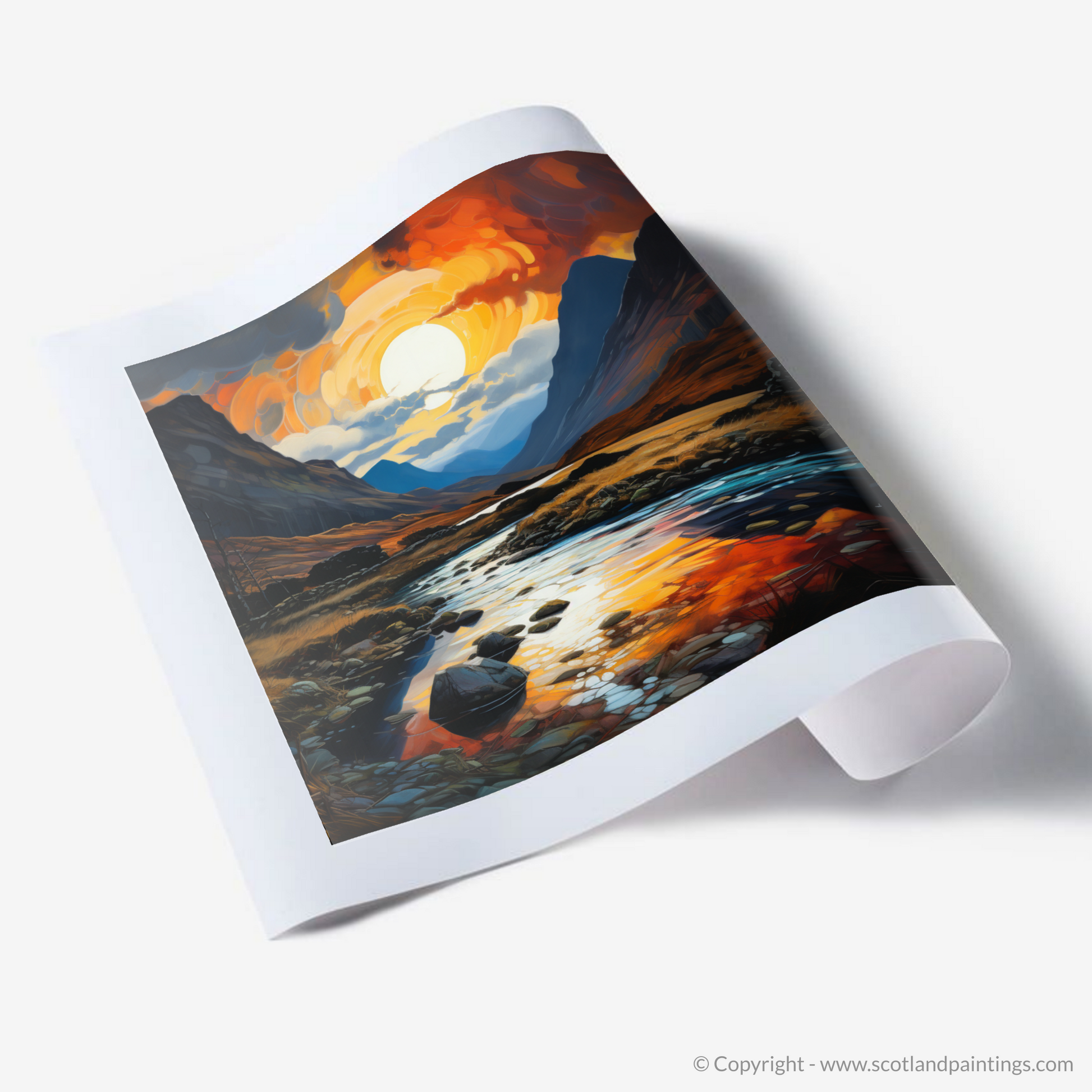 As the sun dips towards the horizon, casting a luminous tapestry of warm hues, this exquisite print captures a moment of sheer atmospheric drama in the heart of Glencoe. Embracing the bold facets and angular forms characteristic of Cubism, this piece reimagines Scotland's untamed beauty through a fragmented lens, presenting the raw grandeur of the landscape in a symphony of abstract geometries.