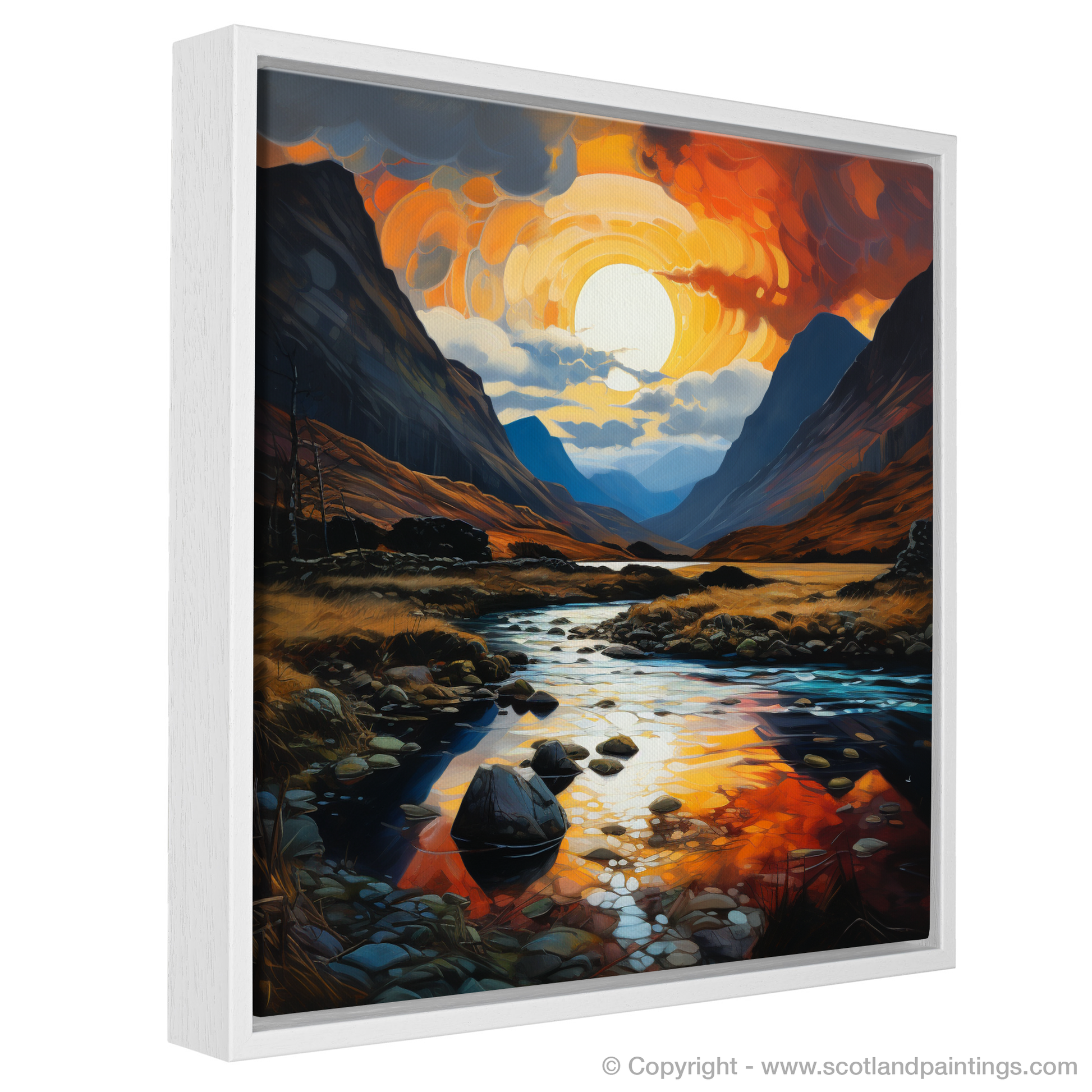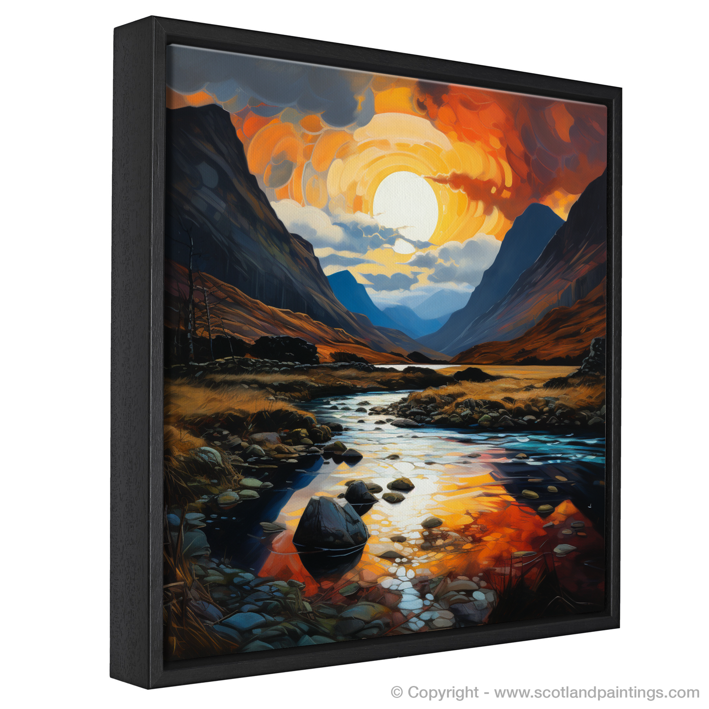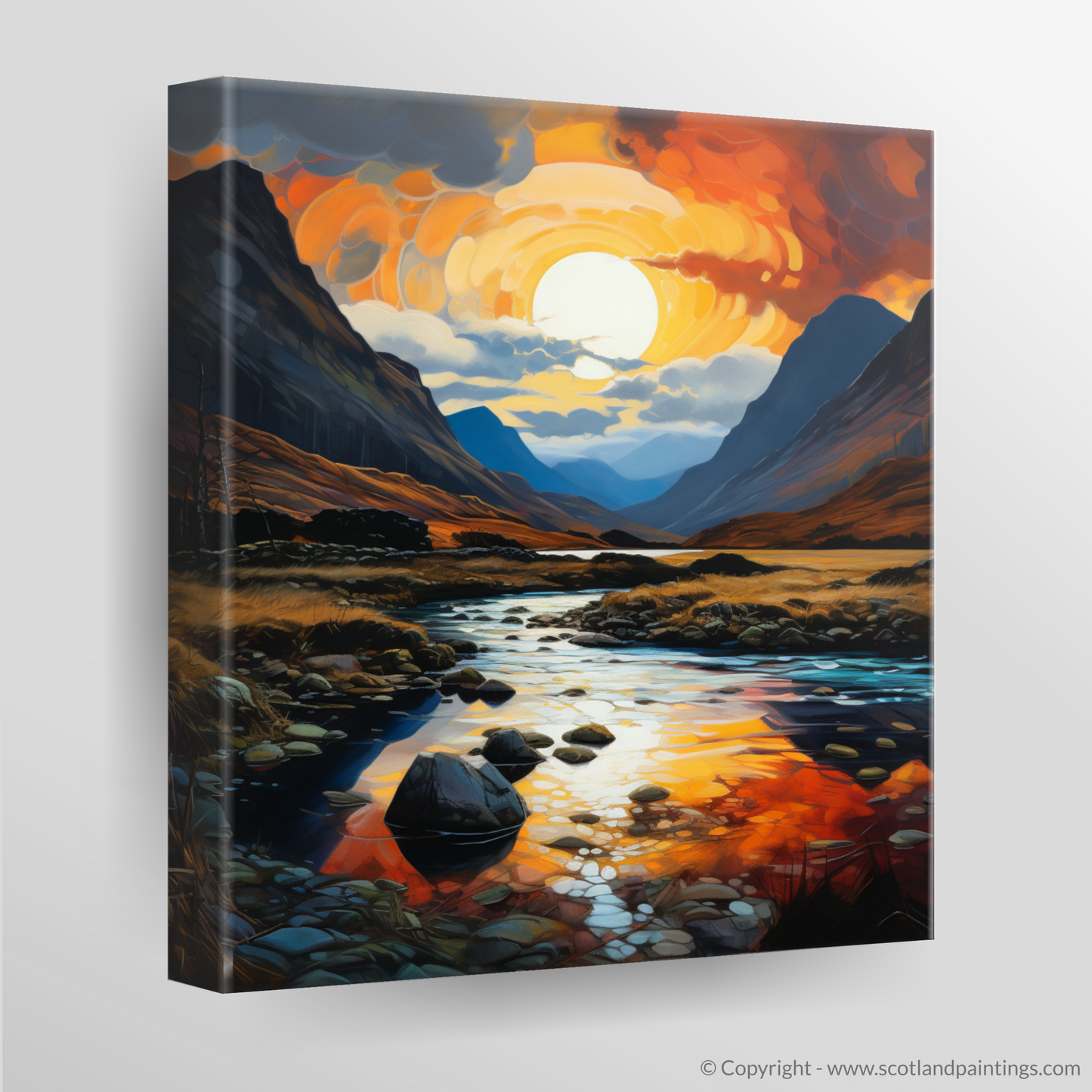 As the sun dips towards the horizon, casting a luminous tapestry of warm hues, this exquisite print captures a moment of sheer atmospheric drama in the heart of Glencoe. Embracing the bold facets and angular forms characteristic of Cubism, this piece reimagines Scotland's untamed beauty through a fragmented lens, presenting the raw grandeur of the landscape in a symphony of abstract geometries.
