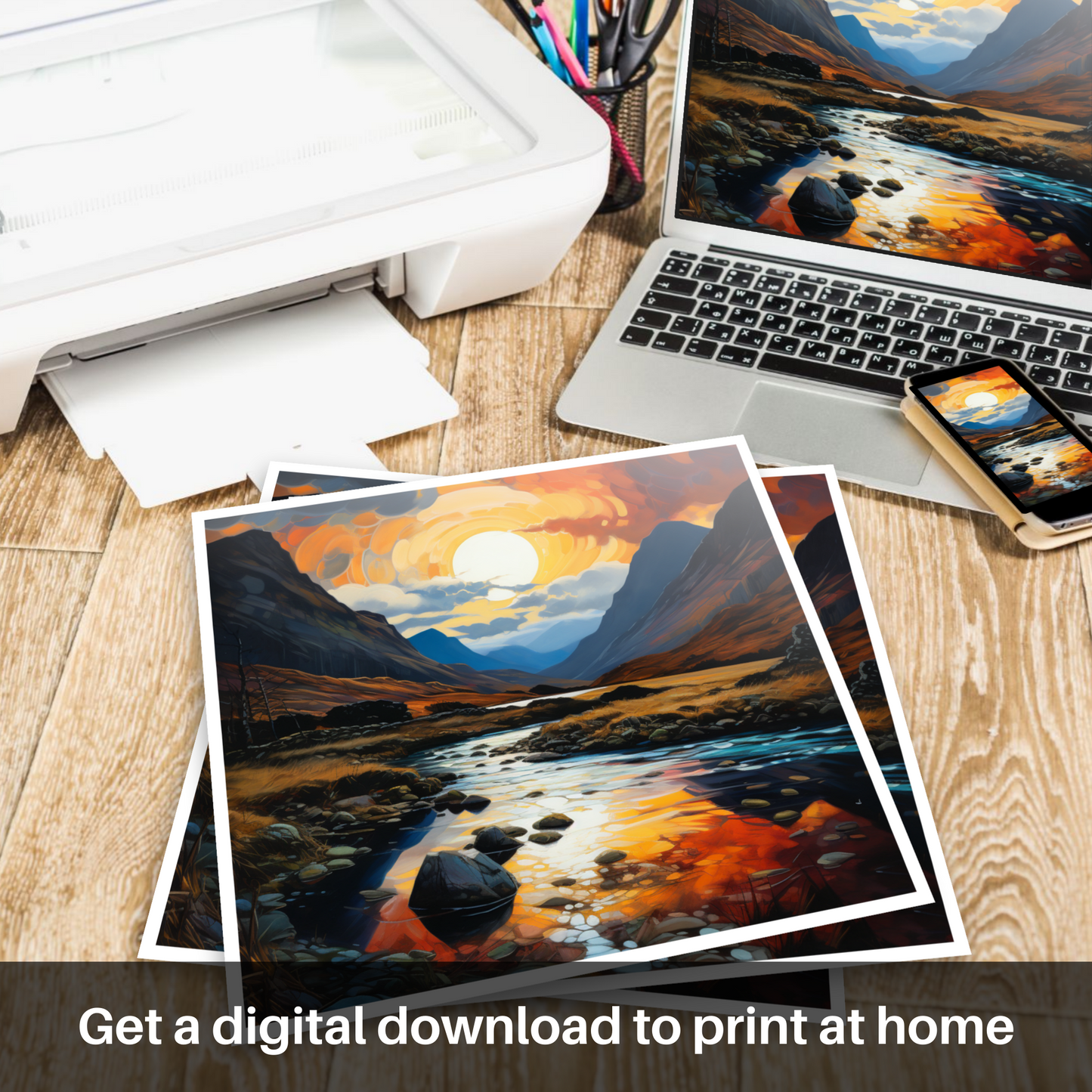 This print is a modern homage to a timeless land, imbuing the raw, elemental spirit of Glencoe with a contemporary edge, and it promises to evoke curiosity and admiration, a captivating statement piece for any admirer of trailblazing art and Scottish allure.