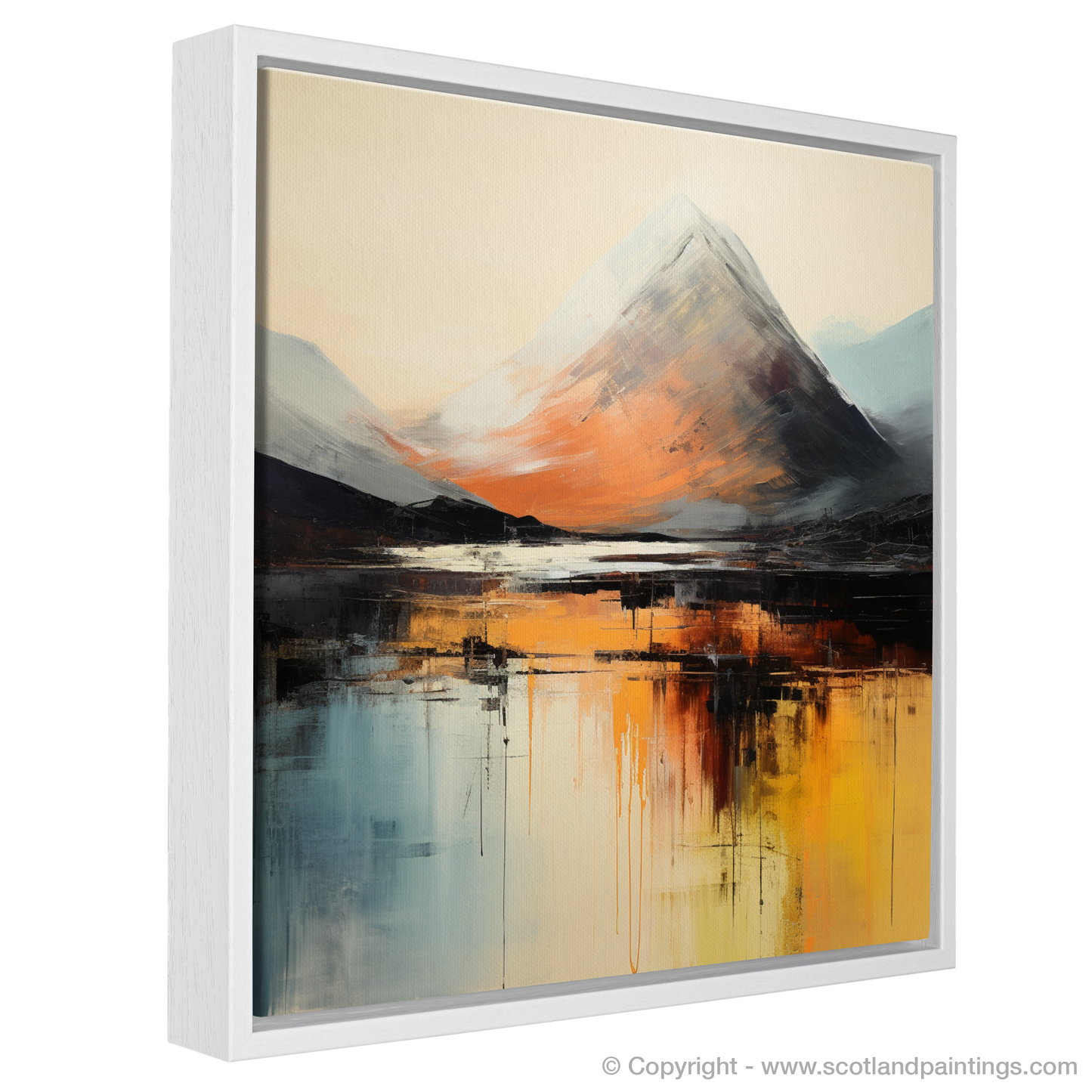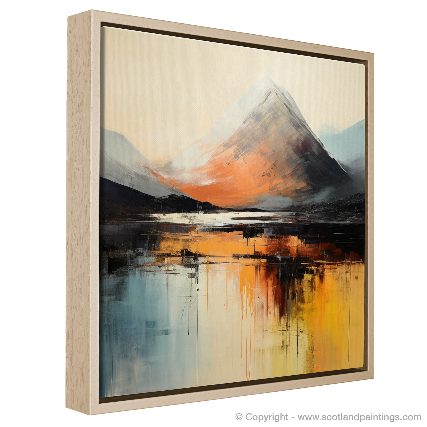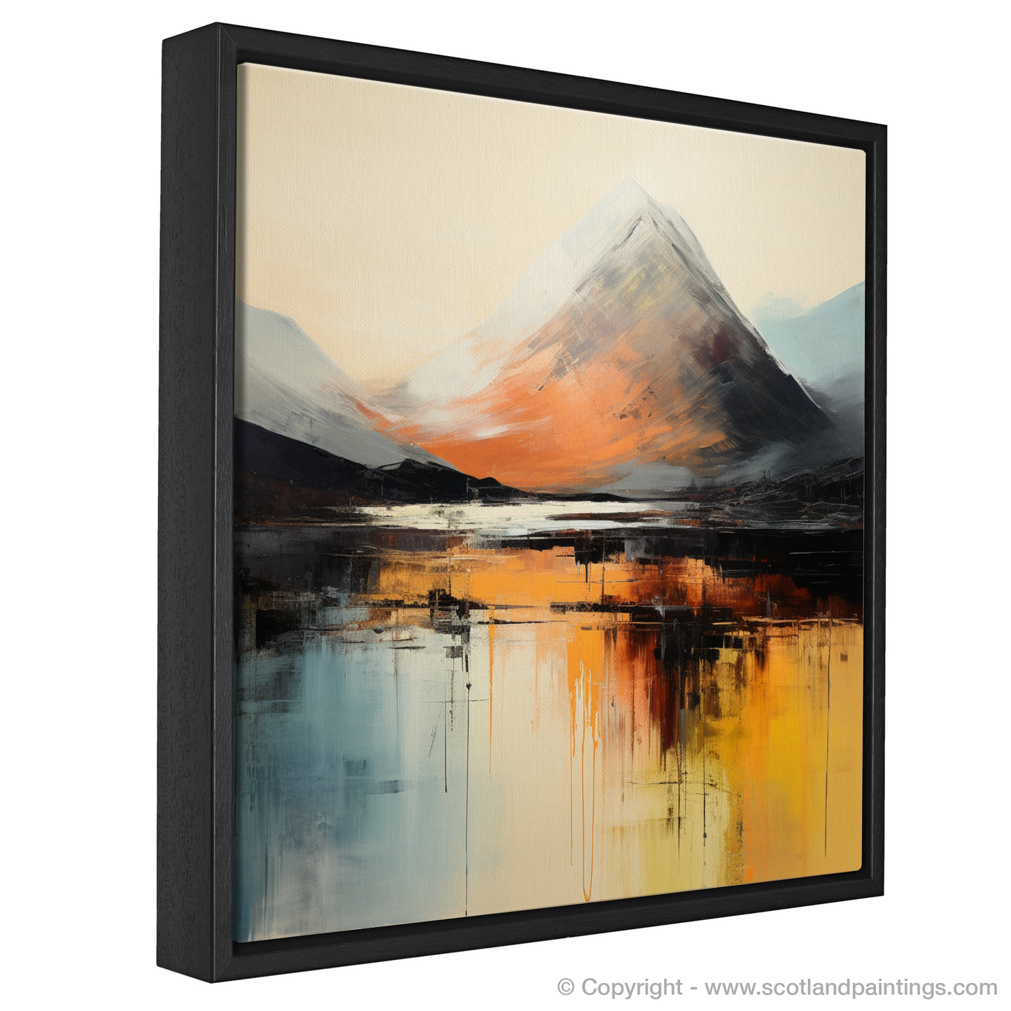 As dawn breaks over the Highlands, the majestic silhouette of Buachaille Etive Mòr emerges in an evocative interplay of light and shadow. This striking abstract interpretation captures the breathtaking essence of Glencoe, immortalising its grandeur in a palette of fiery oranges, calming blues, and stark blacks that dance across the canvas.