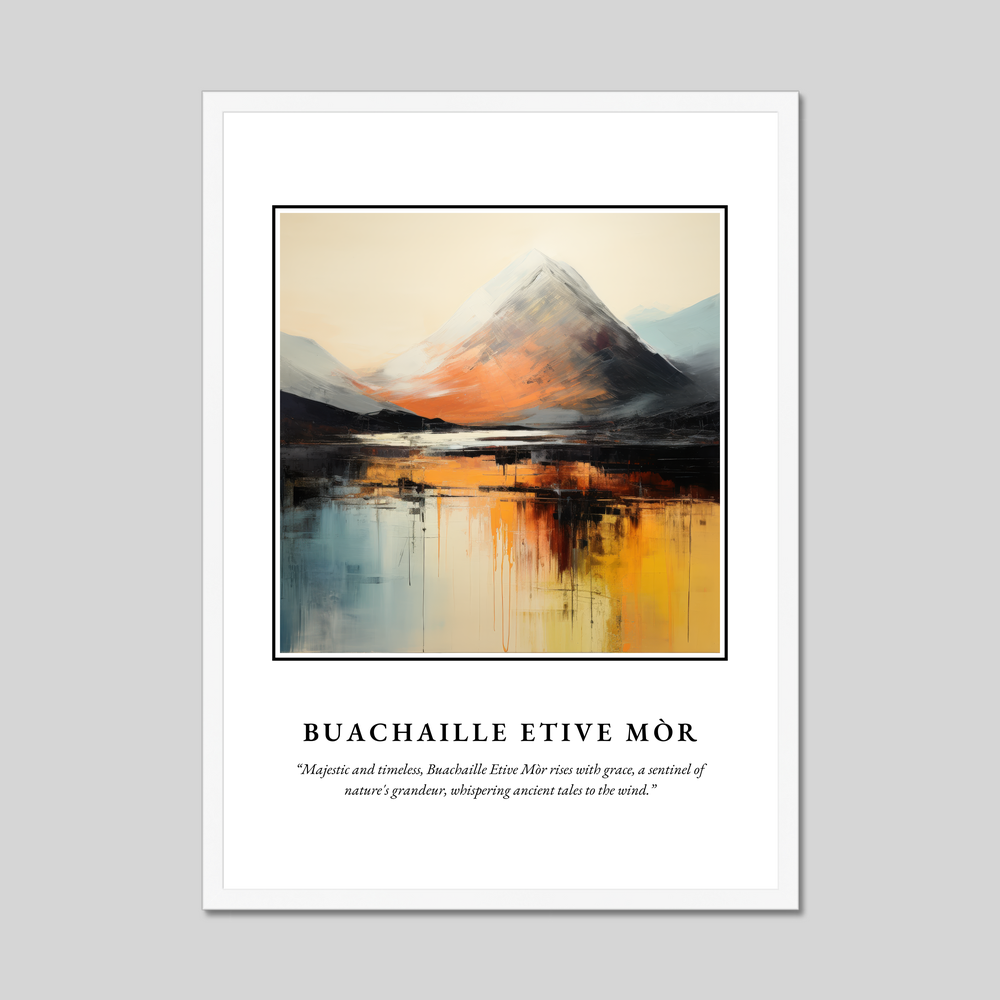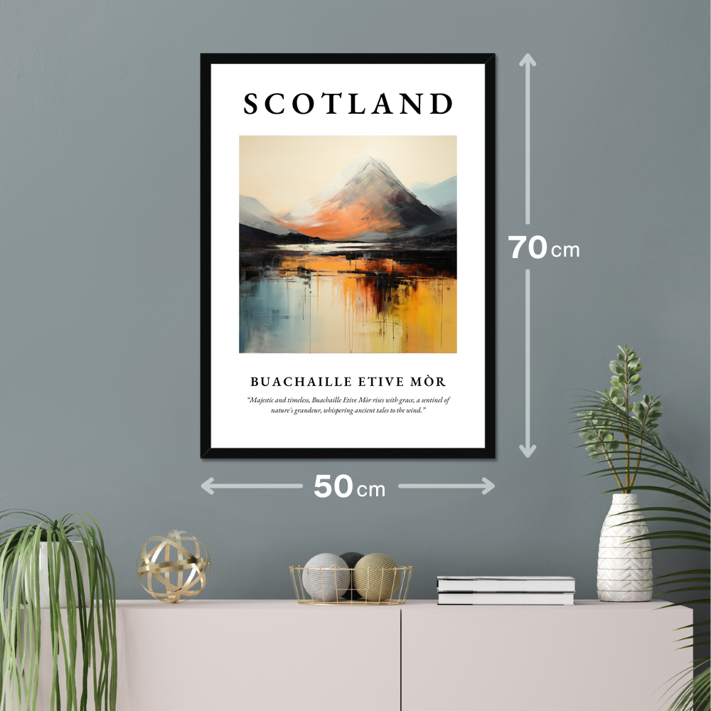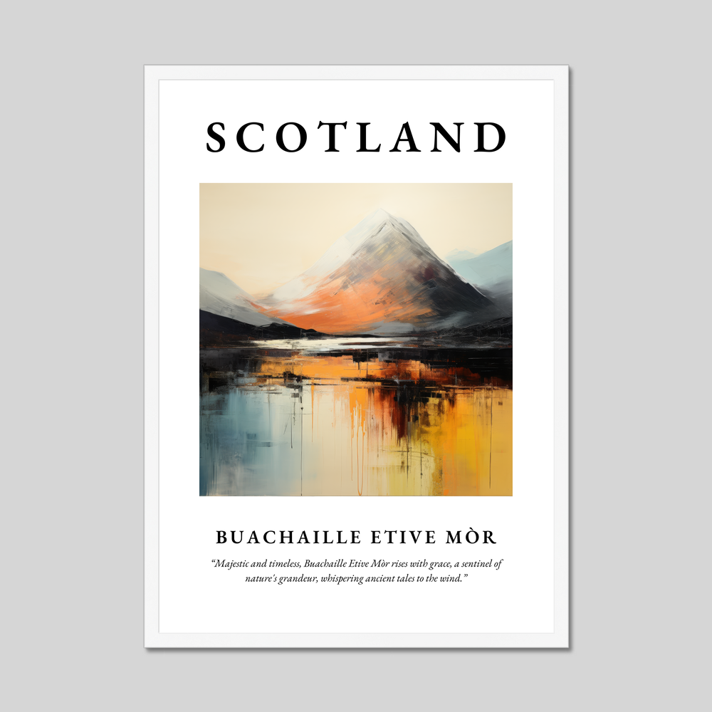 The poster design is bold yet graceful, with "SCOTLAND" emblazoned at the top in commanding lettering. Below, an abstract representation of Buachaille Etive Mòr sweeps across the poster, its rugged peaks rendered in sweeping strokes of fiery orange and cool blue, invoking the dramatic interplay of the natural elements. Beneath this striking portrayal lies the evocative quote: “Majestic and timeless, Buachaille Etive Mòr rises with grace, a sentinel of nature's grandeur, whispering ancient tales to the wind.” This piece is part of our exclusive “Glencoe” collection, perfect for anyone who holds a connection to this iconic landscape or simply appreciates the beauty of abstract art.