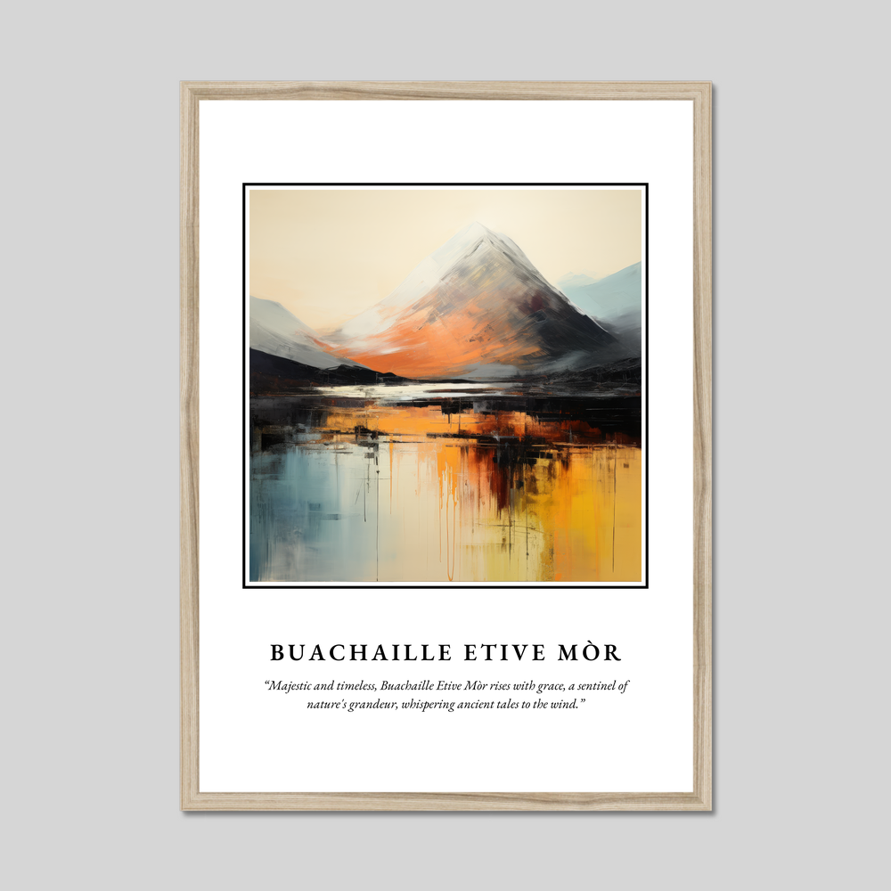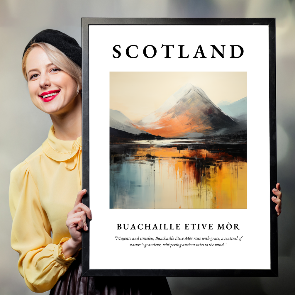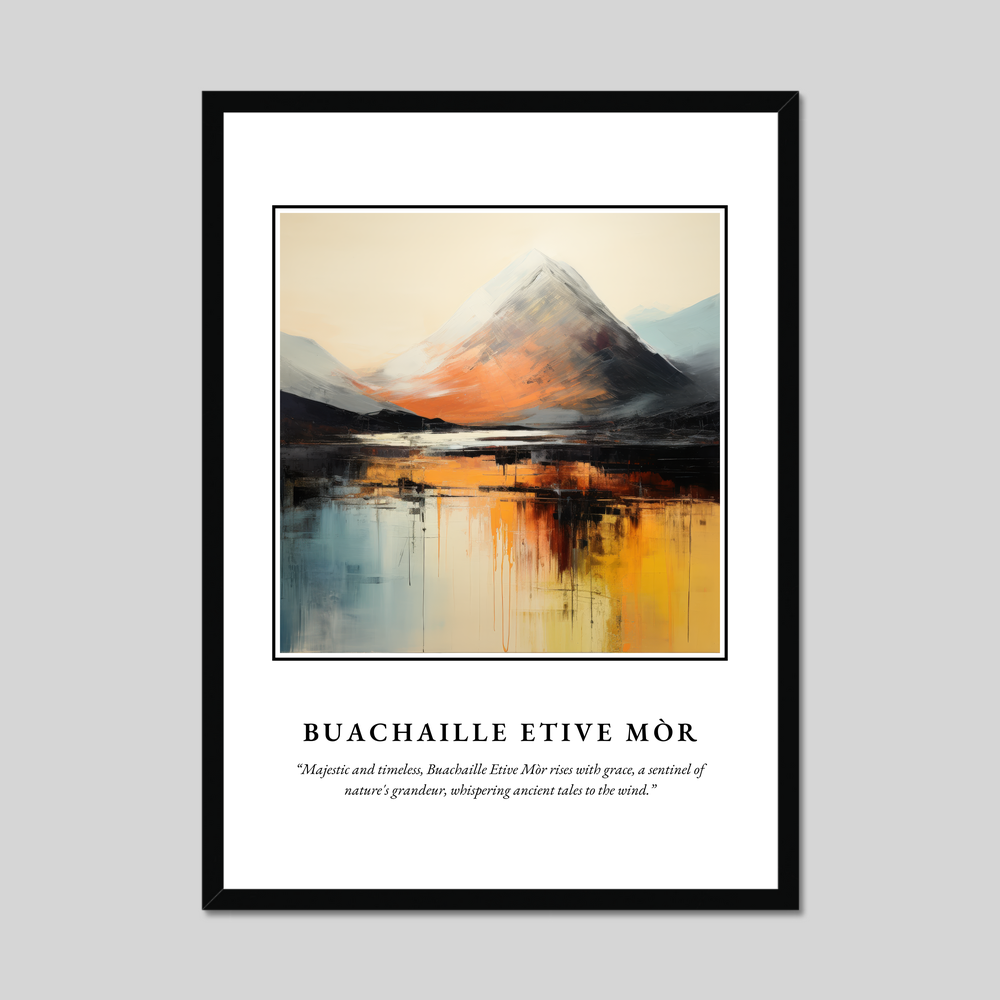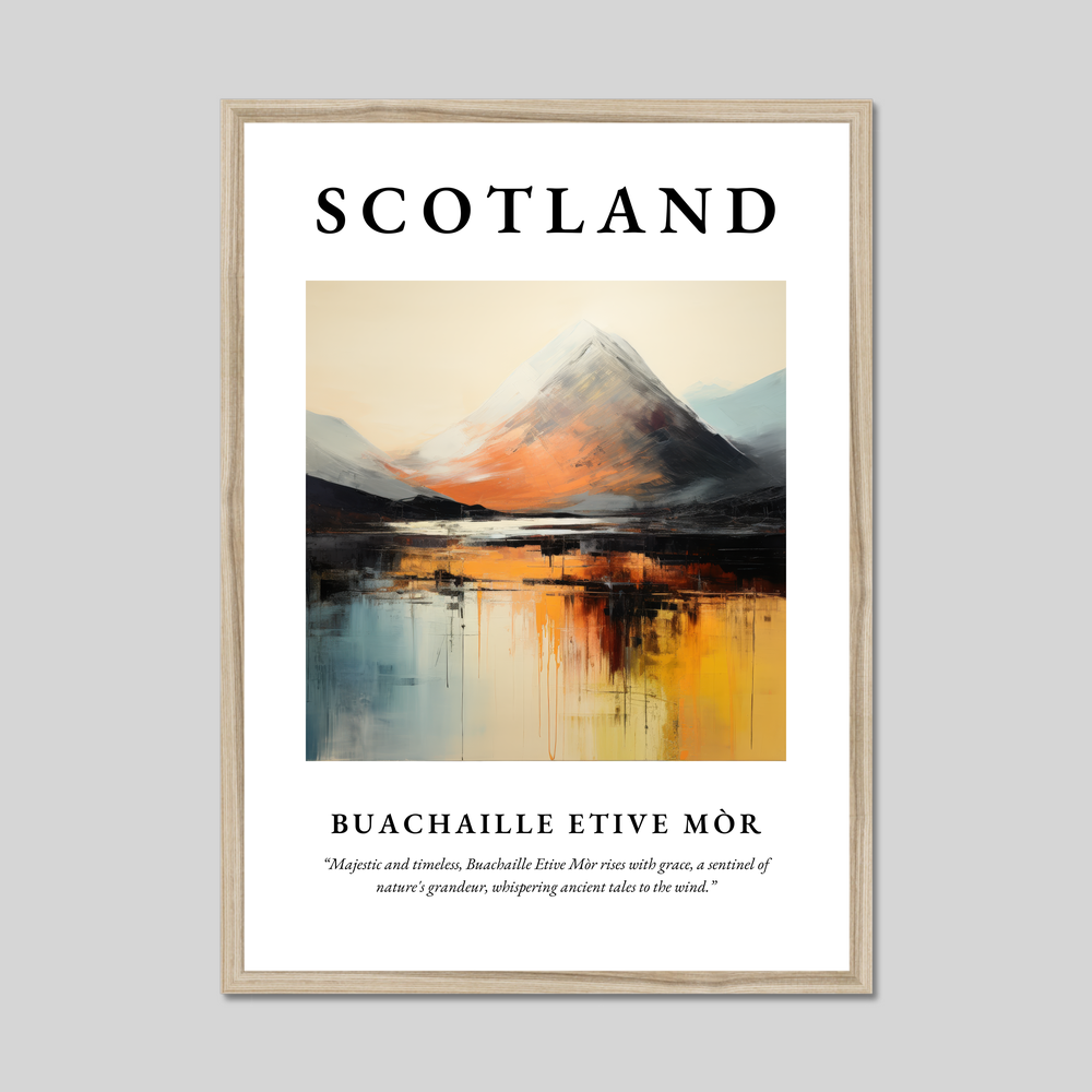 The poster design is bold yet graceful, with "SCOTLAND" emblazoned at the top in commanding lettering. Below, an abstract representation of Buachaille Etive Mòr sweeps across the poster, its rugged peaks rendered in sweeping strokes of fiery orange and cool blue, invoking the dramatic interplay of the natural elements. Beneath this striking portrayal lies the evocative quote: “Majestic and timeless, Buachaille Etive Mòr rises with grace, a sentinel of nature's grandeur, whispering ancient tales to the wind.” This piece is part of our exclusive “Glencoe” collection, perfect for anyone who holds a connection to this iconic landscape or simply appreciates the beauty of abstract art.