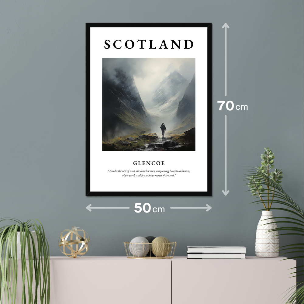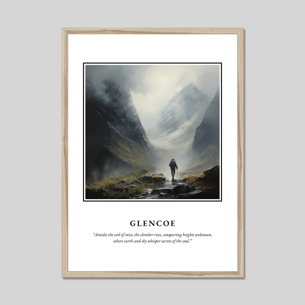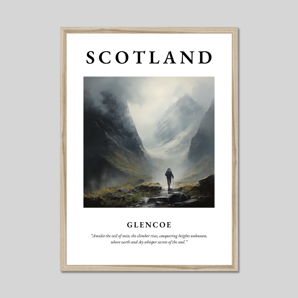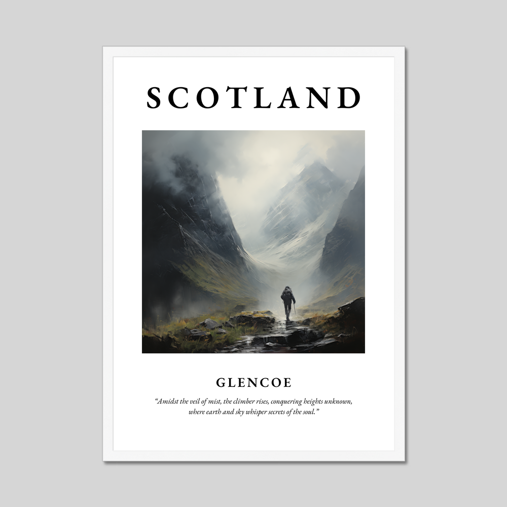 The heart of the poster features a Naive Art style painting of Glencoe, where simplicity meets emotional depth. The scene portrays a solitary climber emerging from mystical mists, set against a dramatic mountainous backdrop. The painting's earthy and ethereal tones entangle the viewer’s senses, offering a gateway to a world where “earth and sky whisper secrets of the soul.” The contrasting styles make this artwork a focal point in any room, accommodating diverse decor preferences, whether framed in black, white, or a natural wood-effect finish.