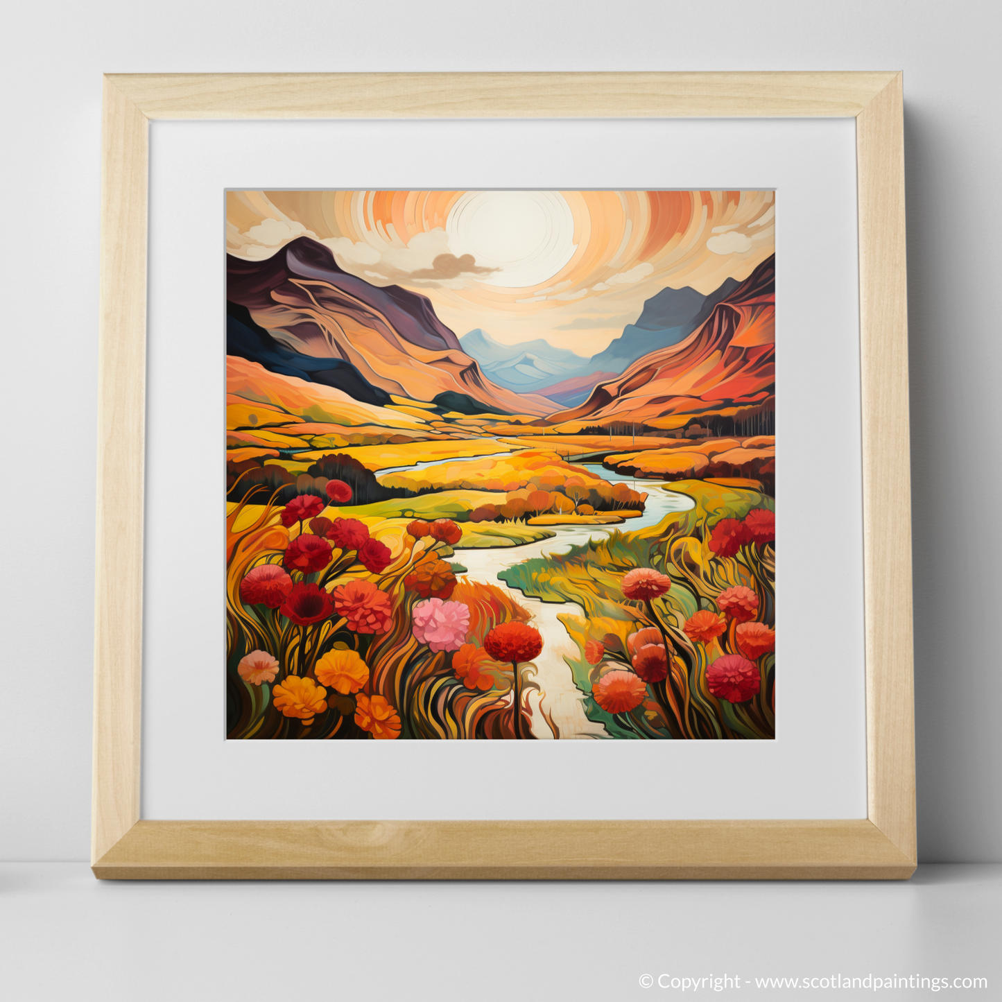 As the morning sun unfurls its golden rays over Glencoe, a serene tranquility is captured in this exquisite print, an homage to nature's autumnal palette. The essence of Color Field is embraced here, with vast swathes of vibrant golds and deep oranges defining the undulating bracken-dotted landscape. The eye is drawn to the central meandering river, which snakes through the valley, bordered by the fiery hues of the foliage. This flowing ribbon of water reflects the sky's pastel blues, drawing a cool contrast to the warmth of the fields.