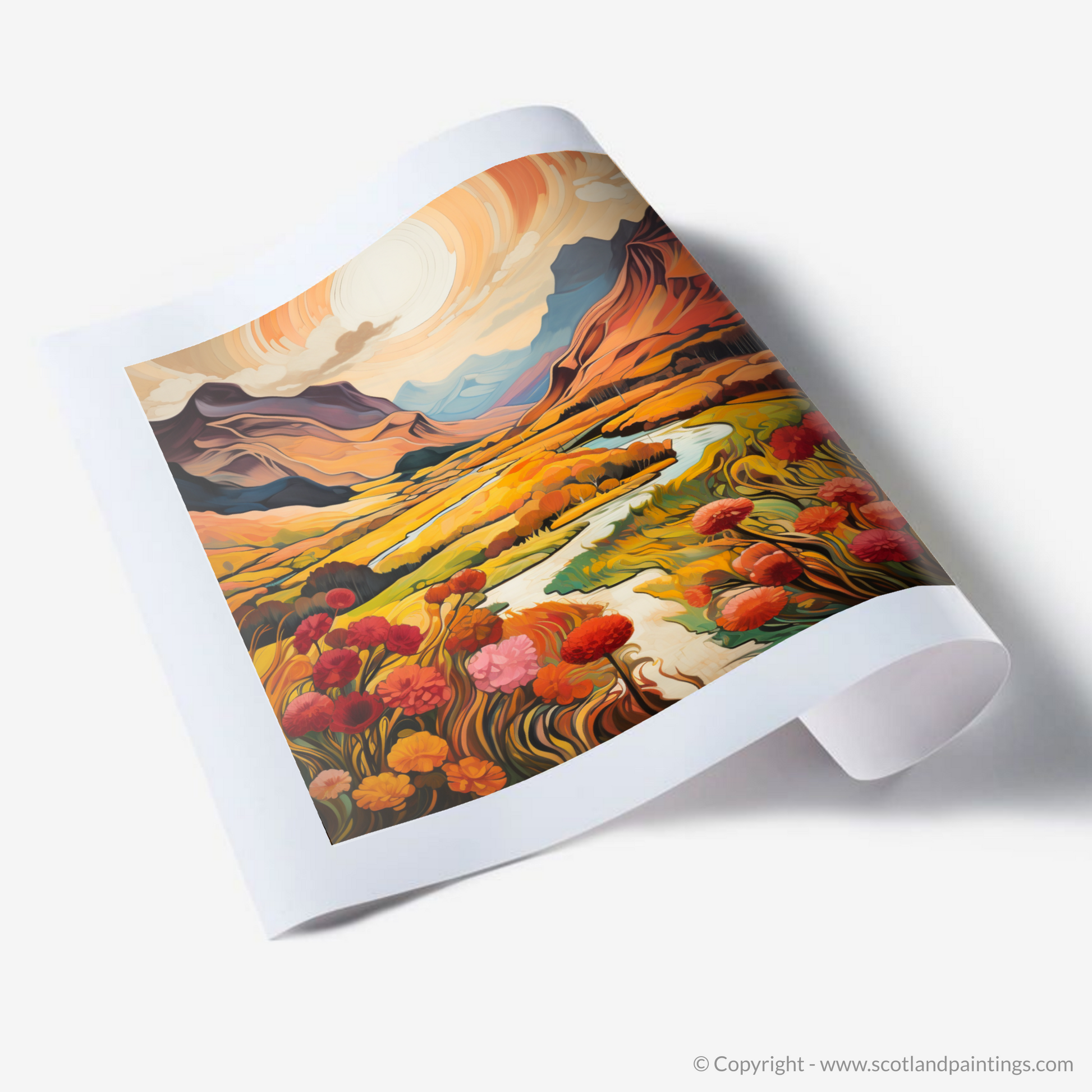 In the foreground, a lively dance of wildflowers and grasses invites the viewer into a world bursting with life and color. Pops of crimson, scarlet, and peach add a dynamic visual rhythm to the scene, their rounded forms echoing the distant mountaintops. The mountains themselves rise majestically, their slopes rendered in sweeping gestures of deep sienna, slate grey and hints of lavender, suggesting the raw beauty of the Scottish Highlands.