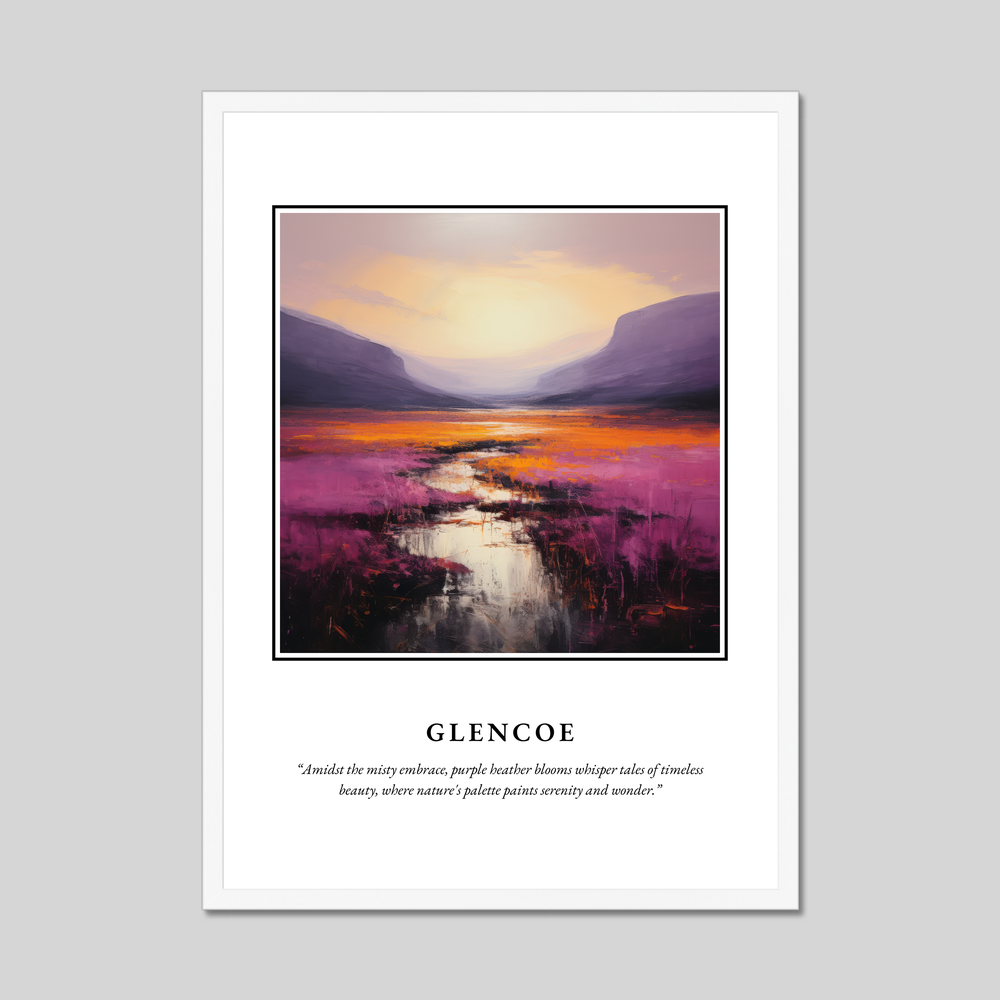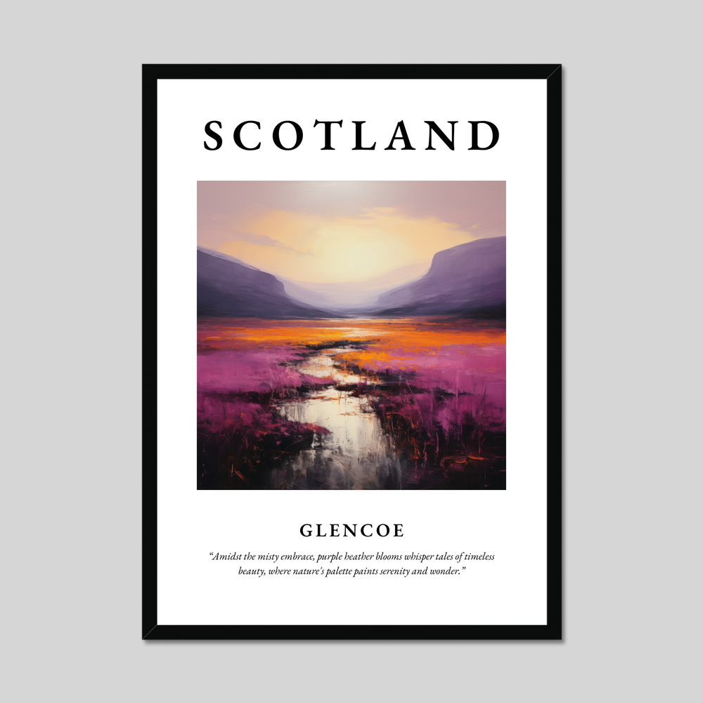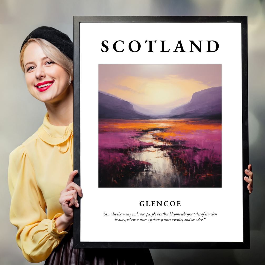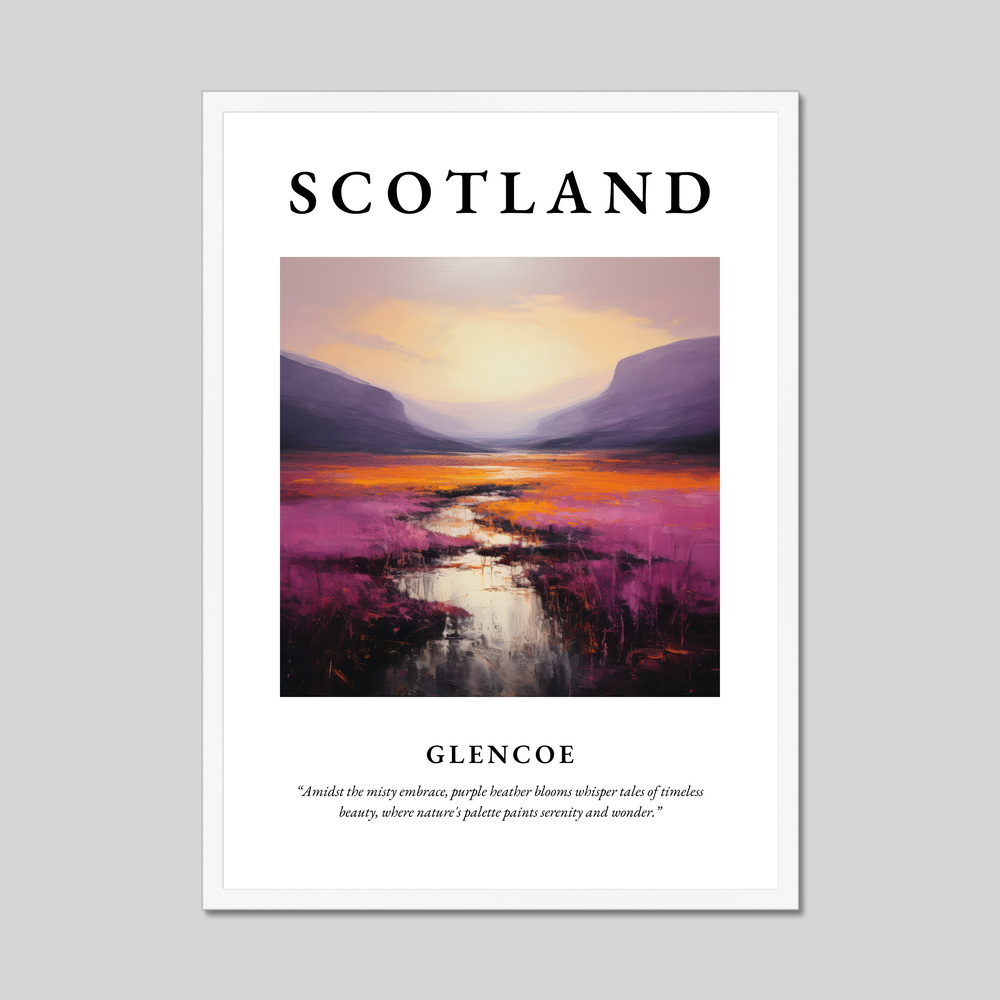 The poster features the word "SCOTLAND" emblazoned proudly at the top in bold lettering, guiding you into the scene beneath it. In this abstract representation, the misty valleys of Glencoe are portrayed with sweeping strokes of purple and orange, capturing the mystical heather blooms and vibrant sunsets. The subtle, yet profound quote underneath—“Amidst the misty embrace, purple heather blooms whisper tales of timeless beauty, where nature's palette paints serenity and wonder.”—adds an evocative layer of meditation and reflection.