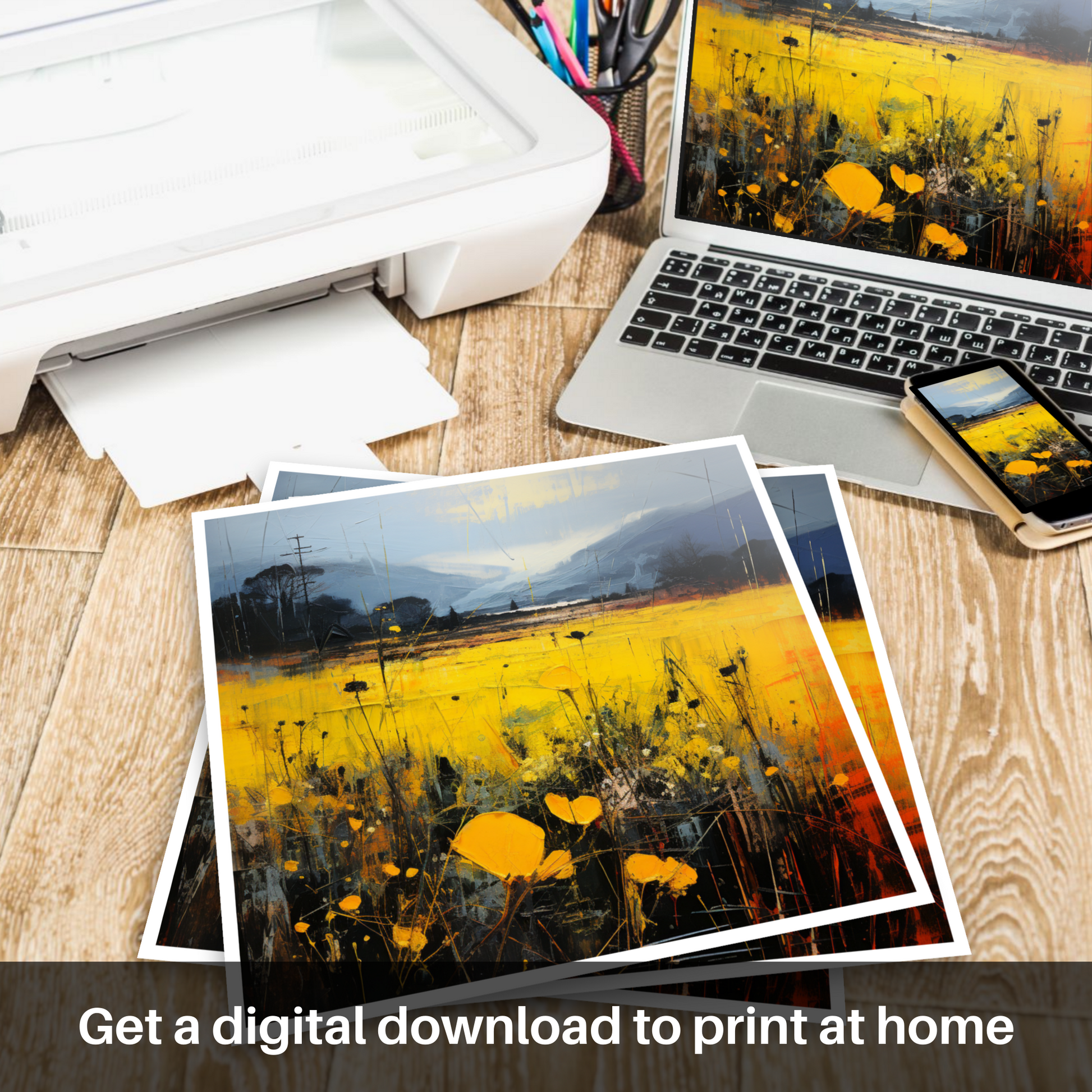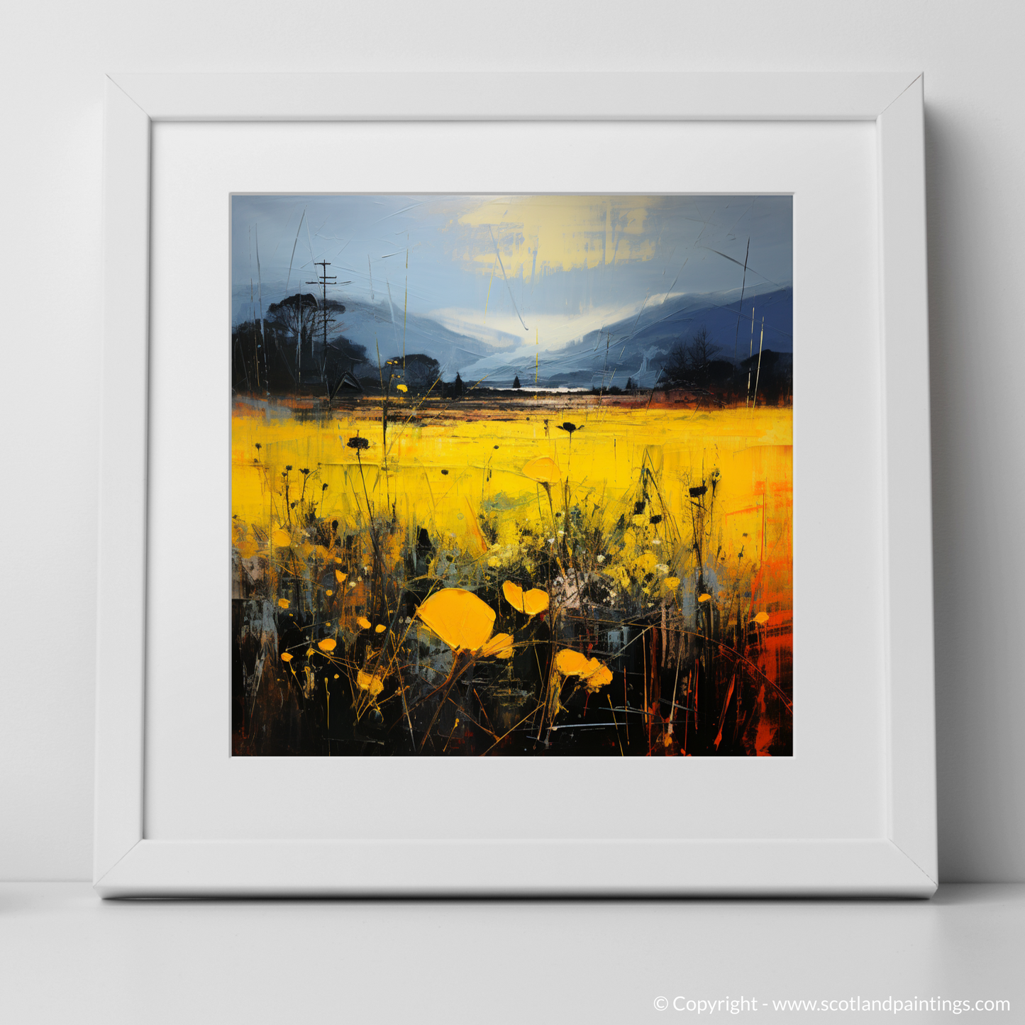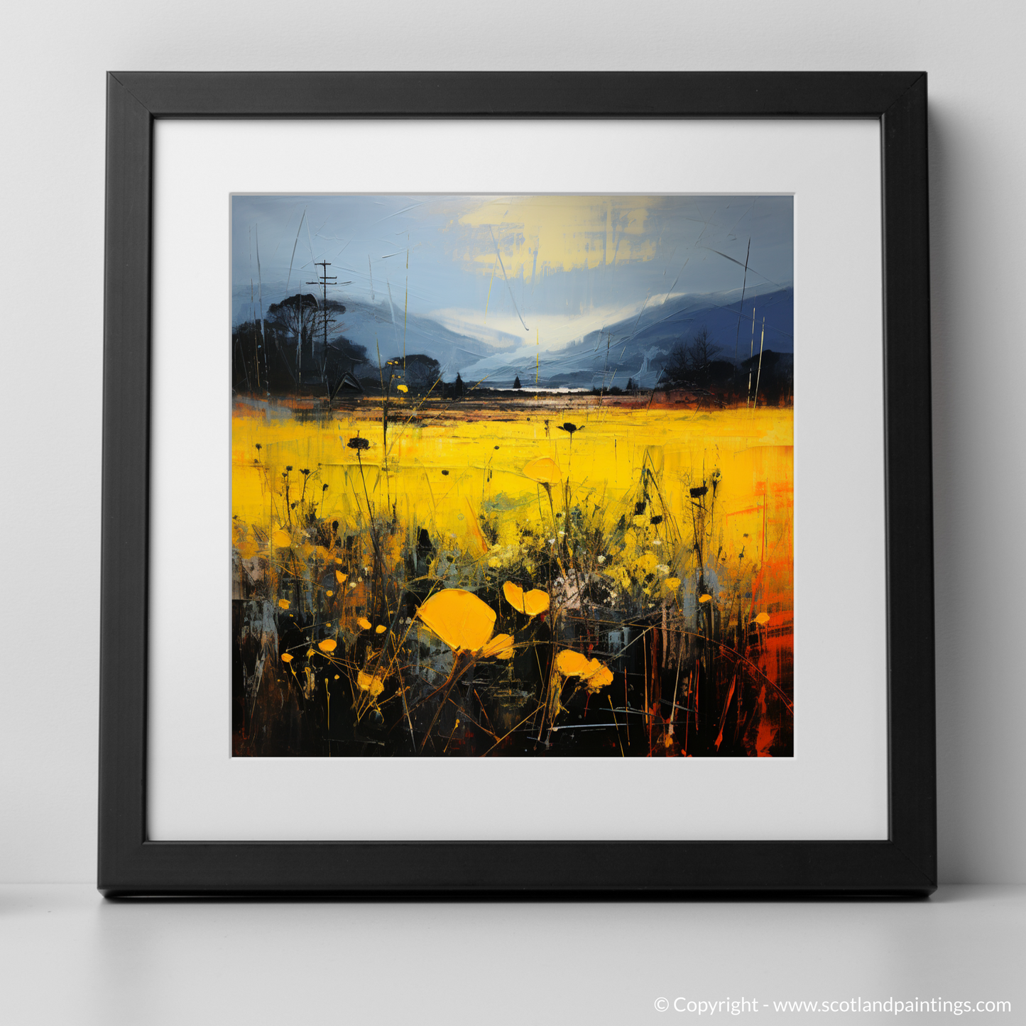 Capture the tranquil essence of Glencoe's natural grandeur with this abstract print, inspired by the delicate Tormentil dotting the meadows at dawn. Vibrant splashes of yellow and ochre leap forth, reminiscent of wildflowers greeting the first light, while a dynamic backdrop of cool blues and moody greys conjures the serene Scottish landscape awakening.