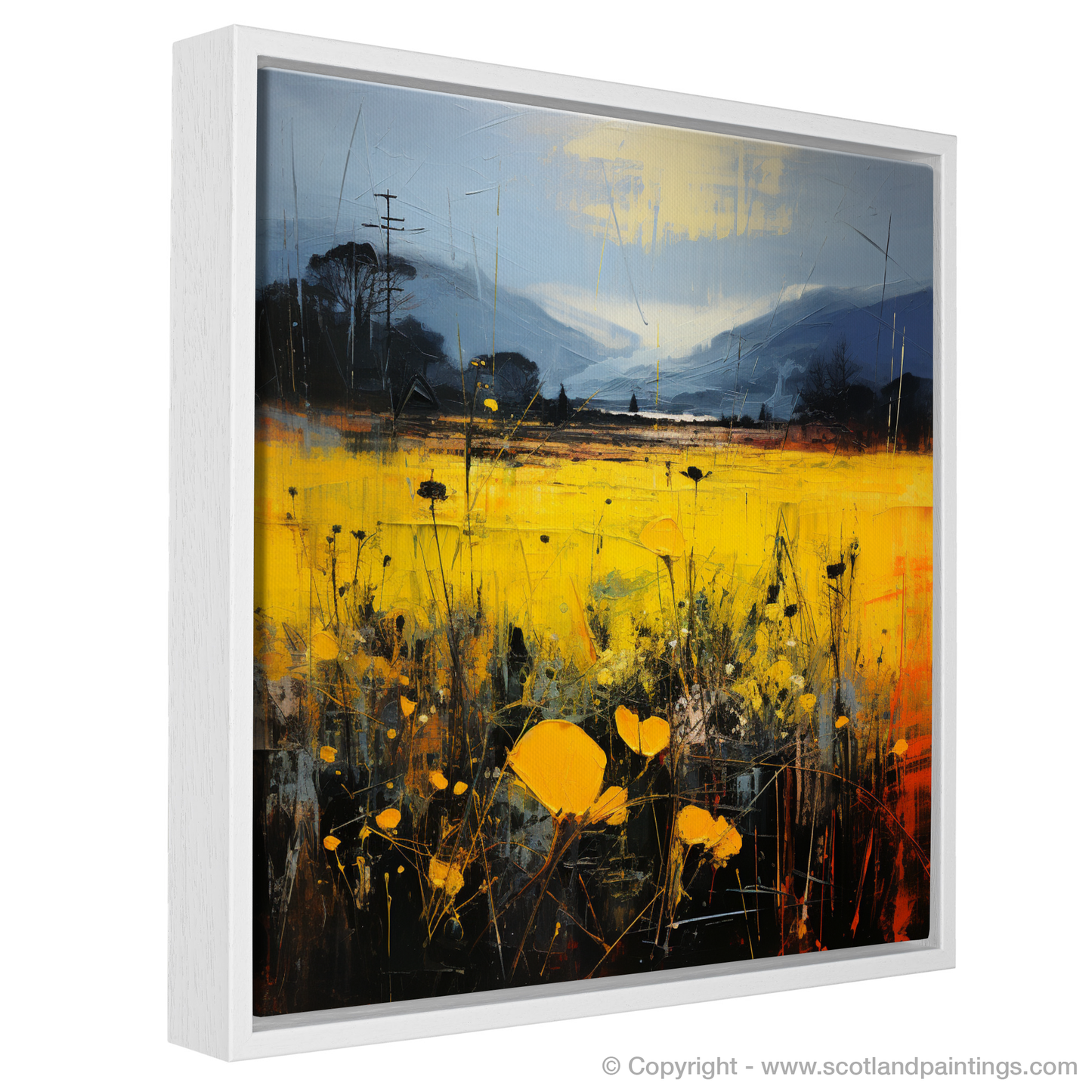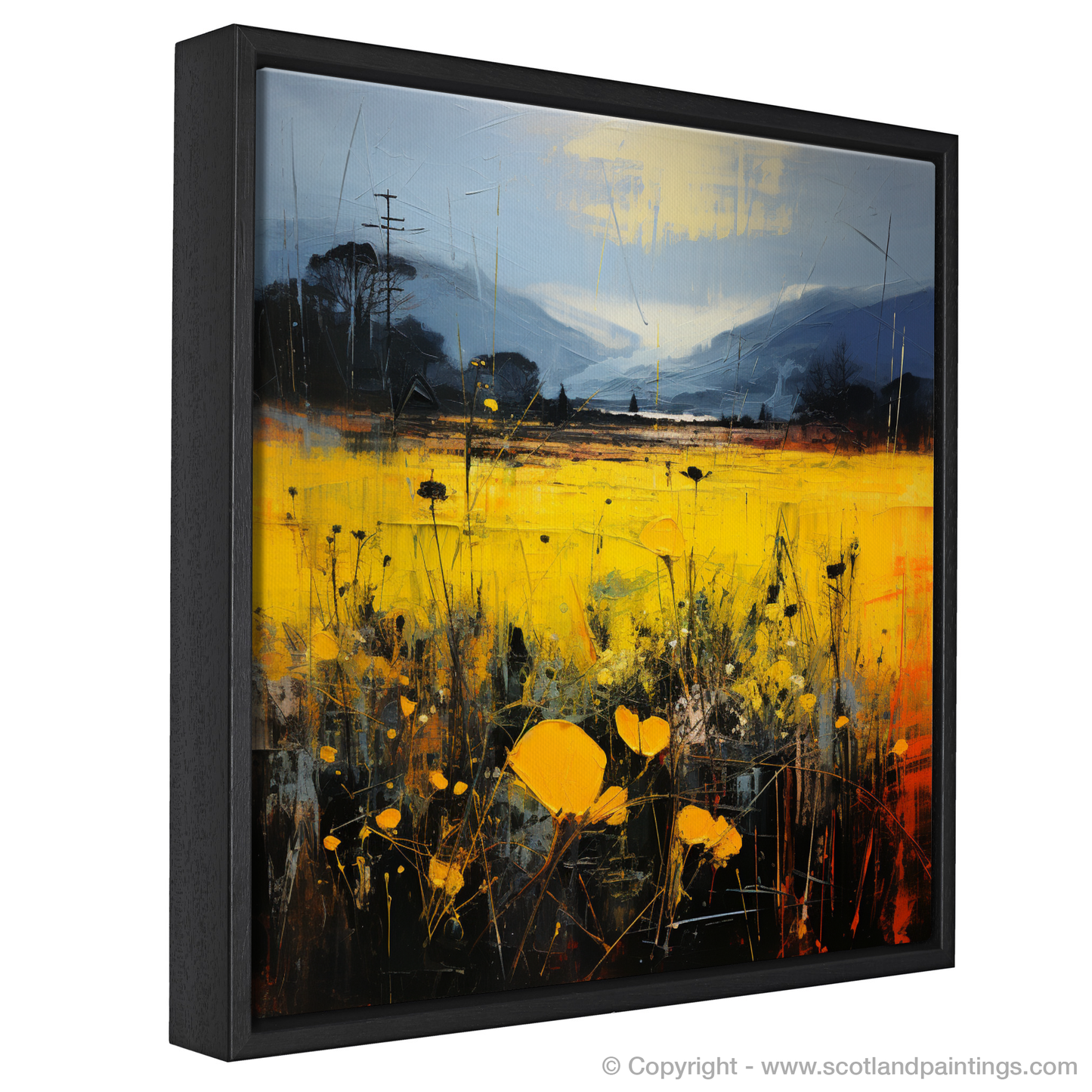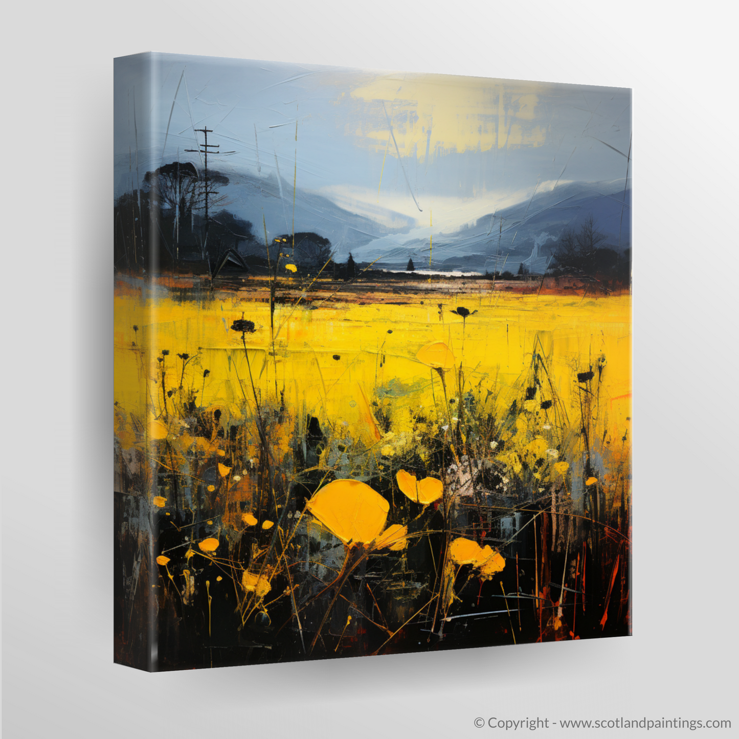 Capture the tranquil essence of Glencoe's natural grandeur with this abstract print, inspired by the delicate Tormentil dotting the meadows at dawn. Vibrant splashes of yellow and ochre leap forth, reminiscent of wildflowers greeting the first light, while a dynamic backdrop of cool blues and moody greys conjures the serene Scottish landscape awakening.
