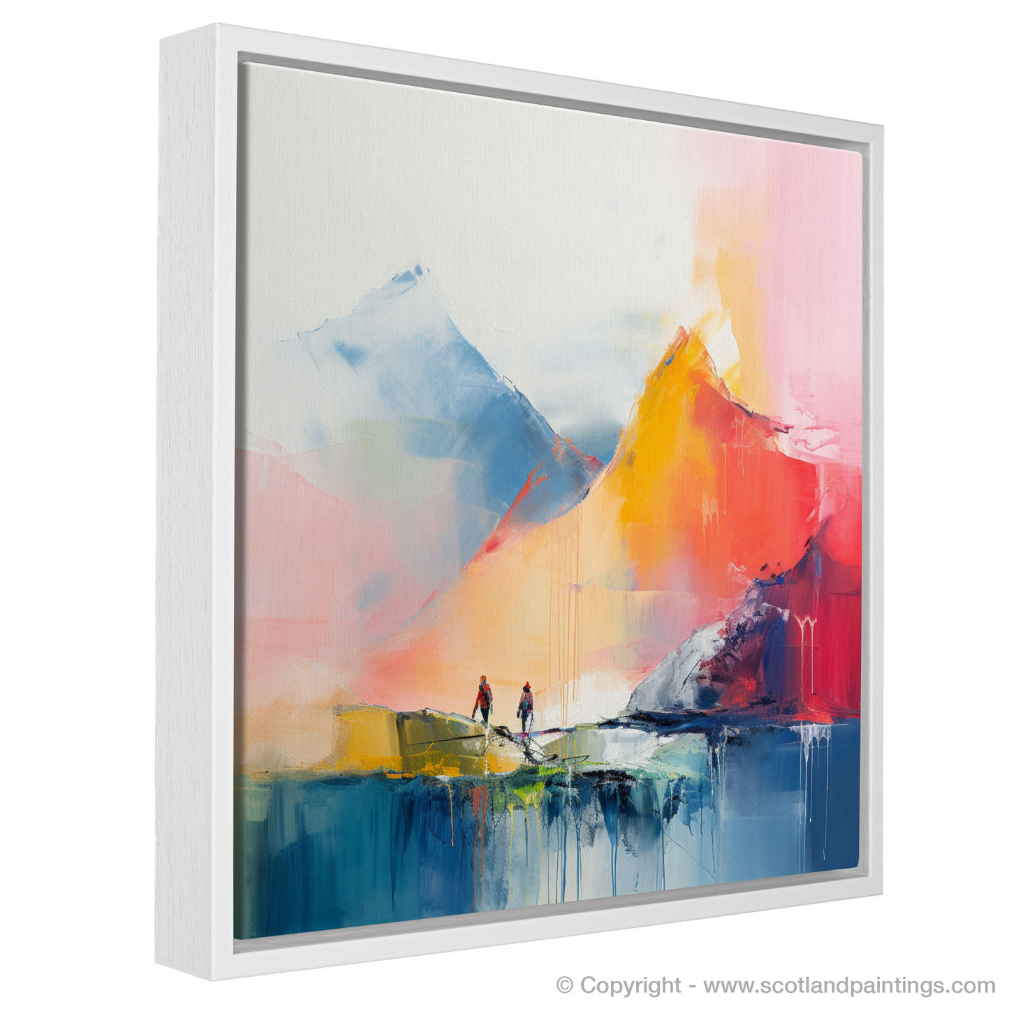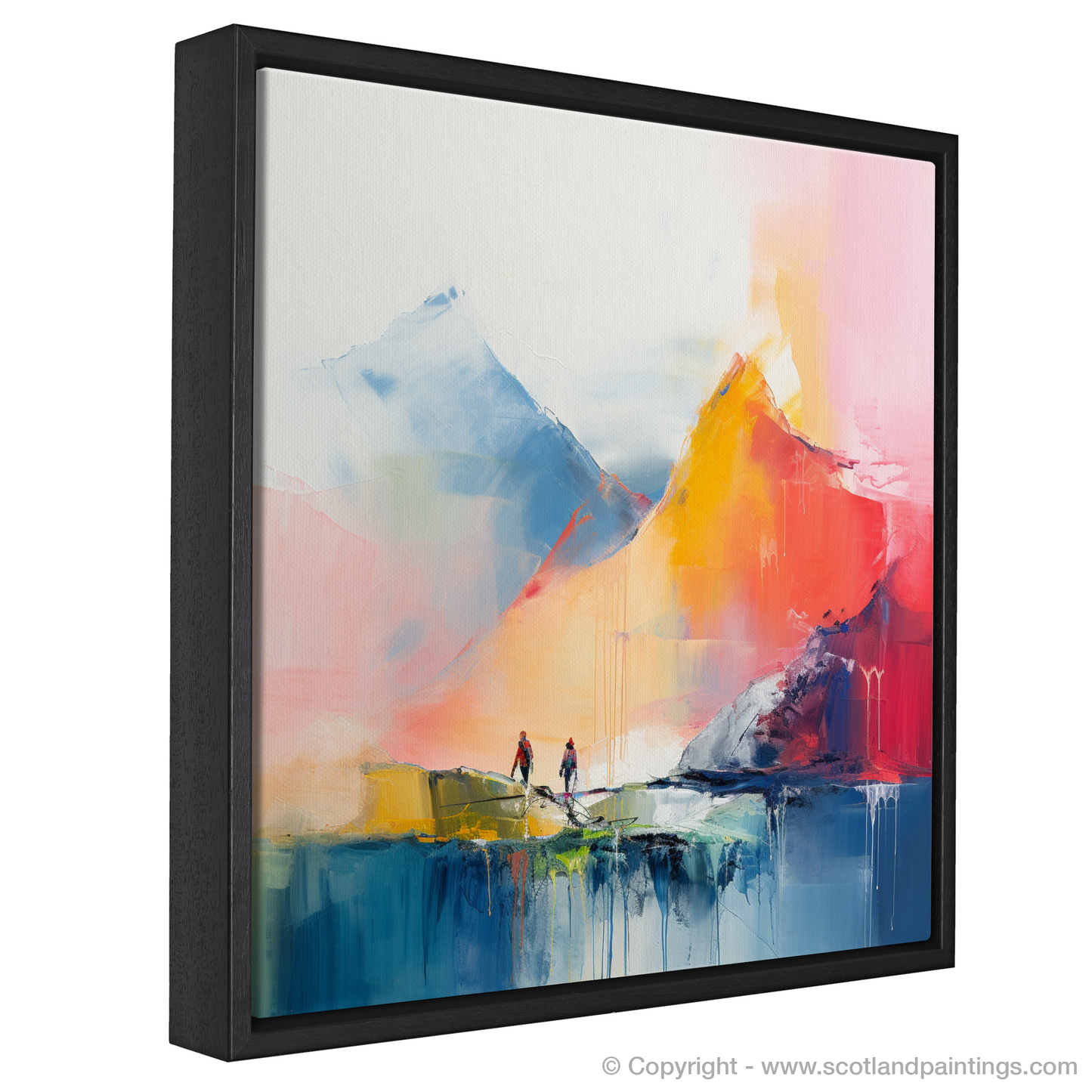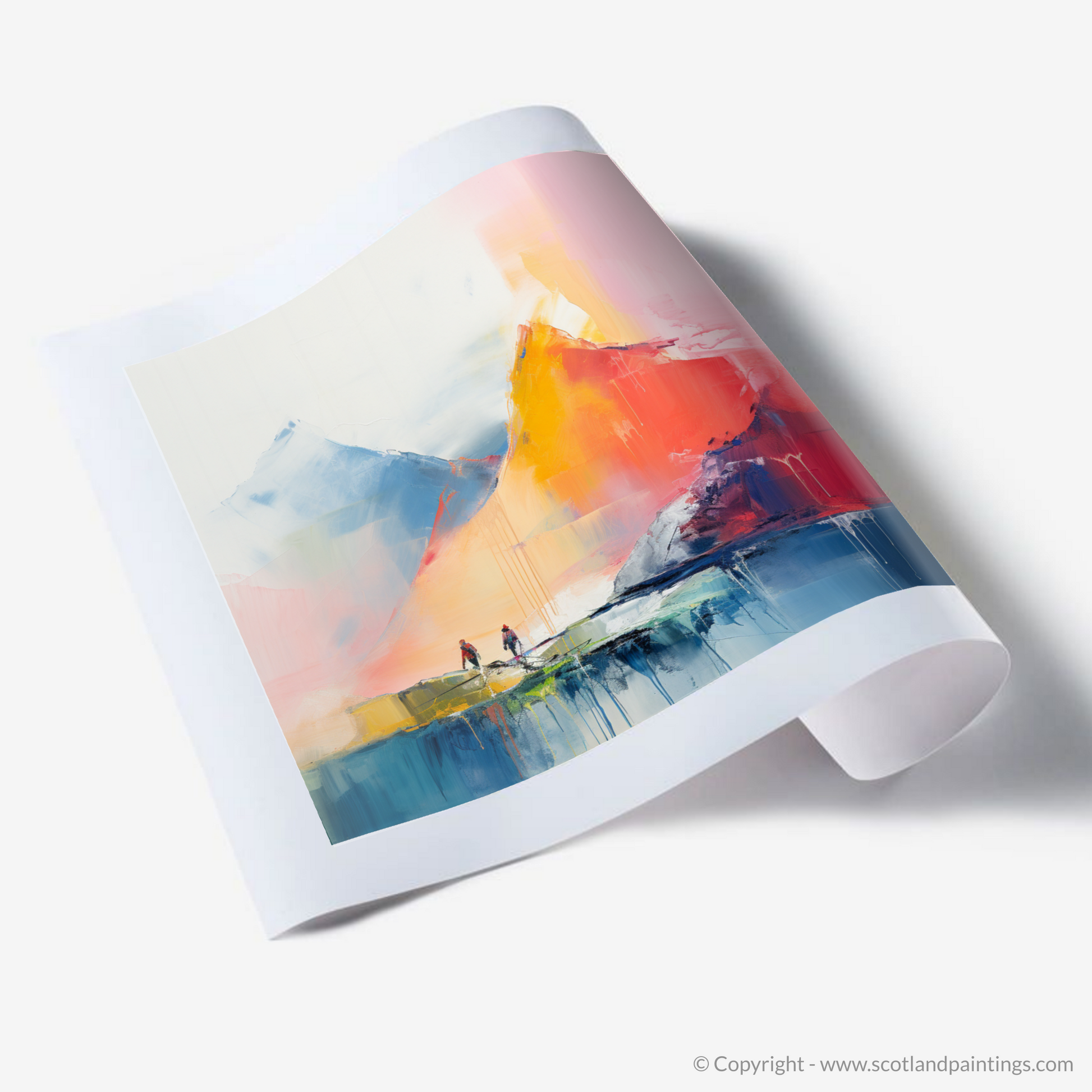 Embrace the visceral energy of the Scottish Highlands with this evocative print, capturing the essence of Glencoe's majestic landscapes. Abstract splashes of vibrant colours melt together, shaping the iconic rugged terrain, where azure blues merge with icy whites to evoke towering peaks and crisp, highland air. Bold strokes of orange and red infuse the scene with the warmth of a setting sun, whilst drips and splatters suggest a dynamic atmosphere, alive with elemental forces.