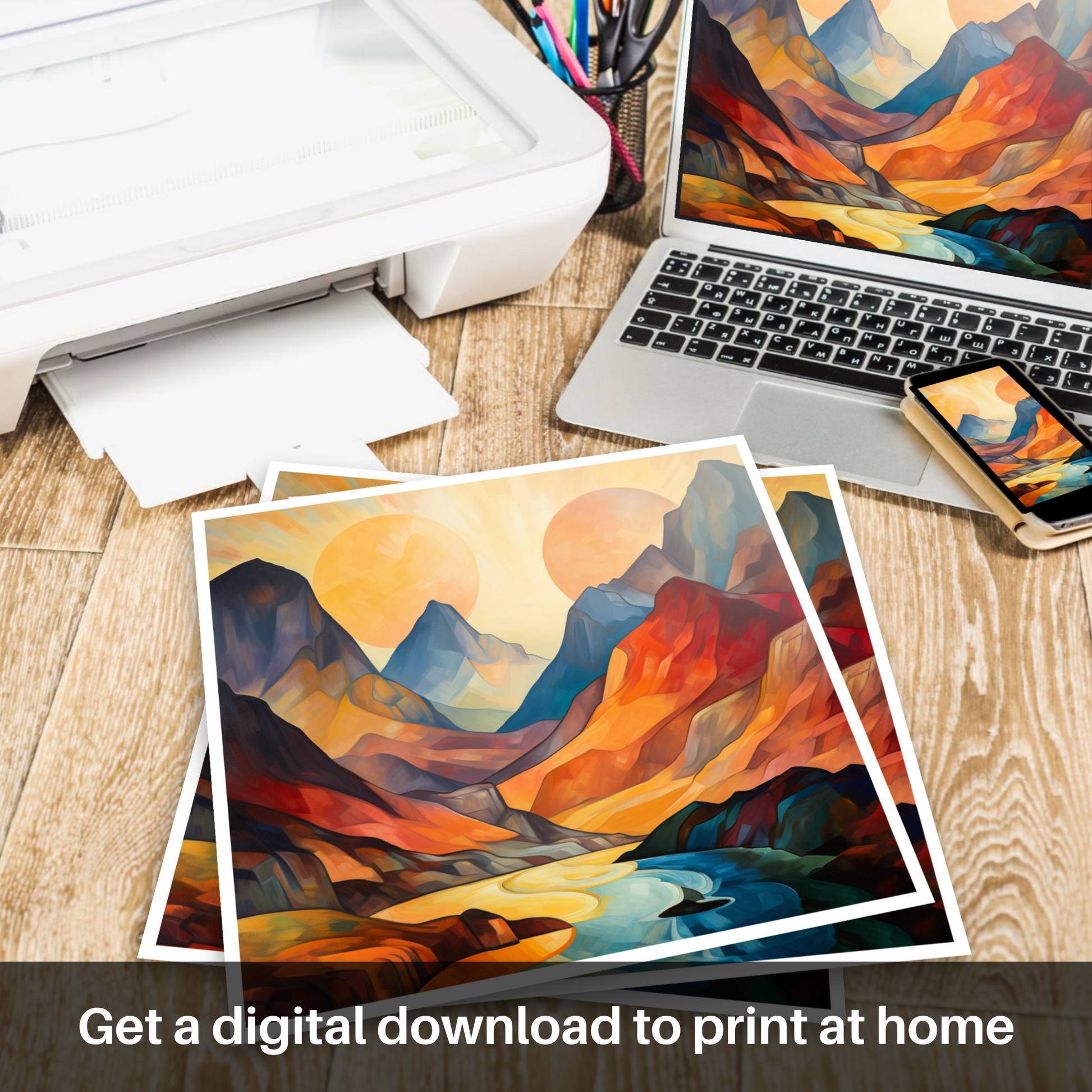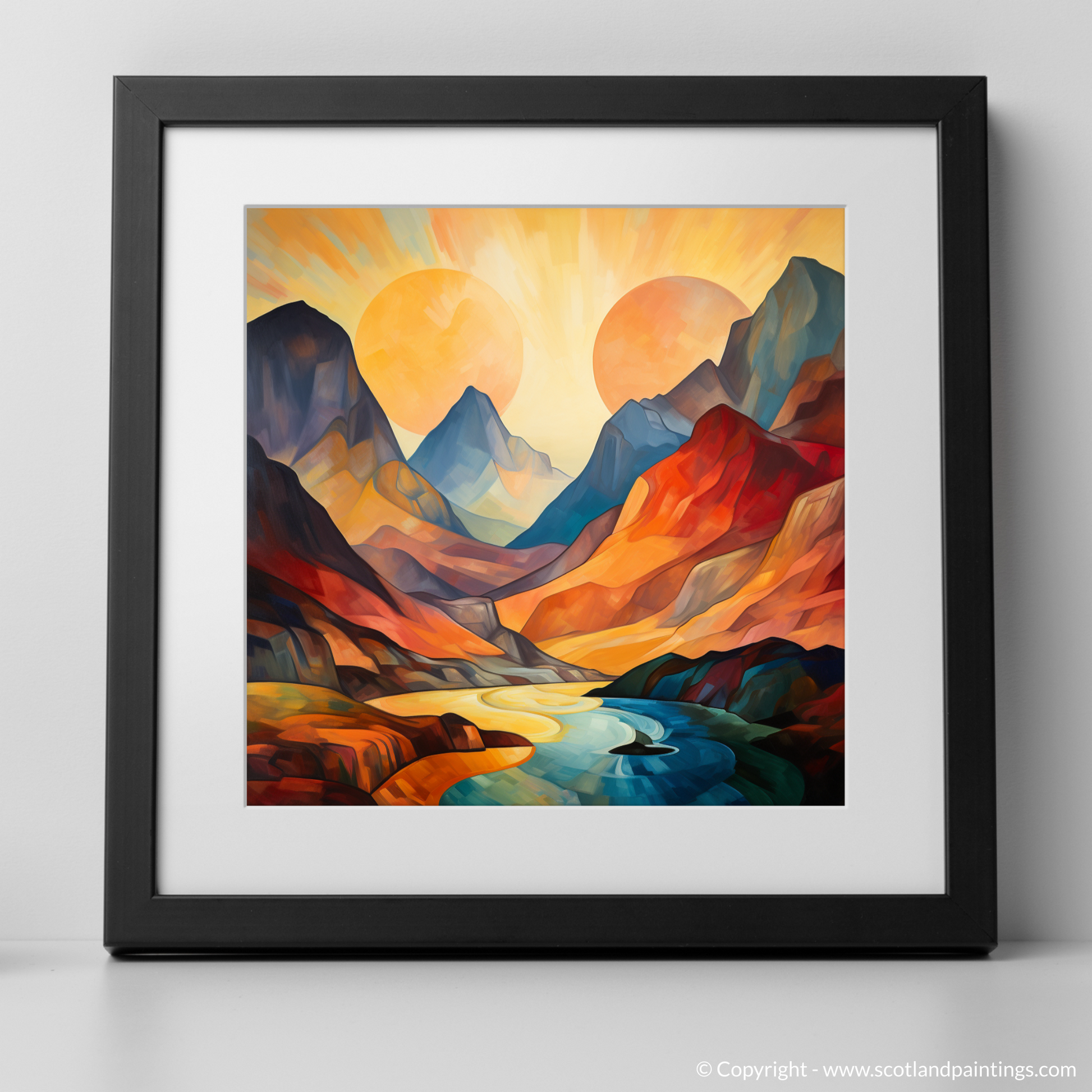 The print invites onlookers to lose themselves in the abstract contours and vibrant landscape that offer a contemporary reinterpretation of Scotland's unspoiled wilderness. Its striking palette and stylised forms capture the fleeting beauty of sunset, making it a captivating centrepiece that will infuse any space with warmth, depth, and a touch of the sublime. A testament to the transformative power of light and landscape, this work is a must-have for admirers of abstract interpretations and the natural grandeur of Glencoe.