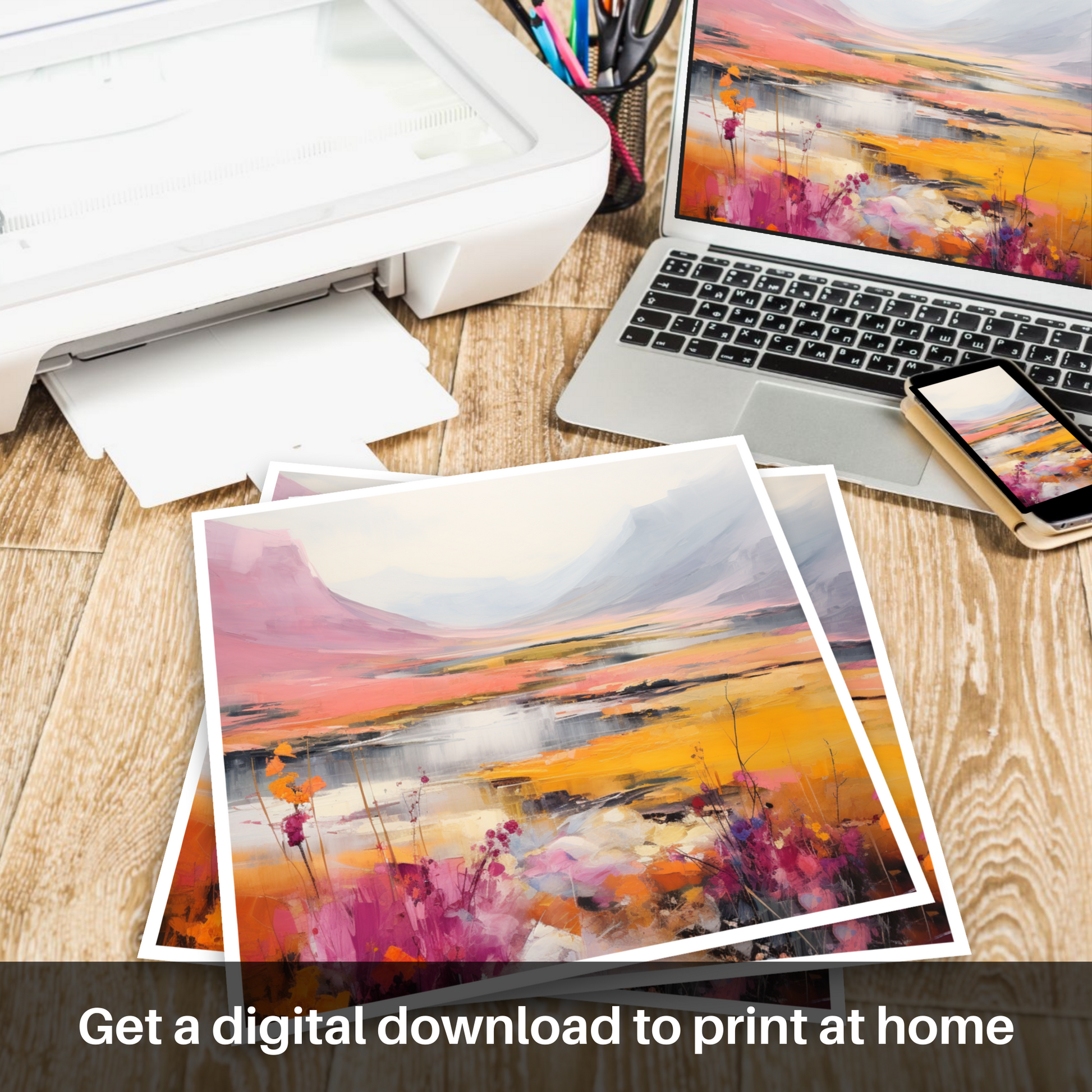 This print is a celebration of nature's wild palette, offering a contemporary take on Scotland's famed scenery. Its abstract nature means that each viewer may find their own meaning within the splashes of colour and form, forging a personal connection with the Highlands' enduring beauty.
