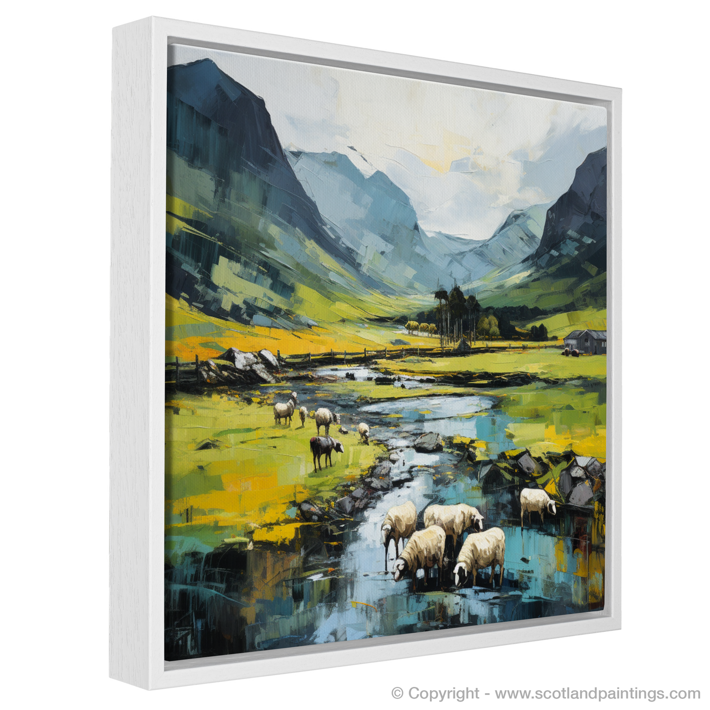 Beyond extends the remarkable vista of the Glencoe mountains, their grandeur abstracted into bold sections of colour and dynamic brushstrokes that convey the strength of these age-old sentinels. The palette is a masterful combination of airy blues, grounding greys, and invigorating slices of white that emulate the fleeting Scottish light.