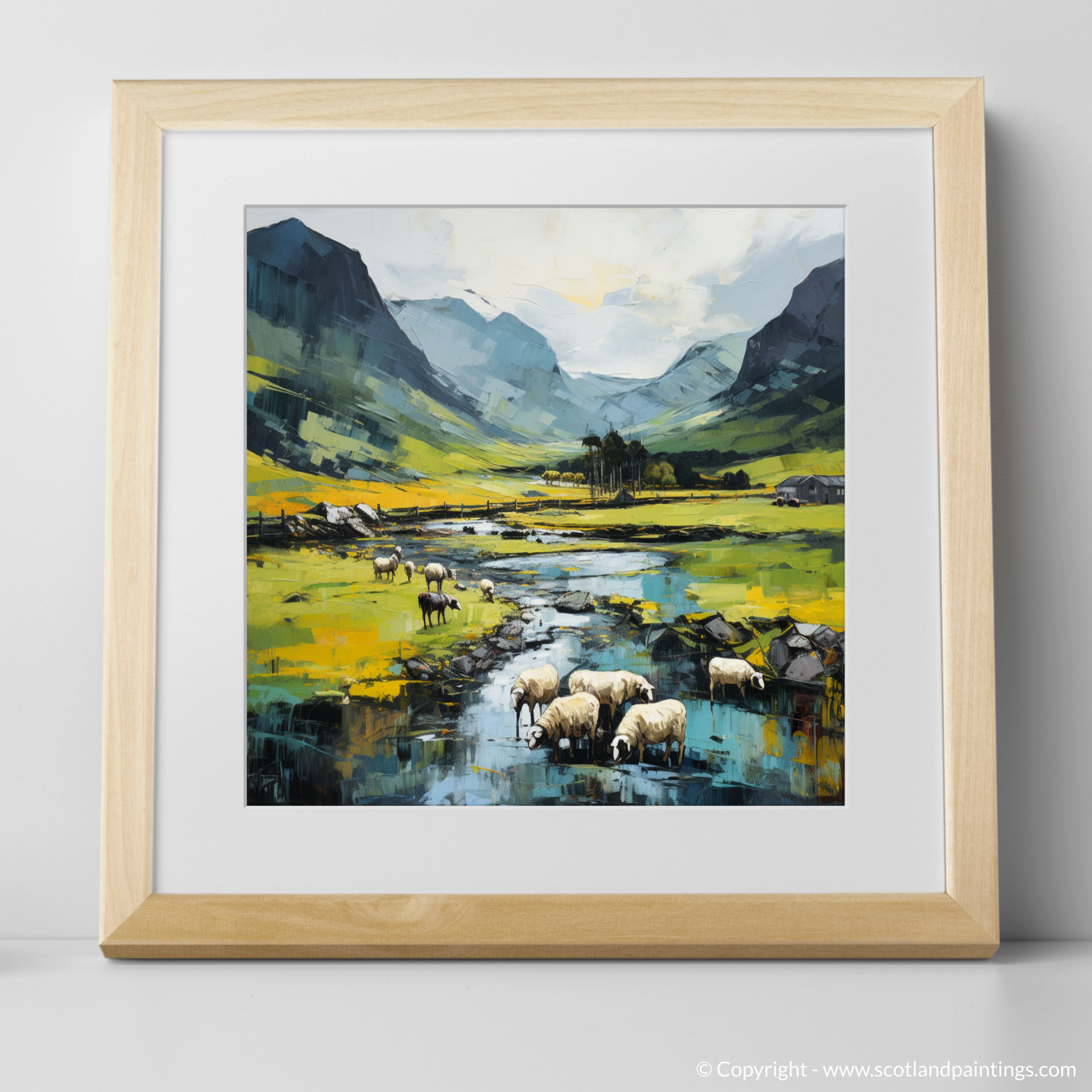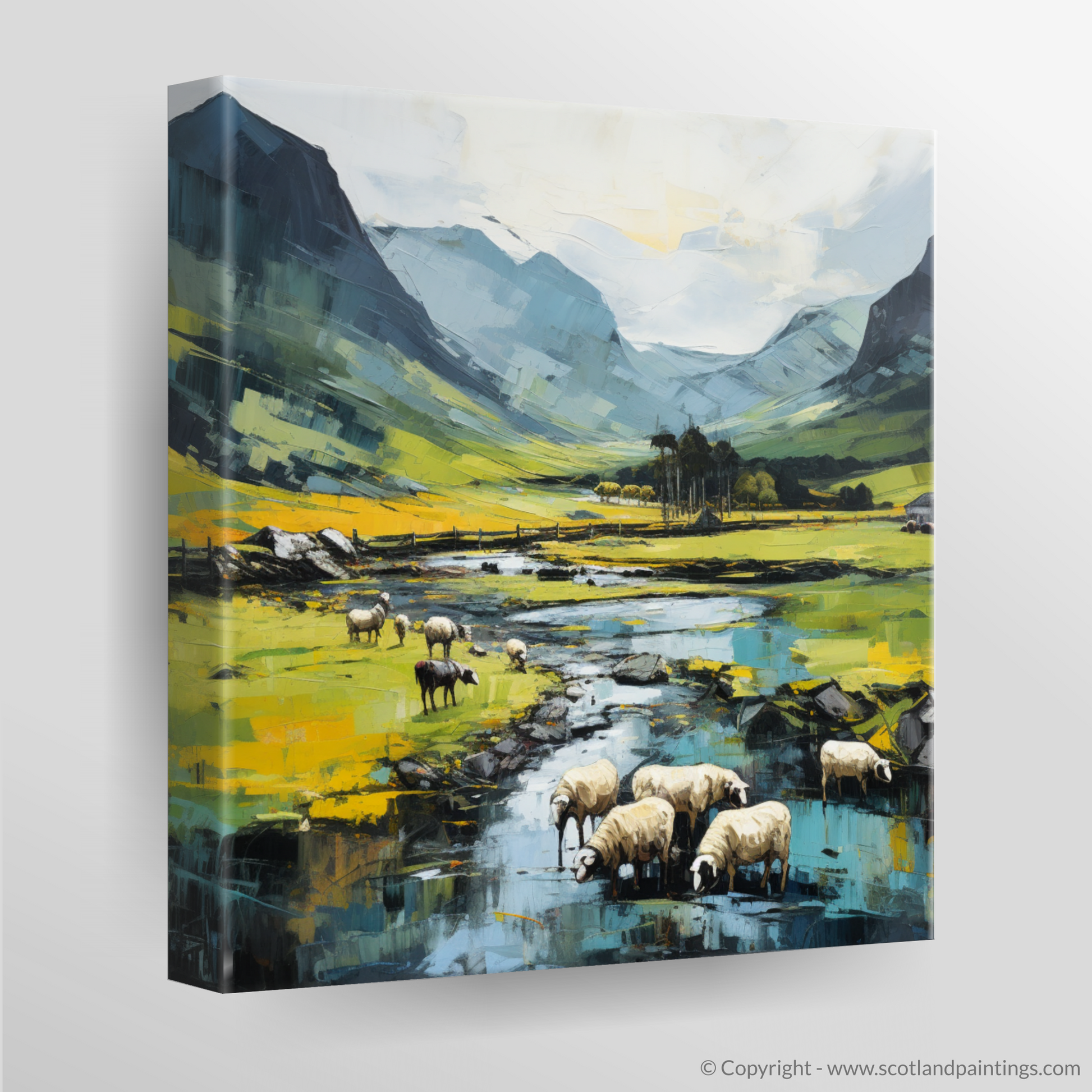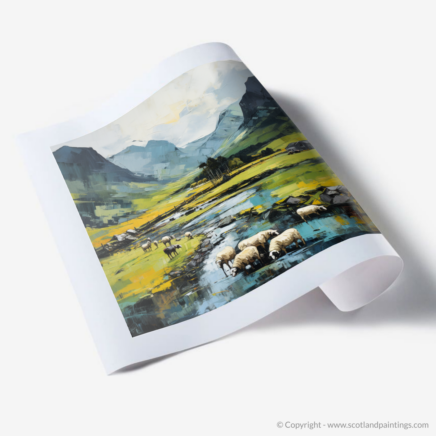 The middle ground swathes beneath the grazing sheep, dappled with vibrant hues of yellow that suggest fields rich with foliage, likely the lush grasses that flourish under the Scottish sun. The occasional strokes of deeper green and blue punctuate the topography, personifying the rolling hills and valley that cradle the pastoral scene.