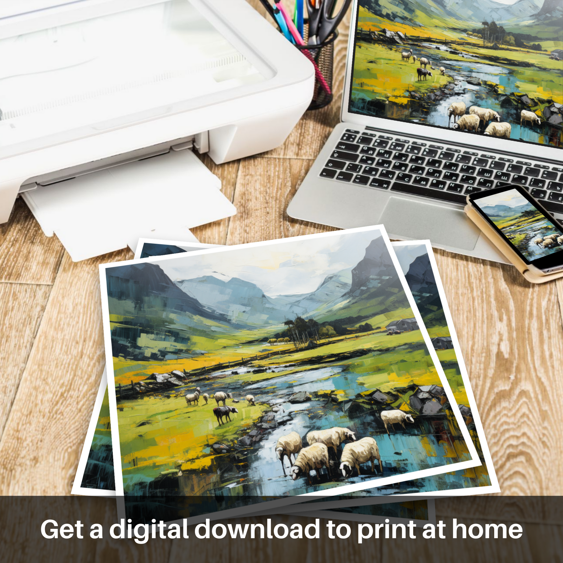 Immerse yourself in the tranquil beauty of the Scottish Highlands with our striking print, inspired by the serene pastures and timeless charm of Glencoe. This remarkable artwork is a testament to the elegance of reimagining landscapes through the fragmented lens of Cubism, where reality is distilled into geometric forms and abstracted perspectives.
