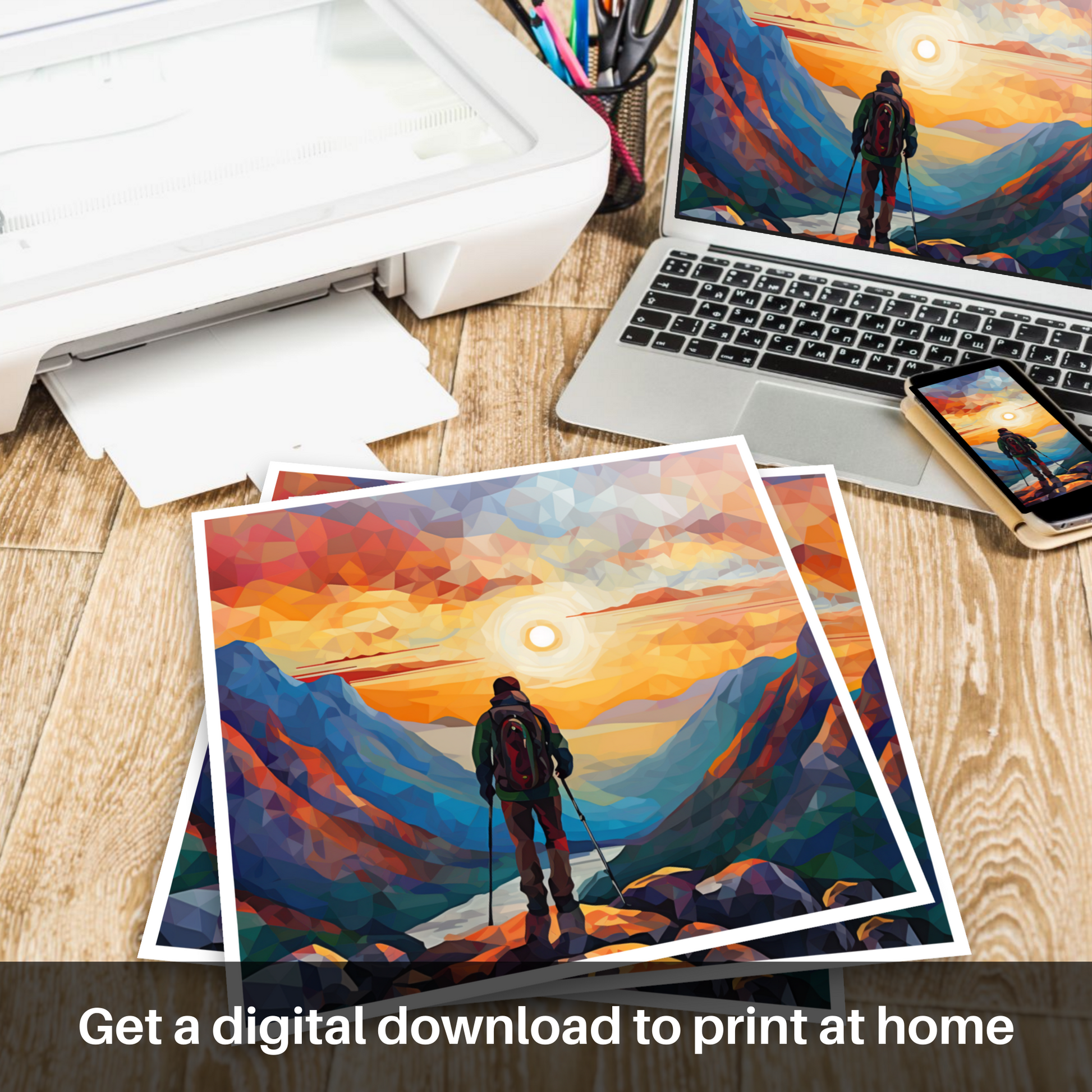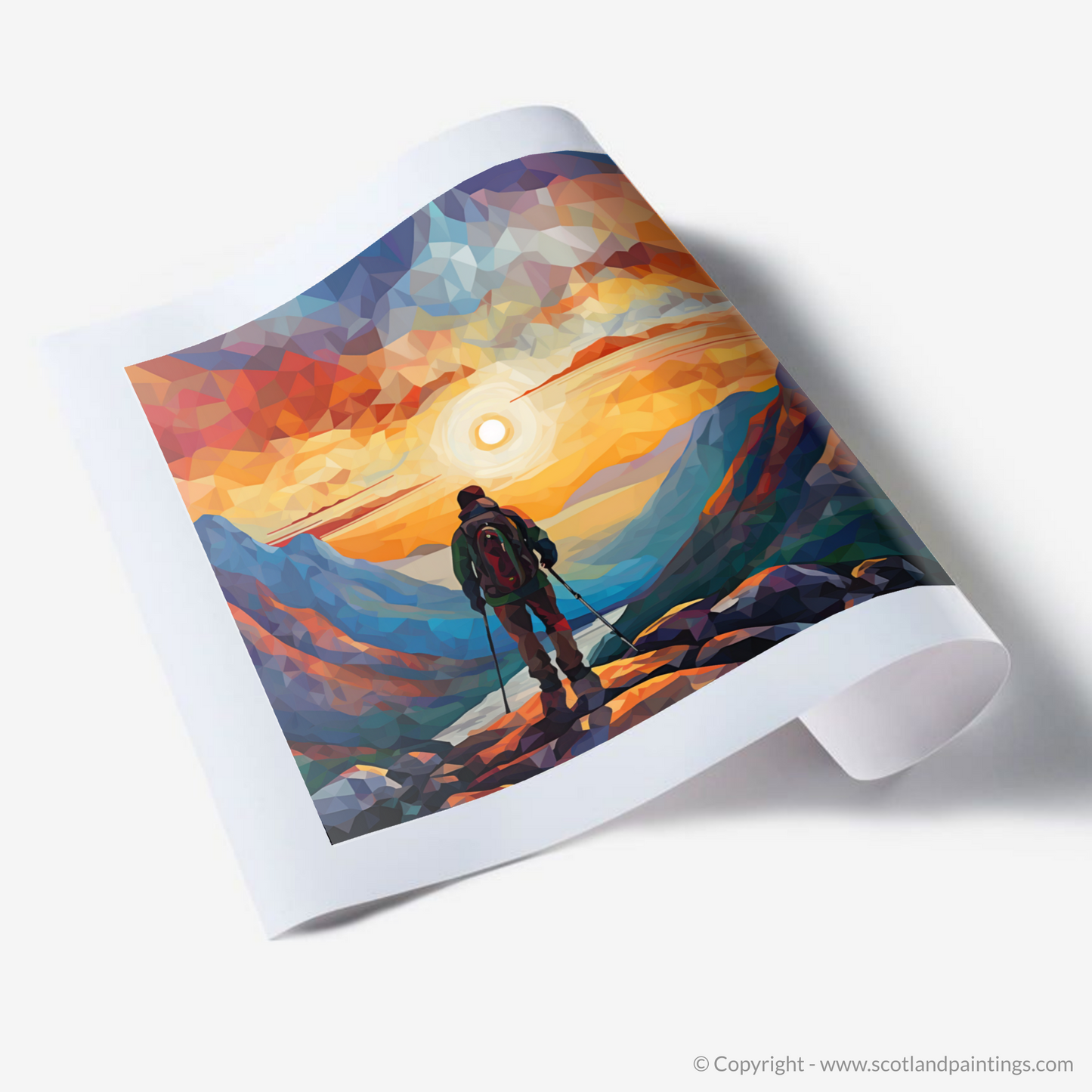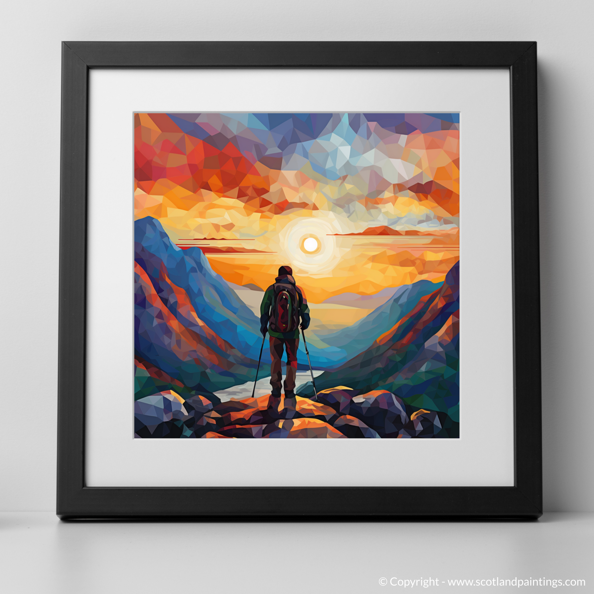 Steeped in the radiant warmth of a setting sun, this cubist-inspired print evokes a sense of adventure and contemplation. A solitary hiker, outlined against the dusky sky, stands poised on a precipice, gazing into the vastness of the Glencoe valley. The silhouette is abstracted; edges and curves break into bold, geometric shapes, suggesting both movement and stillness.
