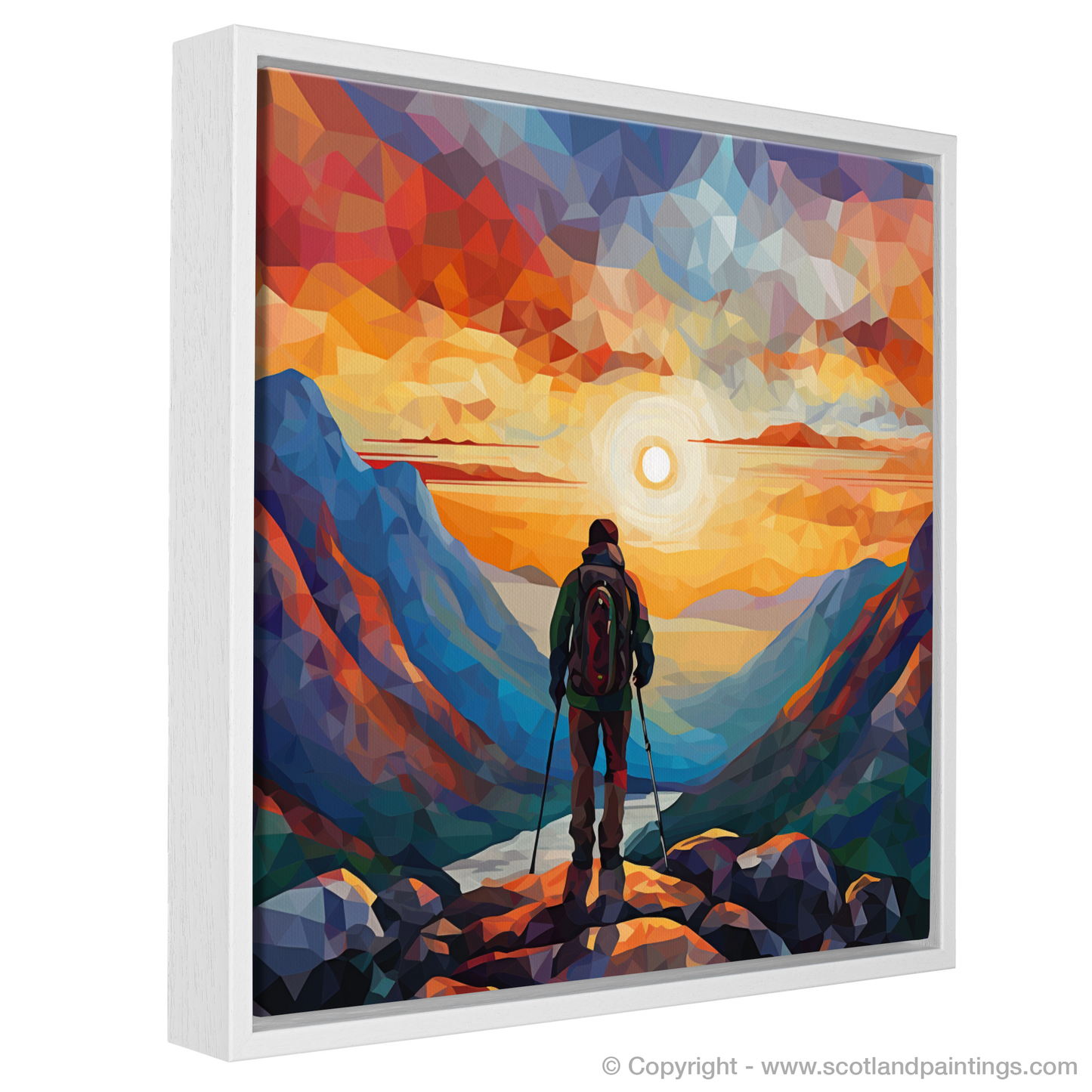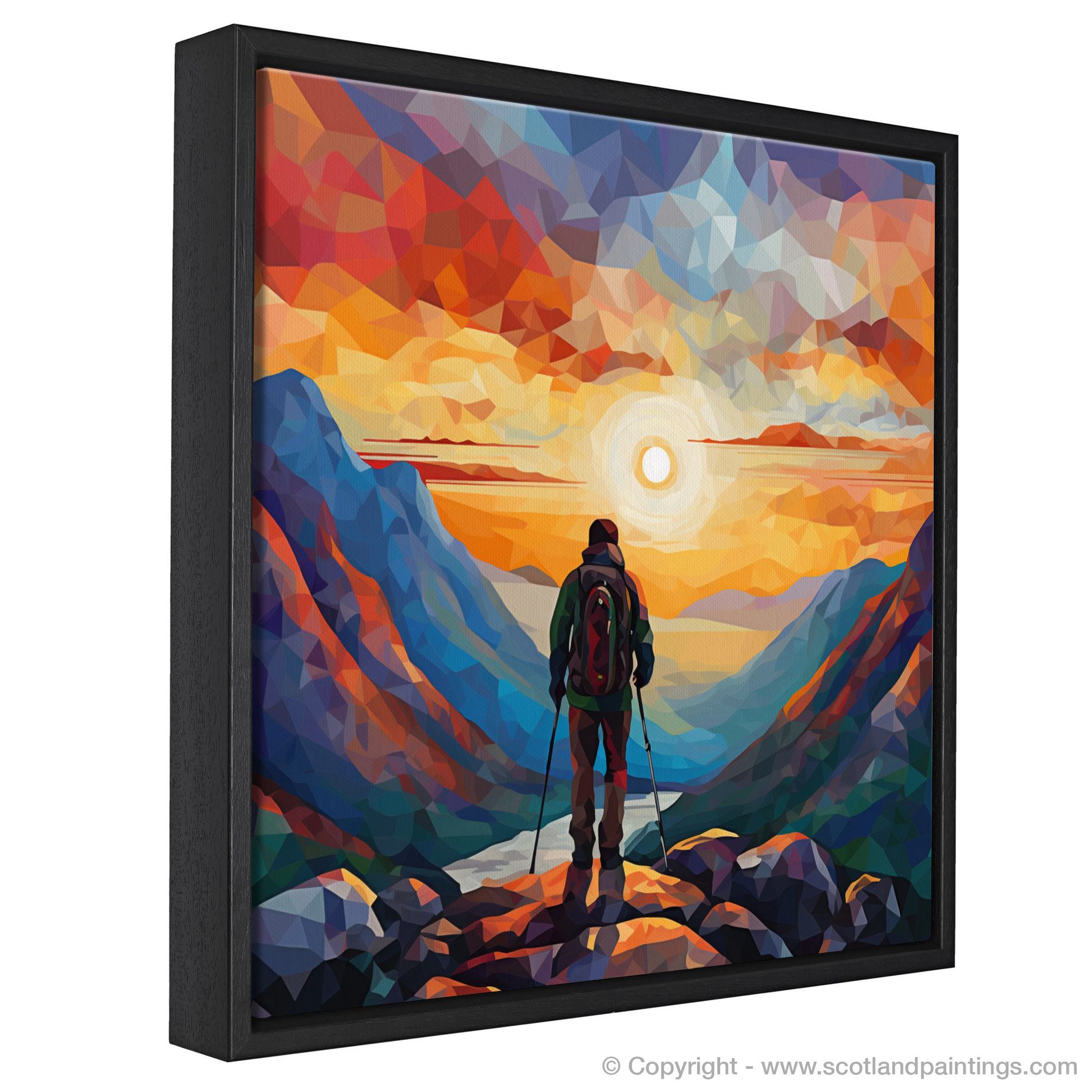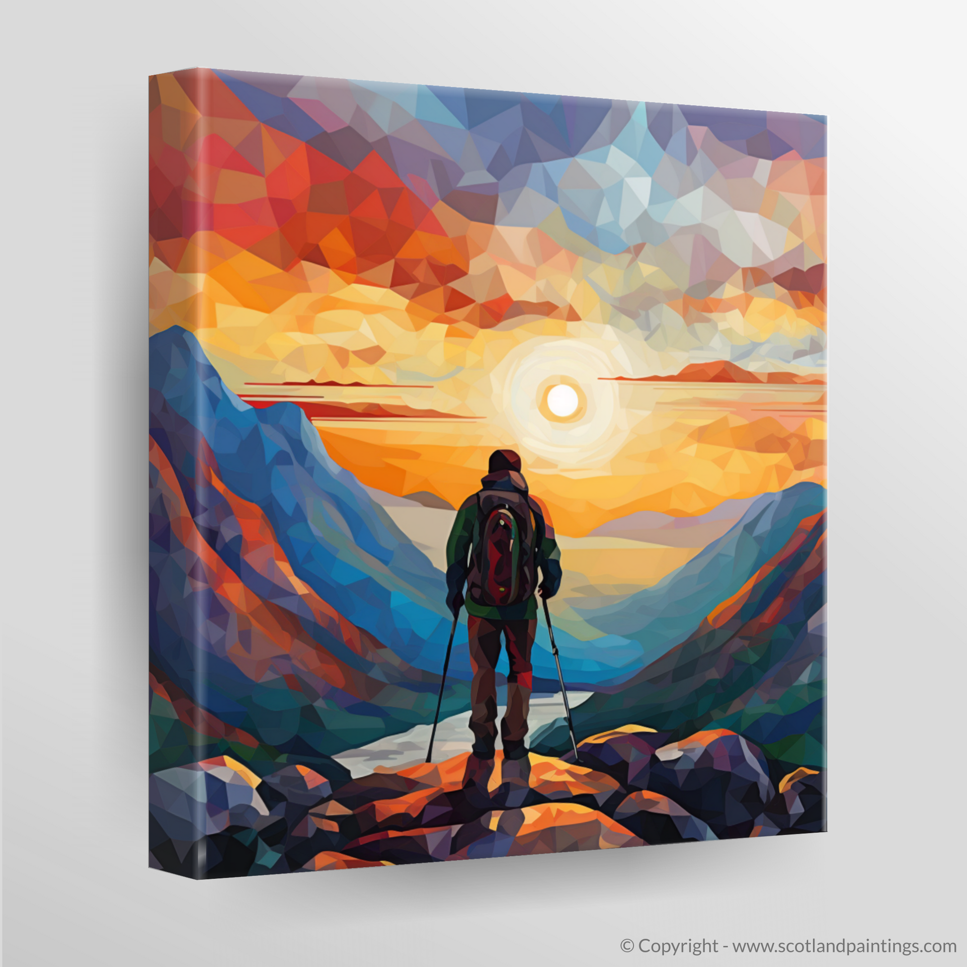 Steeped in the radiant warmth of a setting sun, this cubist-inspired print evokes a sense of adventure and contemplation. A solitary hiker, outlined against the dusky sky, stands poised on a precipice, gazing into the vastness of the Glencoe valley. The silhouette is abstracted; edges and curves break into bold, geometric shapes, suggesting both movement and stillness.