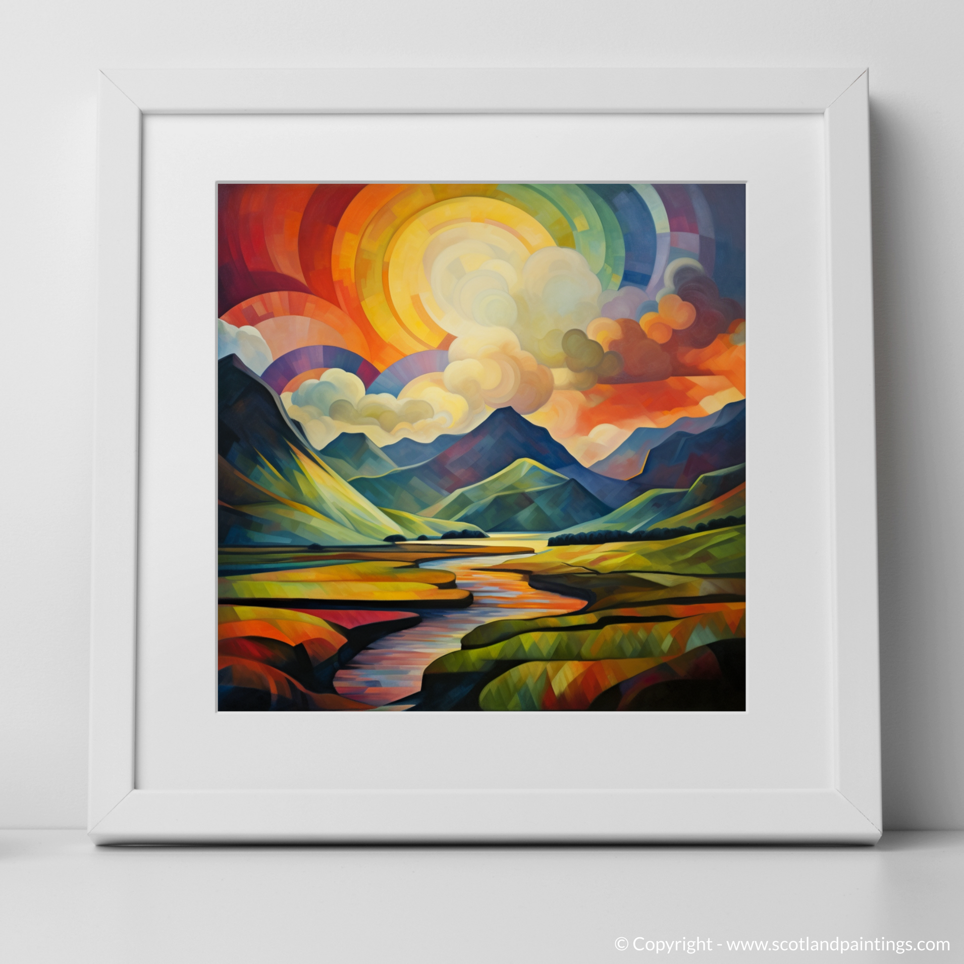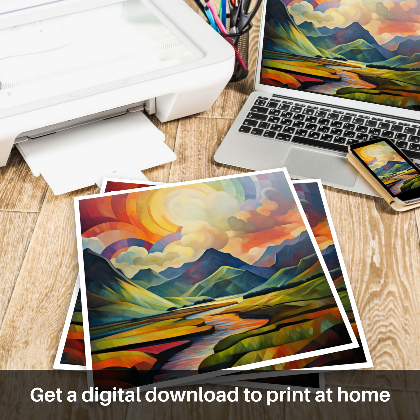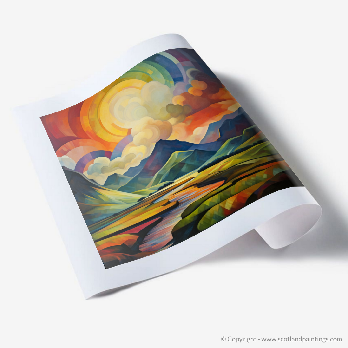 Immerse yourself in the abstract charm of a landscape transformed by cubist inspiration with this striking print. The lush valleys and rugged peaks of Glencoe come to life in a vivid tableau of geometric splendour, engaging the eye with powerful facets and invigorating angles. The foreground features flowing ribbons of terrain, each parcel of land a kaleidoscope of greens, oranges, and yellows, suggesting rich, undulating fields catching the light at different angles.