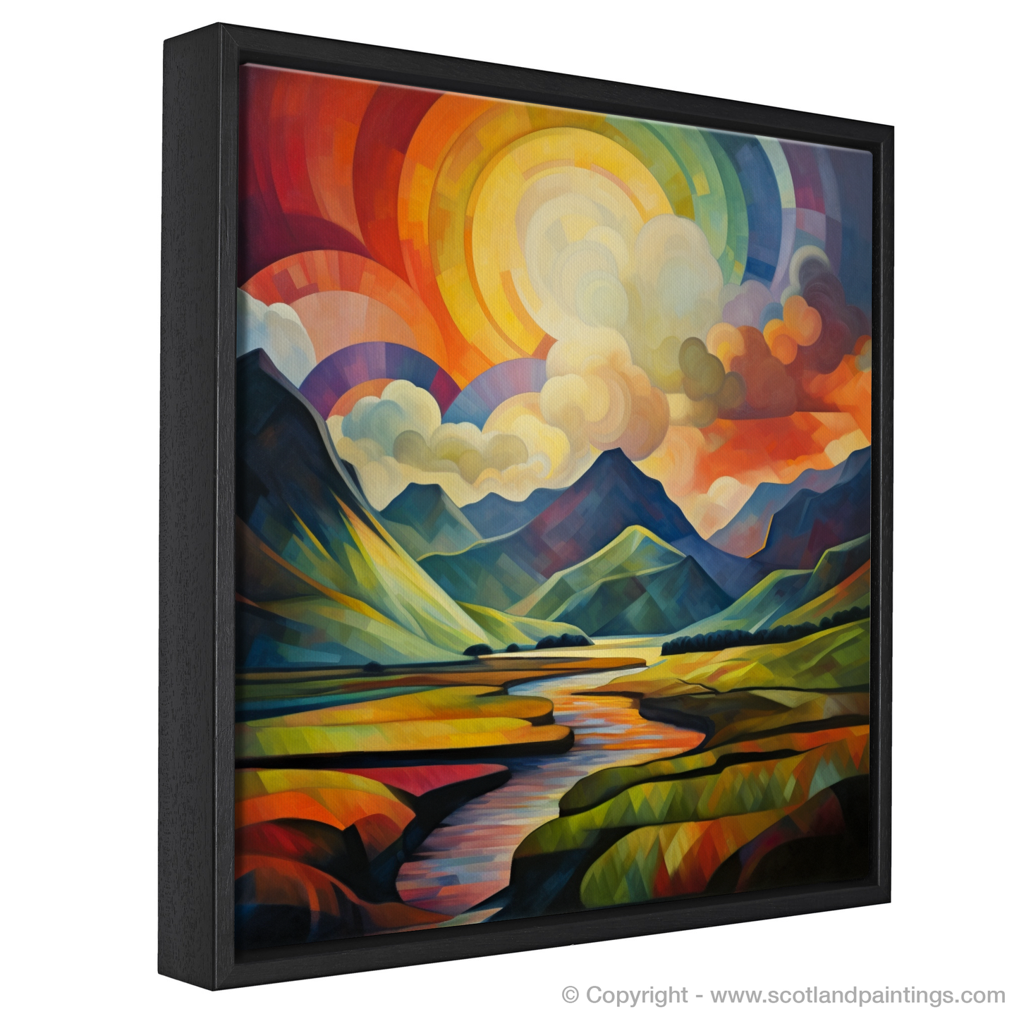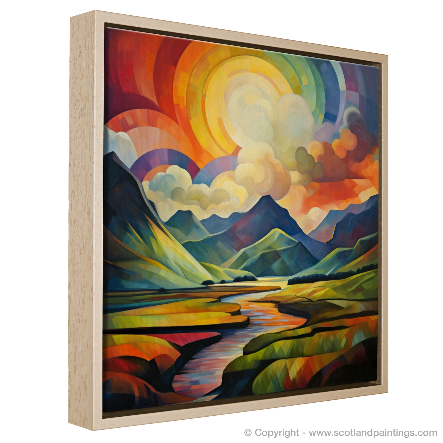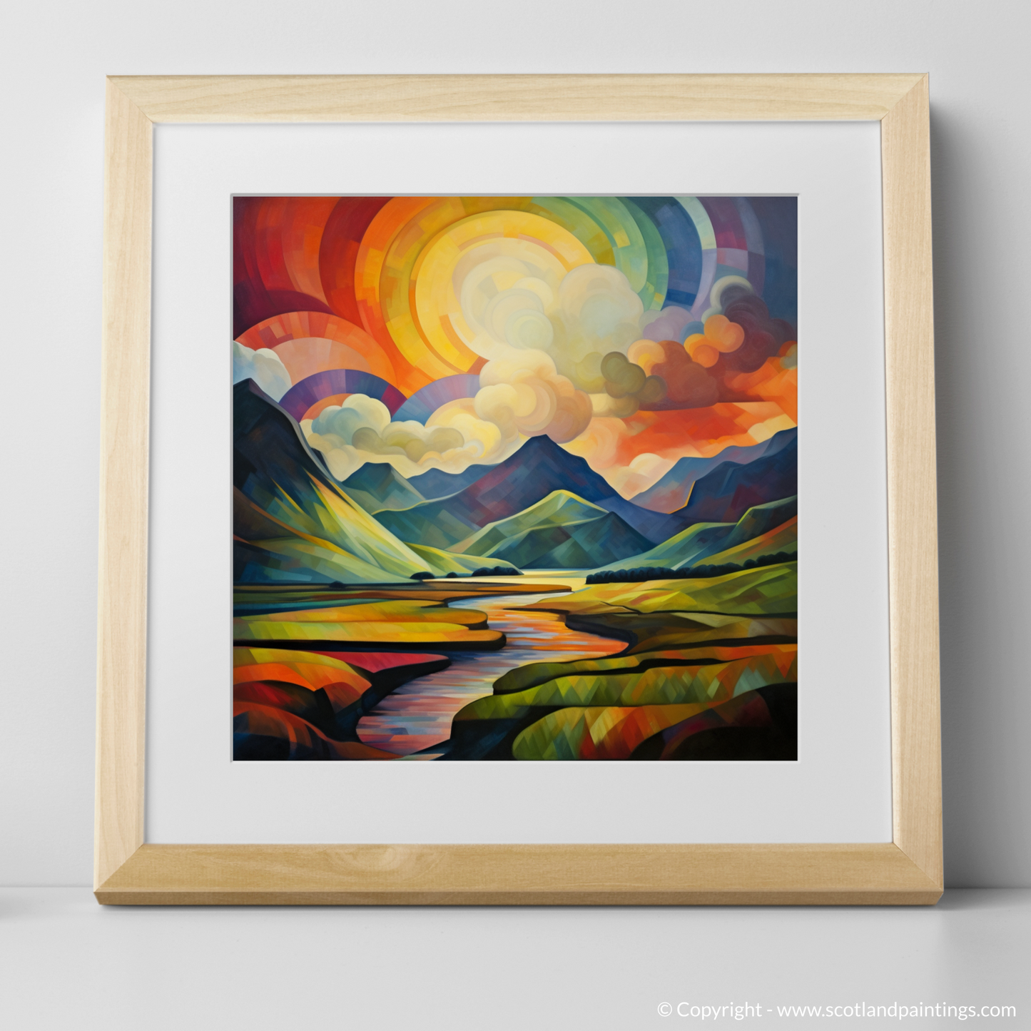 Immerse yourself in the abstract charm of a landscape transformed by cubist inspiration with this striking print. The lush valleys and rugged peaks of Glencoe come to life in a vivid tableau of geometric splendour, engaging the eye with powerful facets and invigorating angles. The foreground features flowing ribbons of terrain, each parcel of land a kaleidoscope of greens, oranges, and yellows, suggesting rich, undulating fields catching the light at different angles.