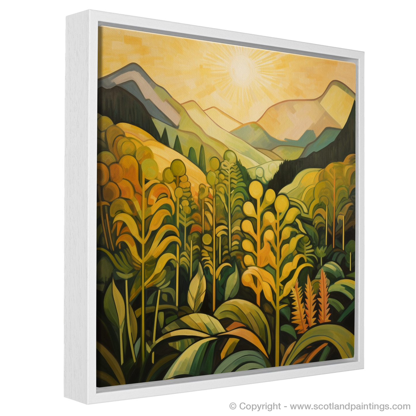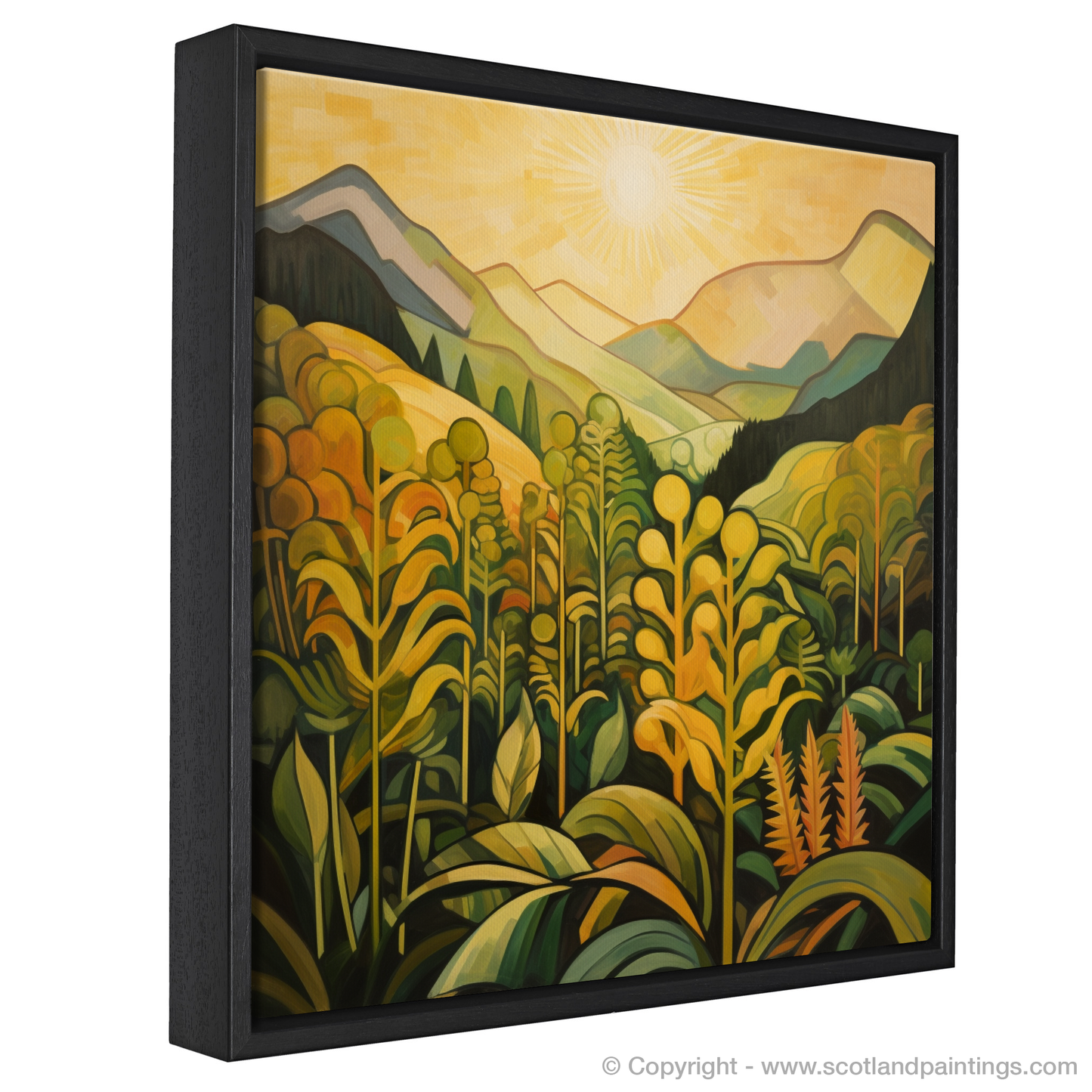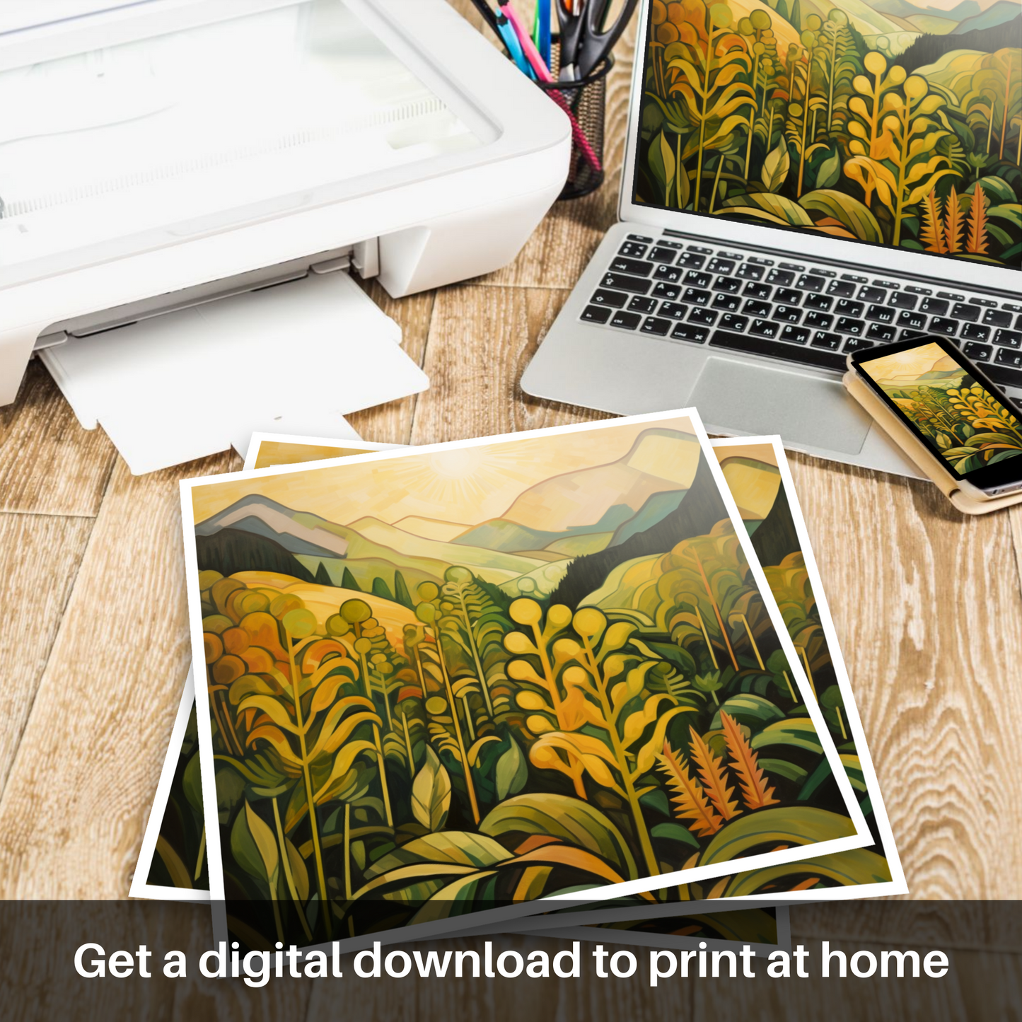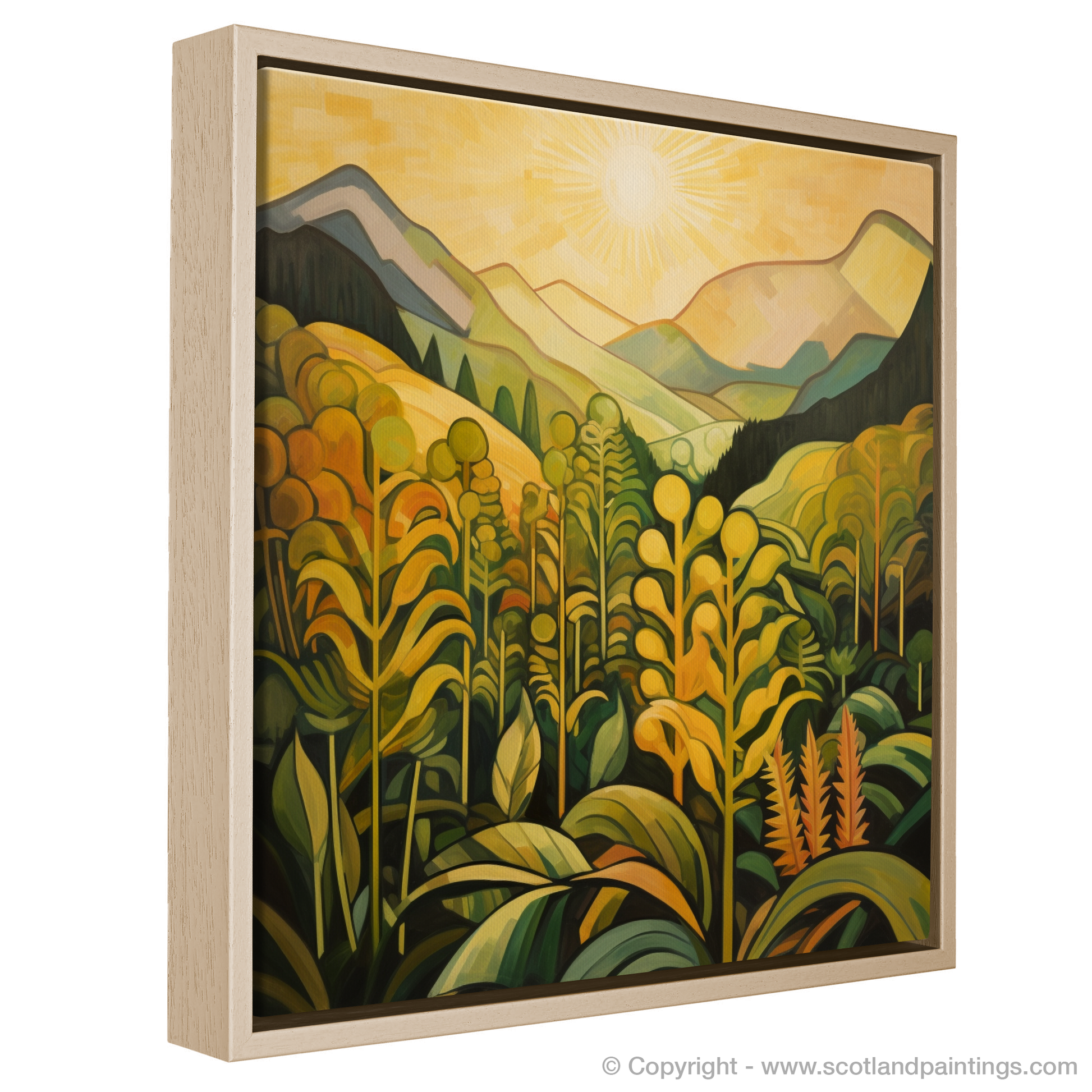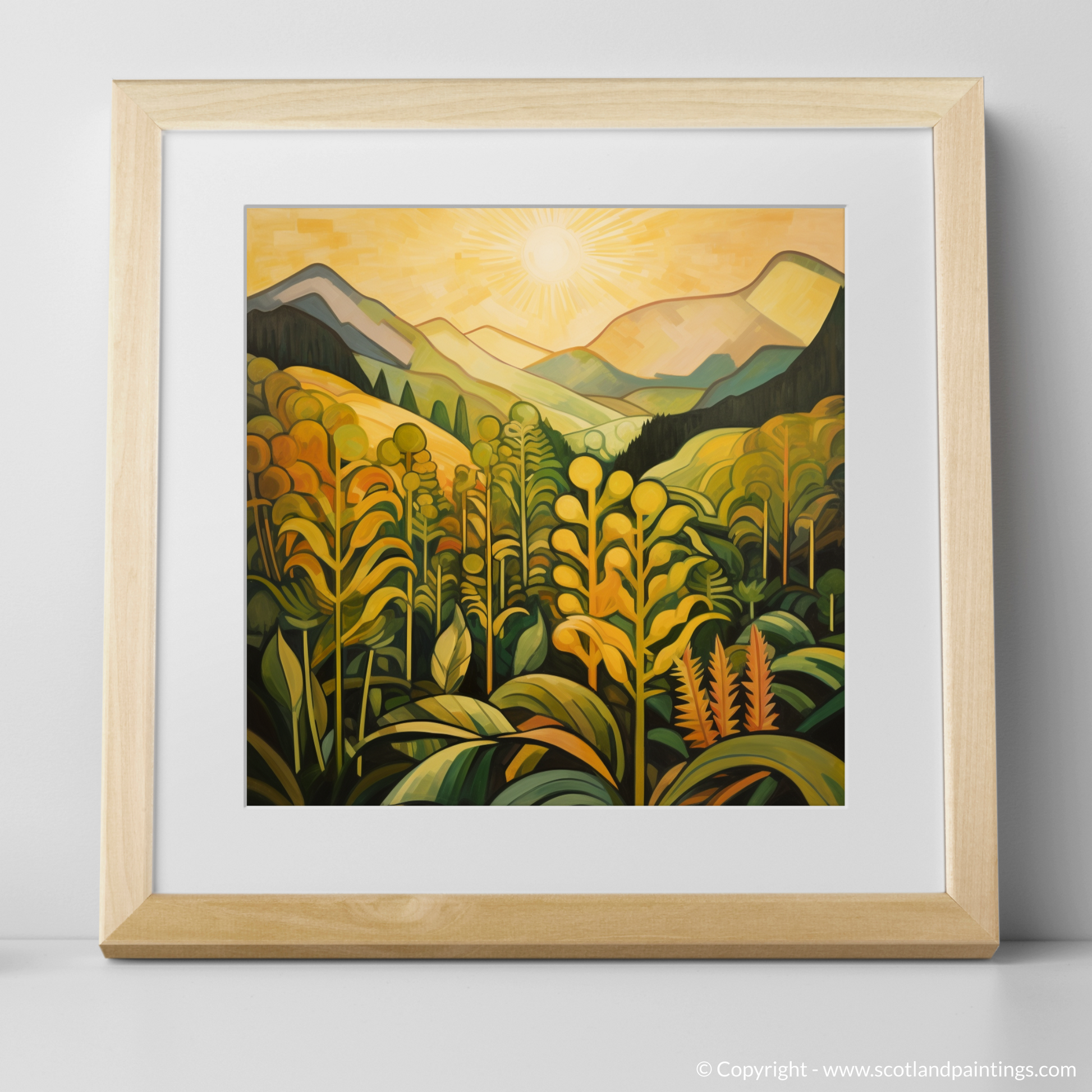 Angular contours breathe cubist life into this idyllic vista, where the verdant hues of ferns and foliage bask in the glow of the setting sun. The interlocking shapes create a rhythmic mosaic that evokes the serene pulse of the Scottish wilds, while whispers of gold and amber reflect the fleeting brilliance of day's end.