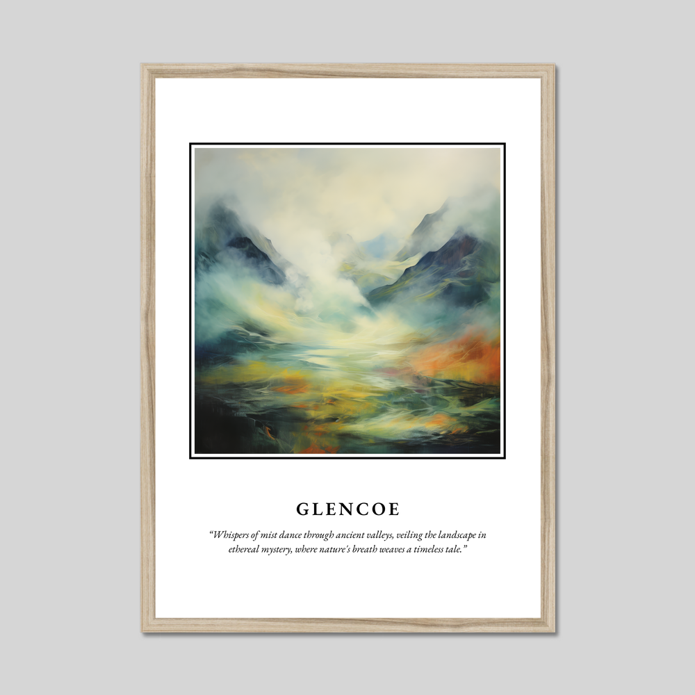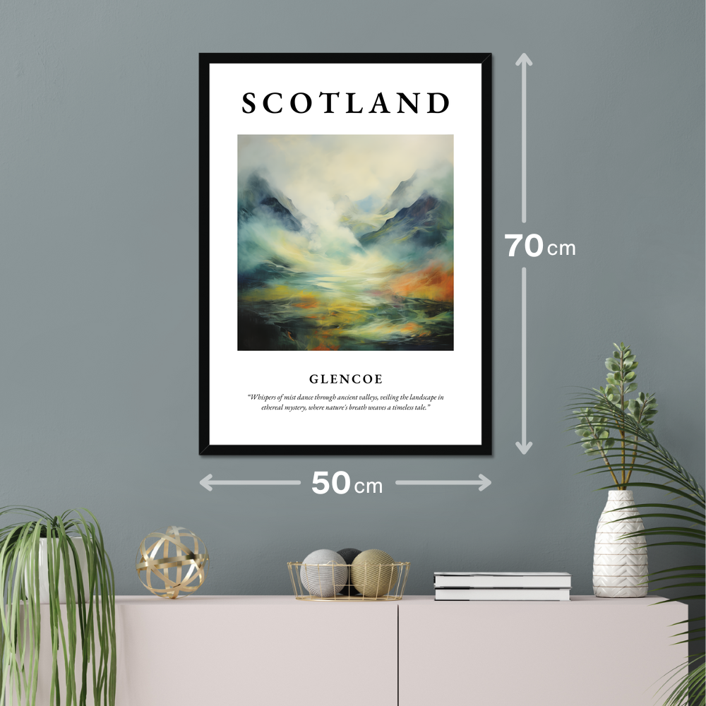 Measuring an impressive 50cm x 70cm, this large poster effortlessly transforms any wall into a window to the wild, rugged beauty of the Highlands. The painting's abstract forms and intersecting planes depict Glencoe's valleys amidst swirling mist, splashed with earth tones contrasted against a vibrant backdrop. Below the artwork, a poetic quote whispers of the valley's mystique, inviting the viewer to lose themselves in the landscape's ethereal story.