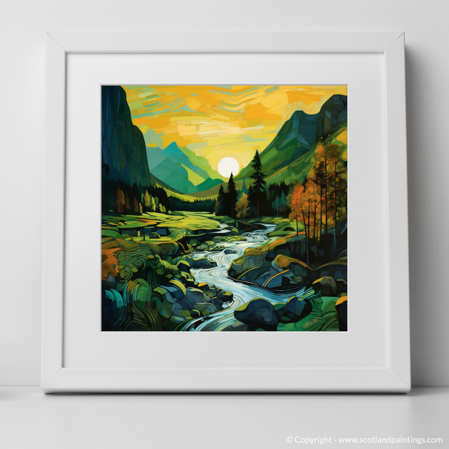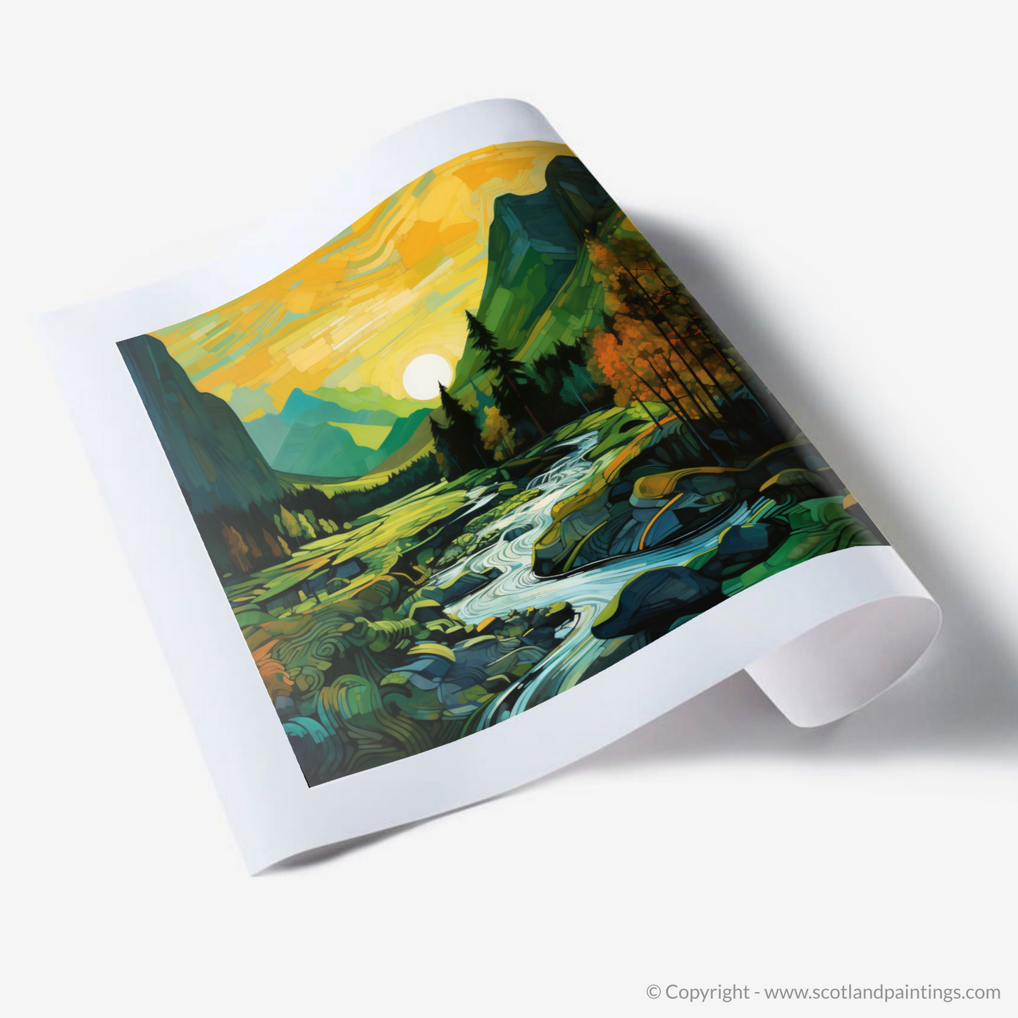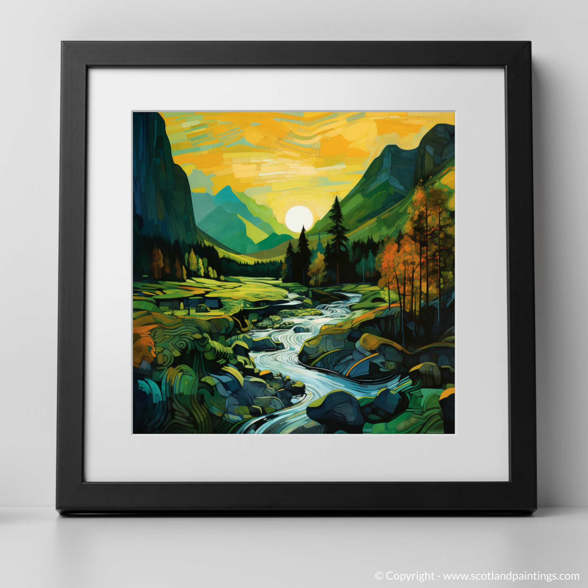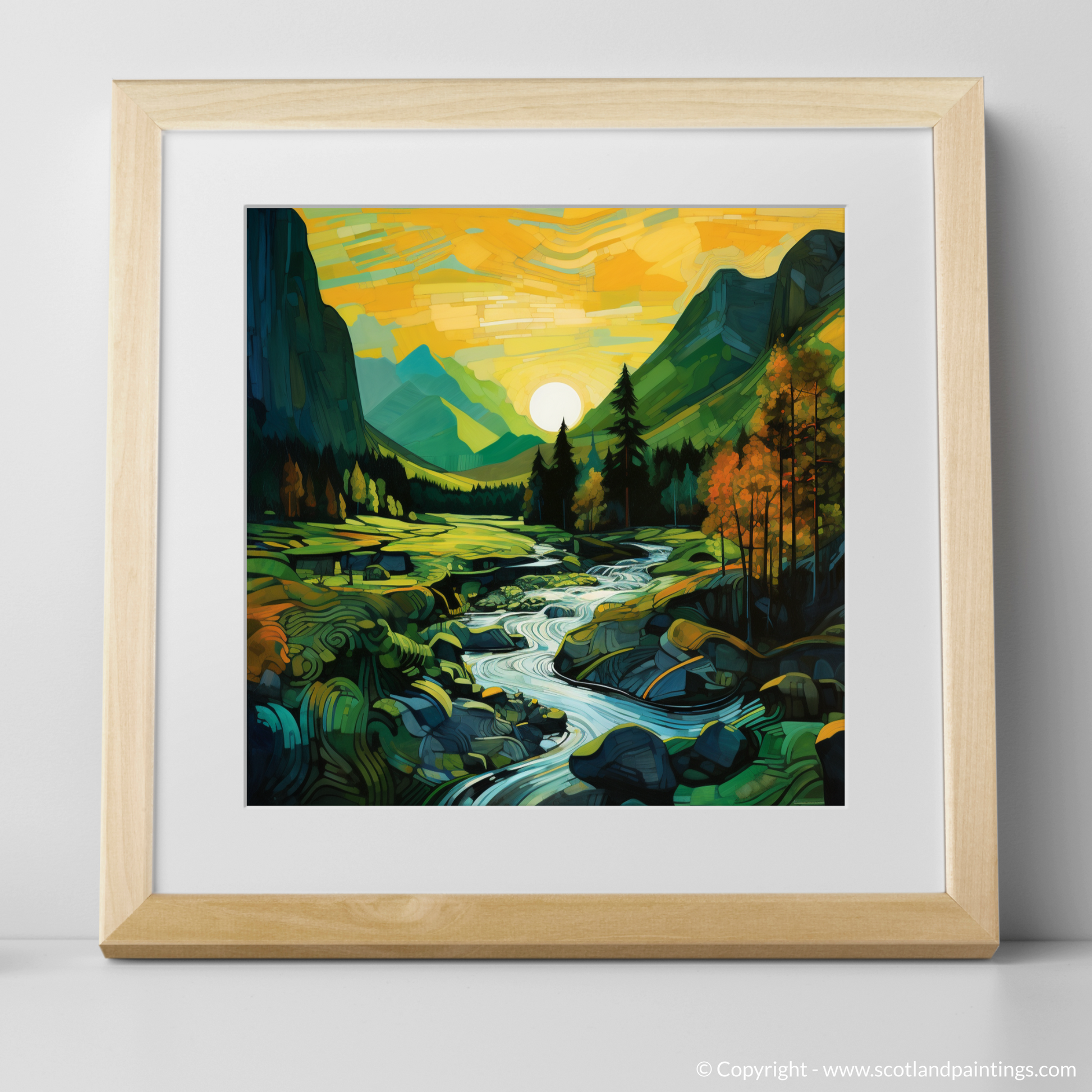 Embark on a visual journey to the enchanting Scottish Highlands with this captivating print. Inspired by the mesmerising glen at sunset in Glencoe, the piece echoes the unique beauty of the landscape in an abstract form that pays homage to the Cubist movement. The interplay of geometric shapes and vibrant colours crafts a striking tapestry that reimagines the undulating hills, serene streams, and lush foliage.