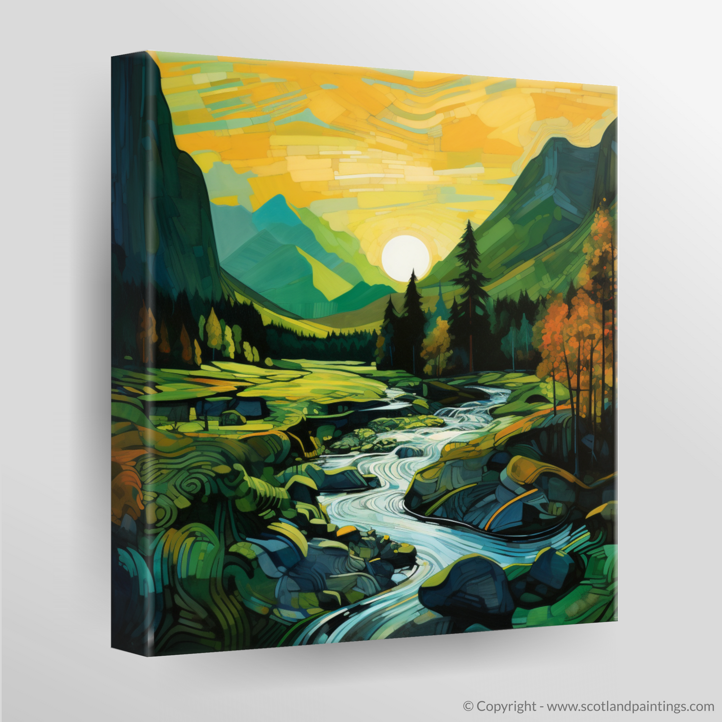 As the central celestial orb dips towards the horizon, it casts a symphony of warm yellows and oranges across the sky, mirrored by the cool greens and blues of the land below. This fusion of colour is a testament to the dynamic end of day light, inviting the viewer's eye to dance across the composition. The fragmented views of nature, characteristic of the Cubist style, here transform the familiar contours of Glencoe into an intriguing kaleidoscope of form and hue.