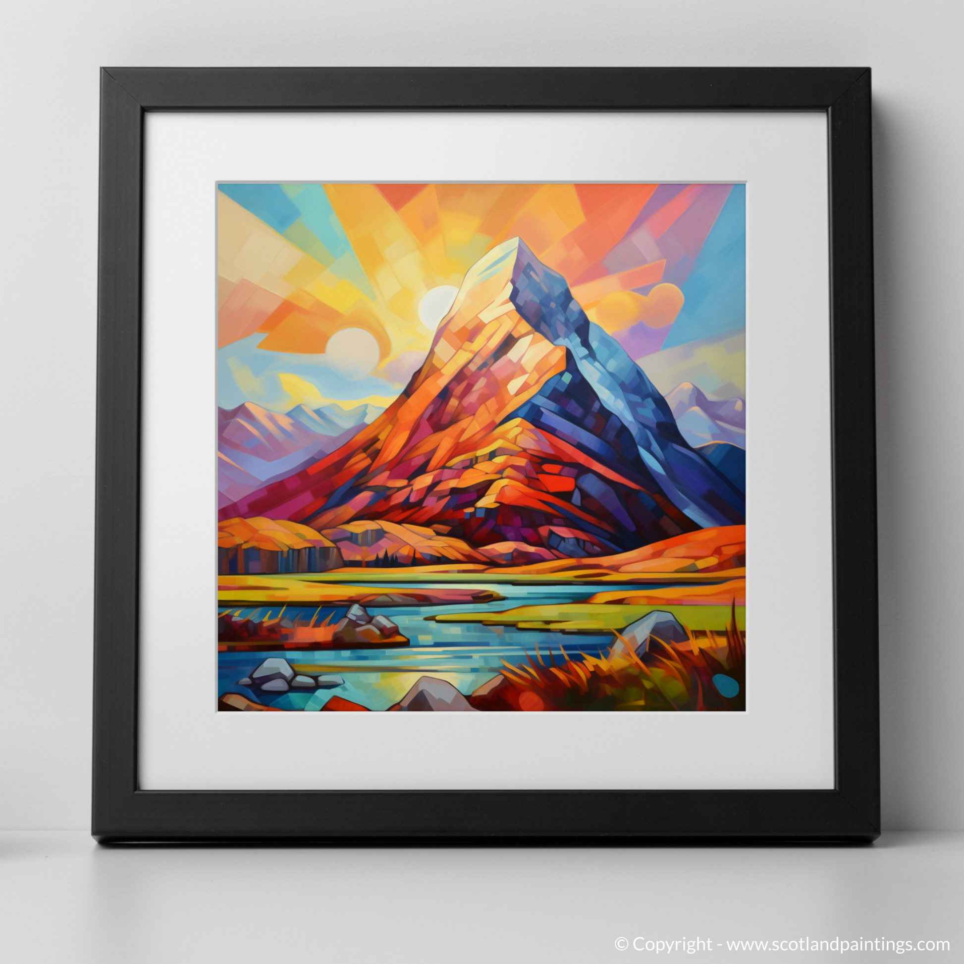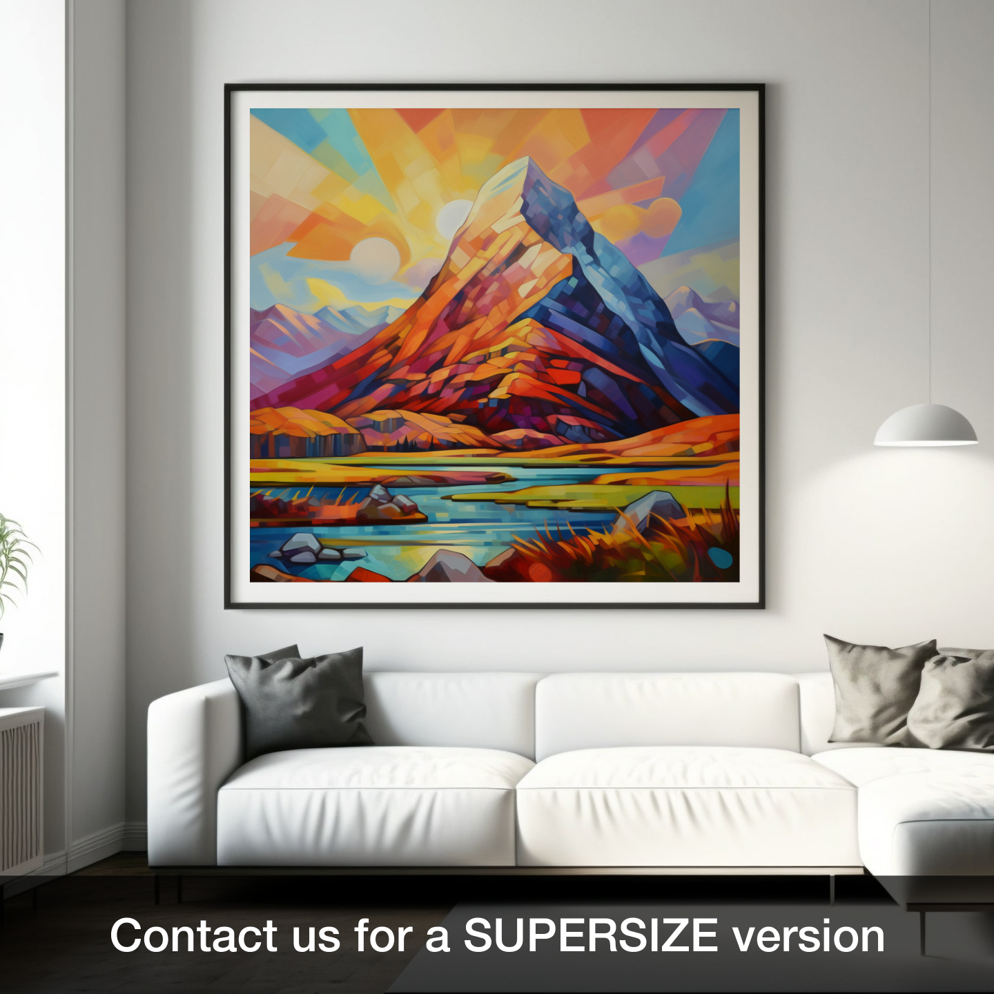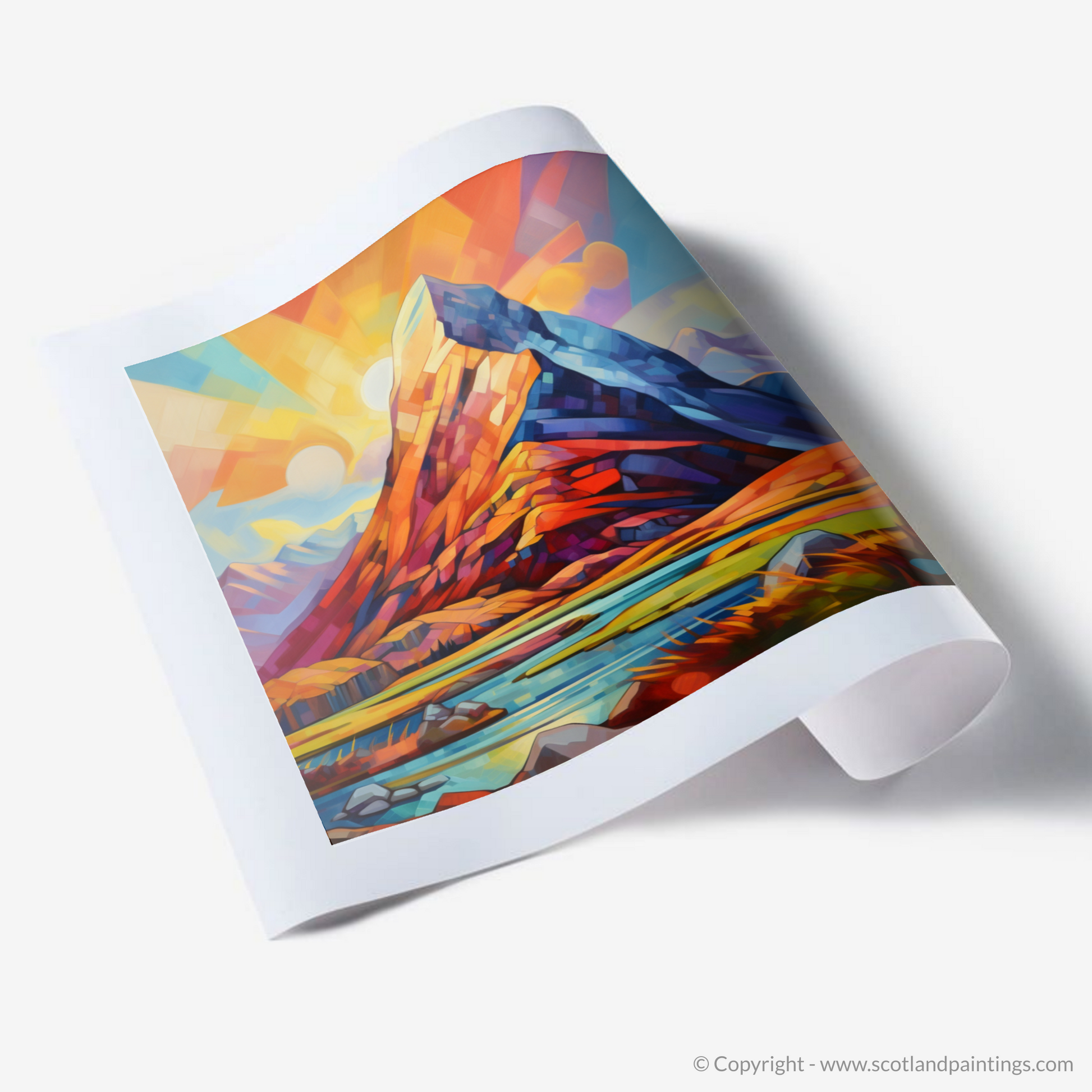 Bathe your space in the warm, mesmerising light of a highland sunset with this captivating cubist print, echoing the magical hour when day transforms into night. This print refracts the beauty of Buachaille Etive Mòr, a true Scottish wonder, through the prismatic lens of Cubism, imbuing it with an array of vibrant geometric shapes that altogether create an abstract landscape alive with motion.