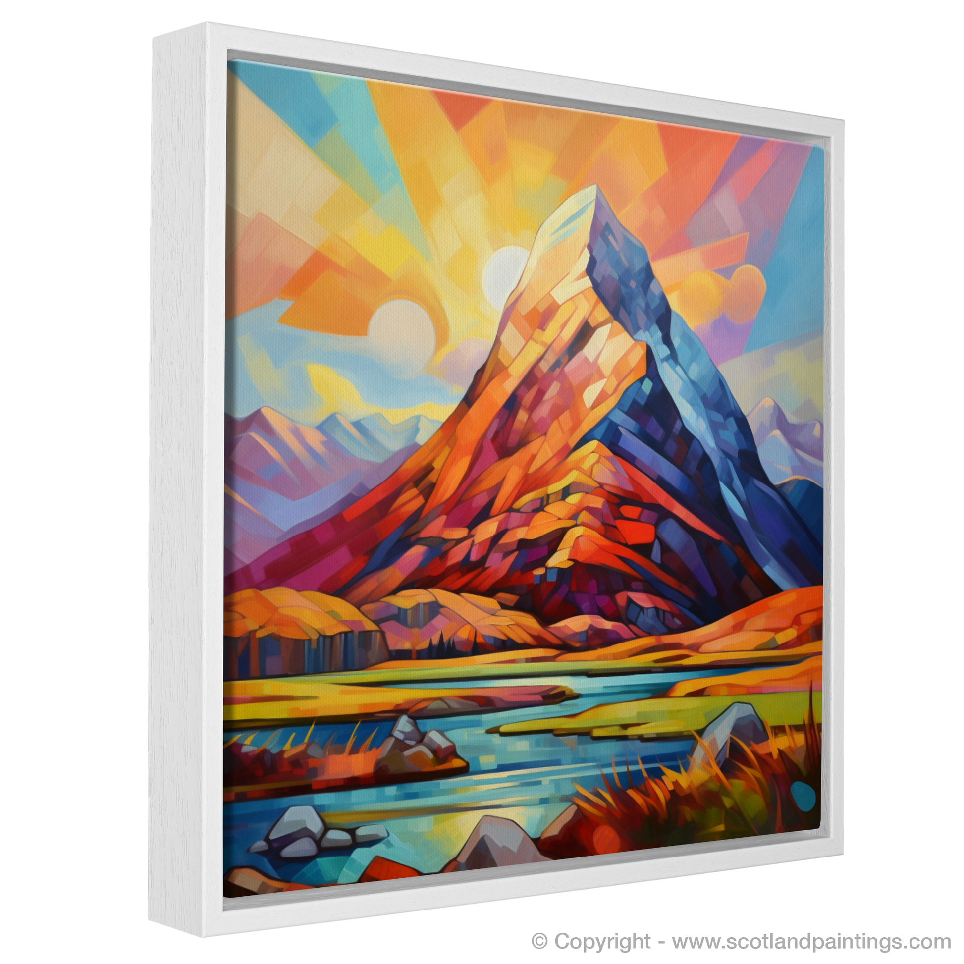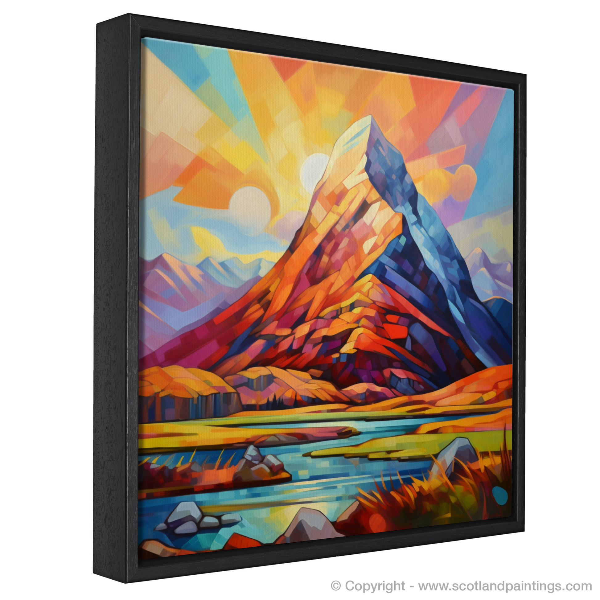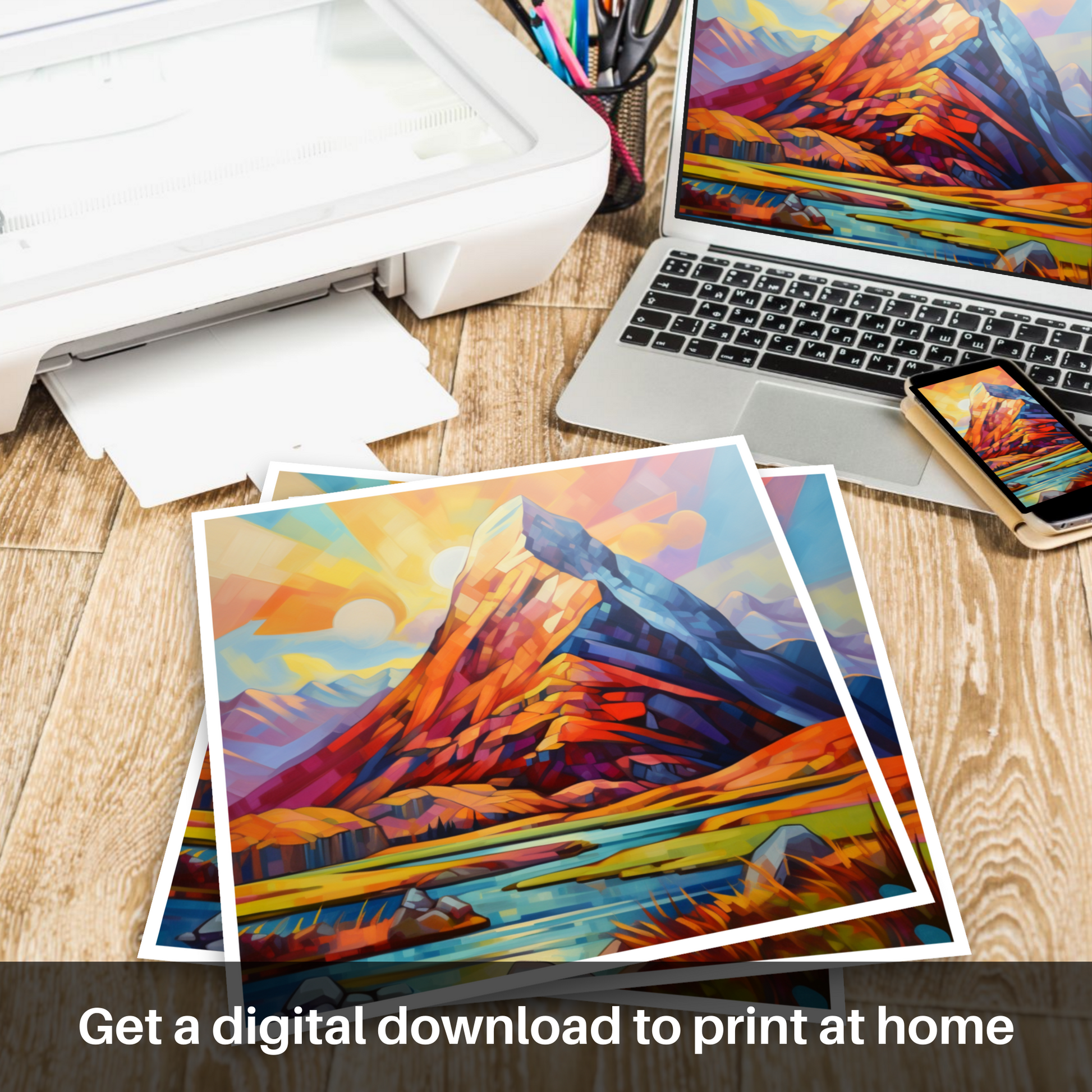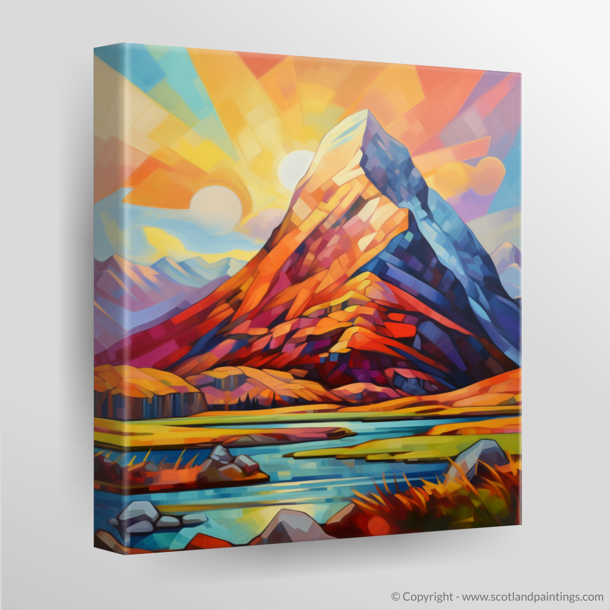 Bathe your space in the warm, mesmerising light of a highland sunset with this captivating cubist print, echoing the magical hour when day transforms into night. This print refracts the beauty of Buachaille Etive Mòr, a true Scottish wonder, through the prismatic lens of Cubism, imbuing it with an array of vibrant geometric shapes that altogether create an abstract landscape alive with motion.